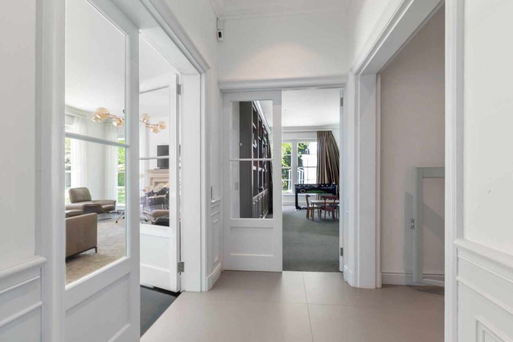 Set in one of Constantia’s most prestigious avenues, this contemporary Georgian residence combines timeless elegance with modern functionality. A tranquil courtyard fountain greets you at the entrance, leading into a home defined by high ceilings, engineered wooden floors, sash windows, and French doors.