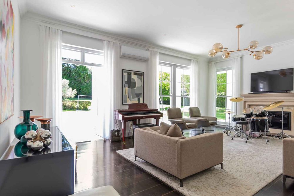 Designed for guests and extended family, the two-level guest wing features its own kitchen, living area, and two bedrooms, while the upper level of the main house includes a pajama lounge, two sunny bedrooms, a family bathroom, and a third en-suite guest bedroom. The primary suite is a luxurious retreat with his-and-hers dressing rooms, a bespoke en-suite bathroom, and a private balcony.