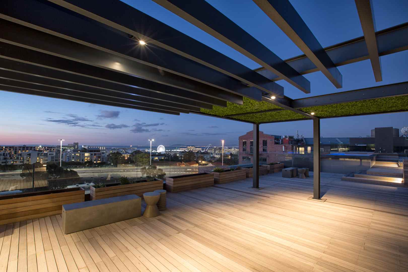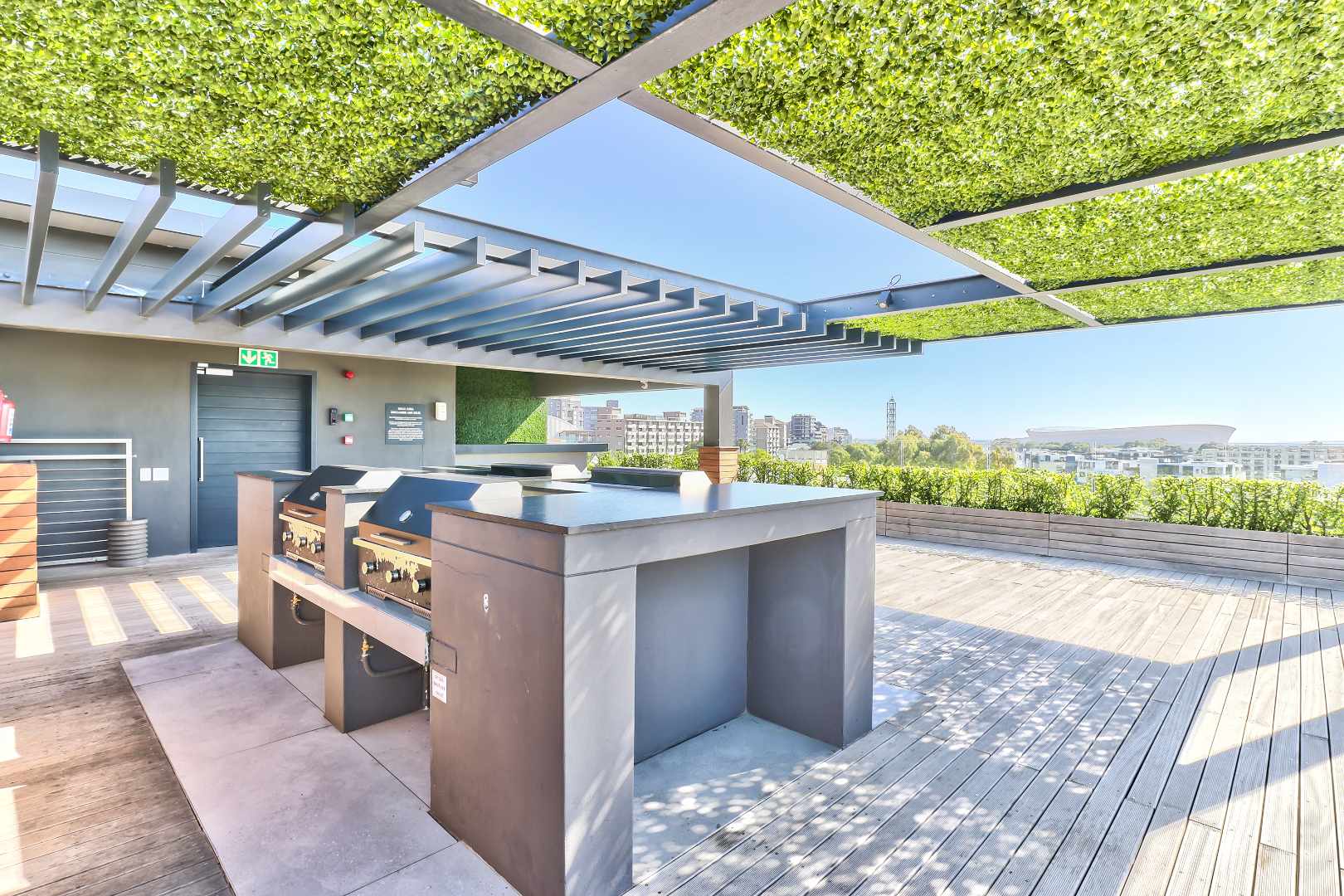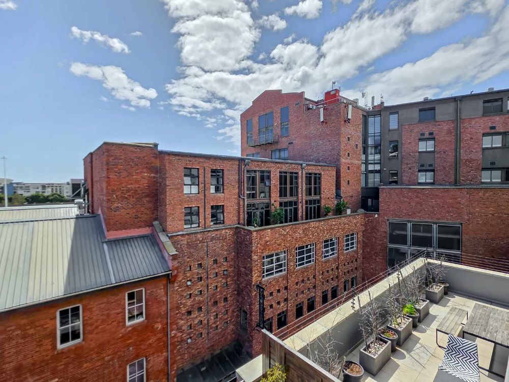 Residents enjoy access to a premium rooftop entertainment area featuring a swimming pool, braai facilities, and a private bar, all set against breathtaking 360-degree views of Table Mountain, Lion's Head, Signal Hill, and the Atlantic Ocean, a major drawcard for Airbnb guests.