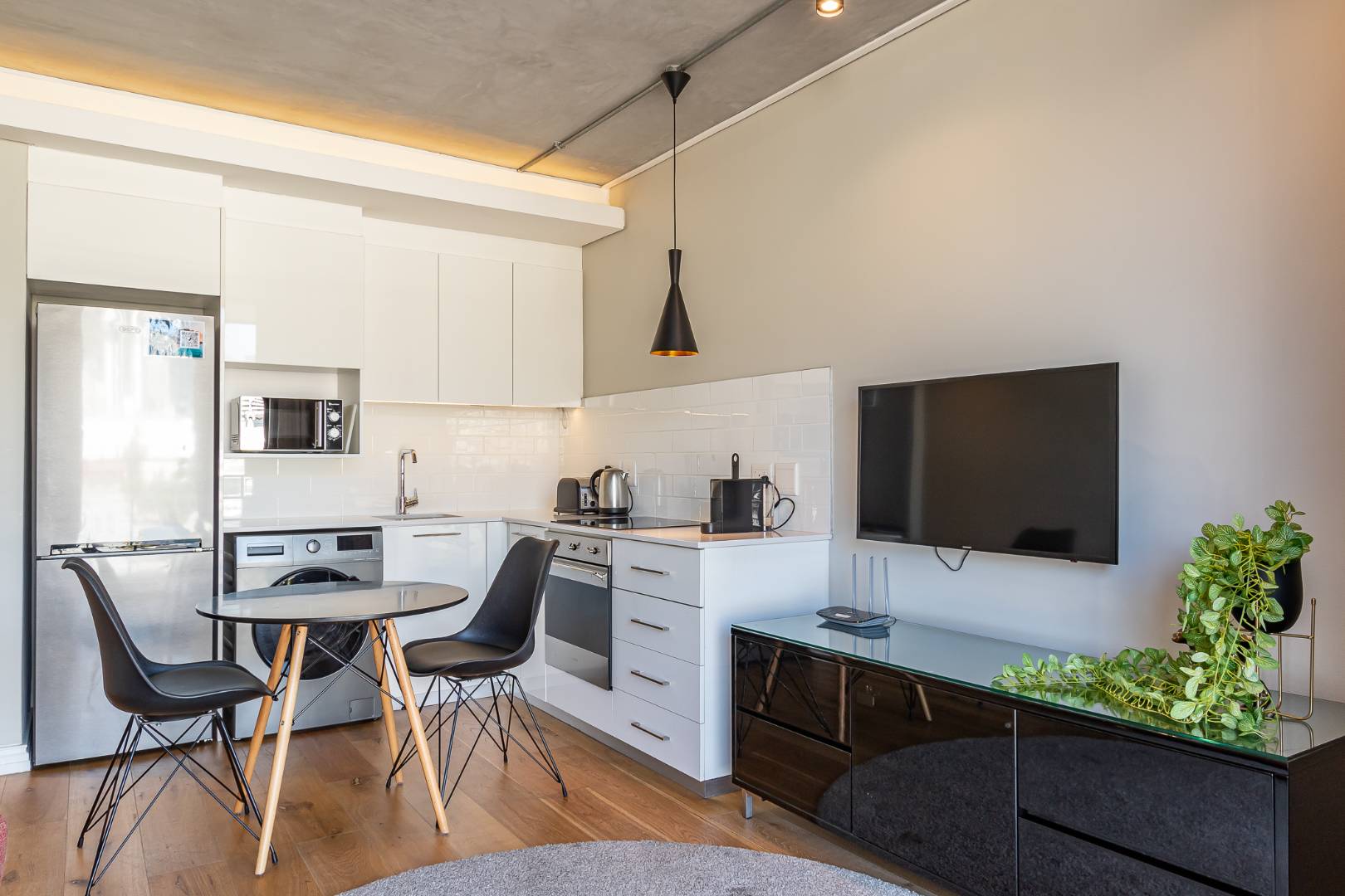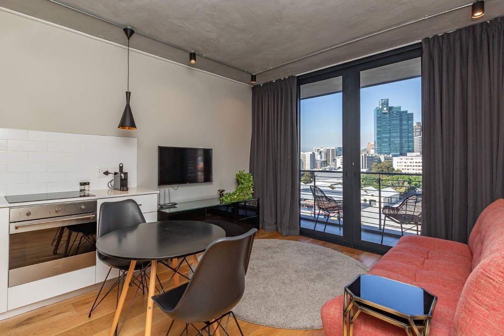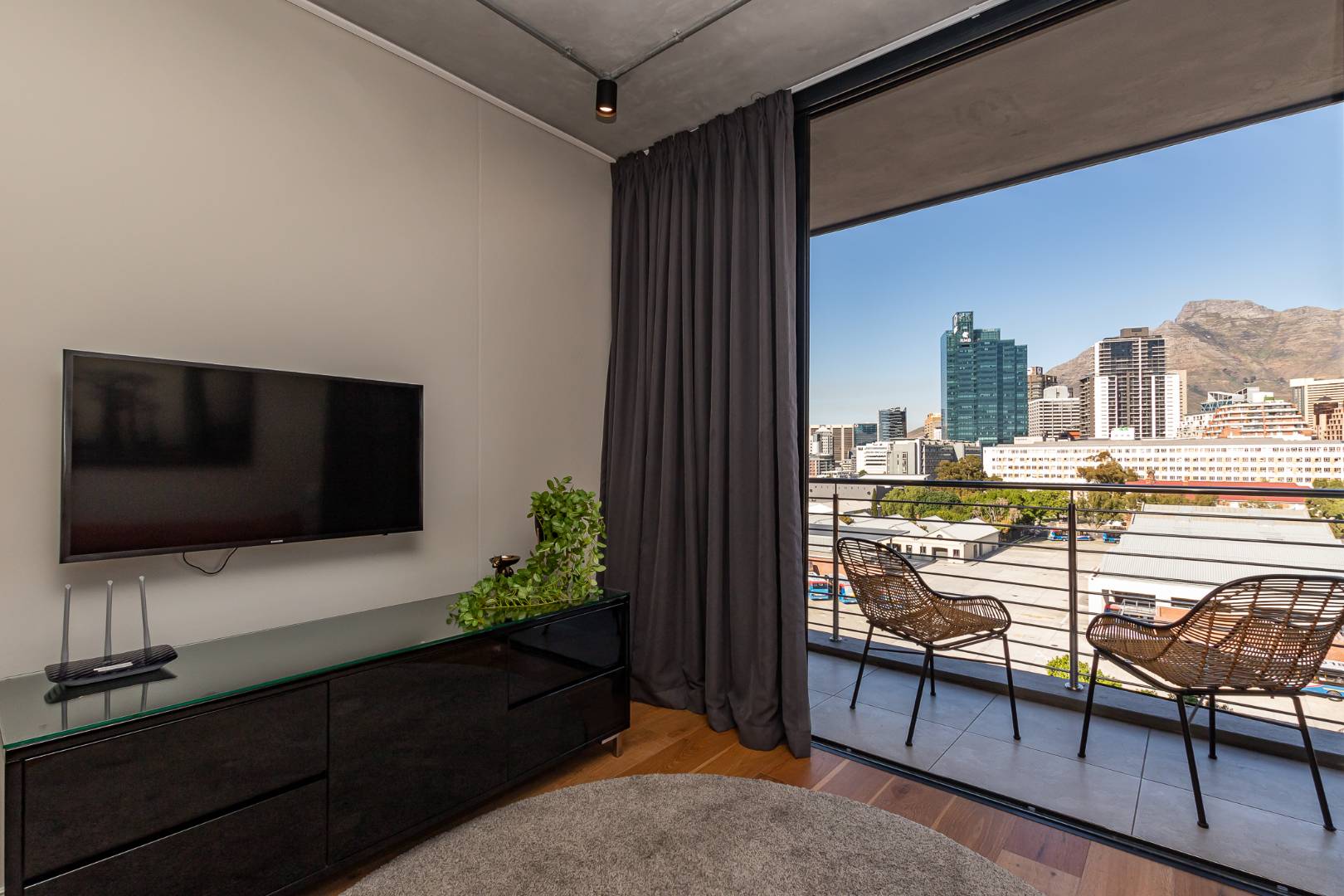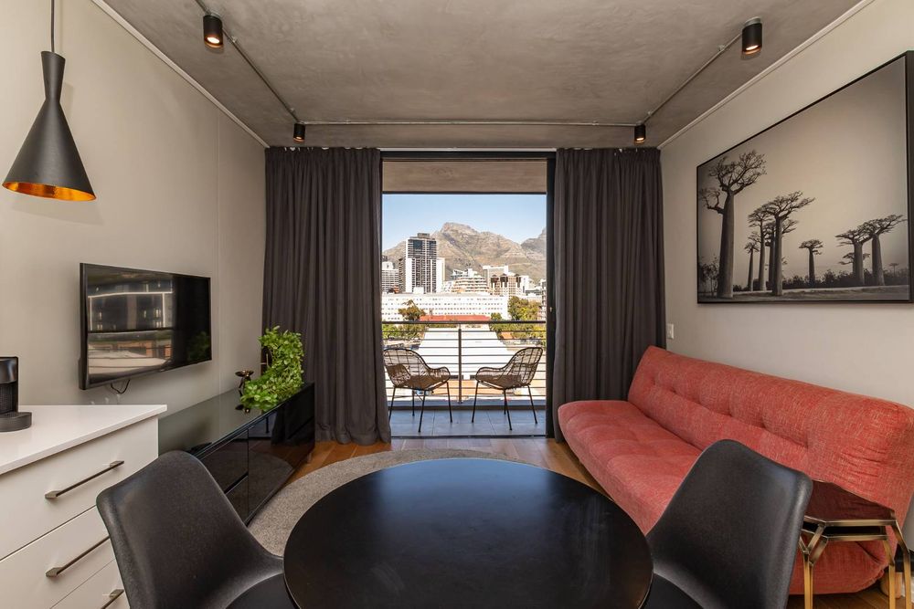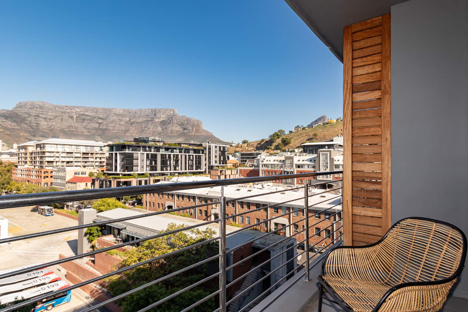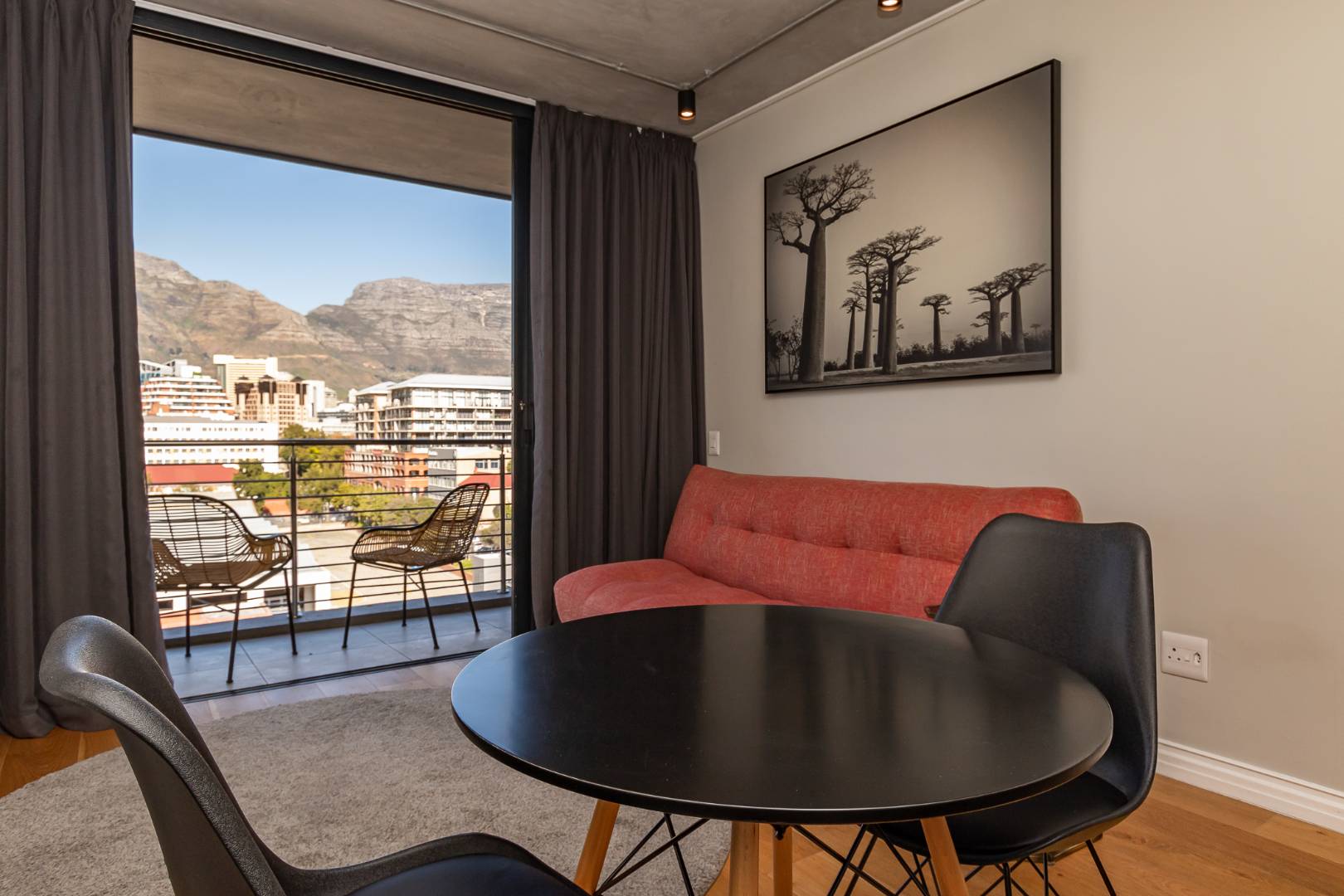 The open-plan living area flows effortlessly onto a private balcony, showcasing views of Table Mountain - ideal for morning coffee or relaxed evening sundowners.