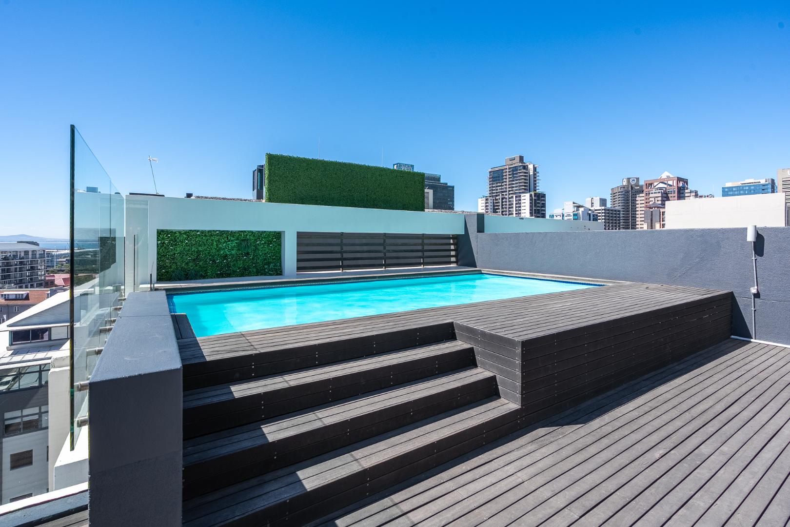 - Rooftop pool with city views.