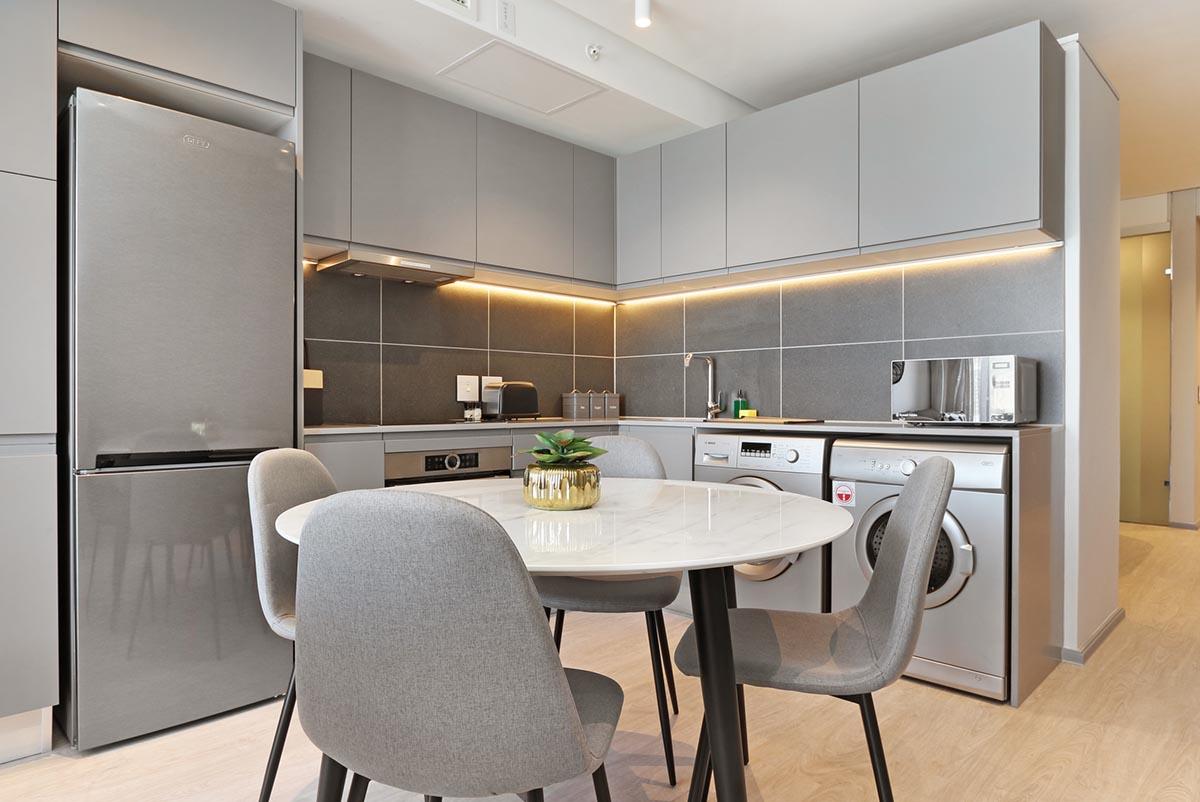 The apartment features one well-appointed bathroom and an open-plan kitchen and living area, all designed to maximize space and comfort. From the living area, you can enjoy breathtaking views of the majestic mountain, offering a serene backdrop to your daily life.