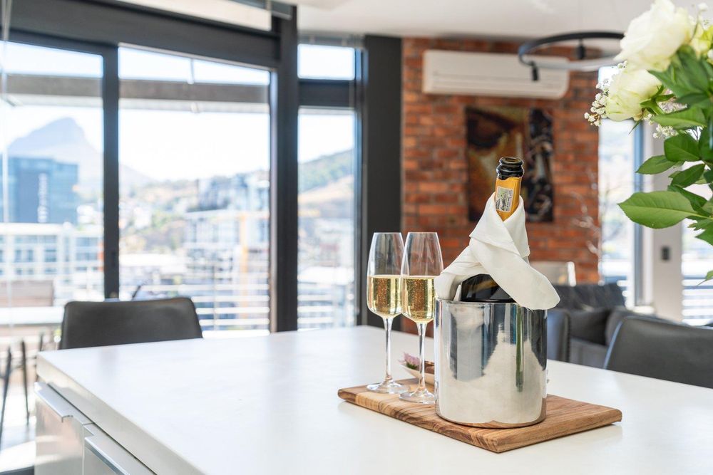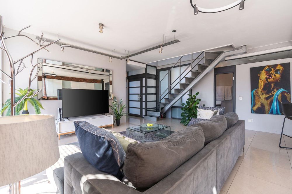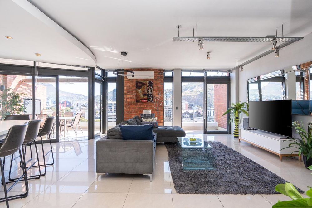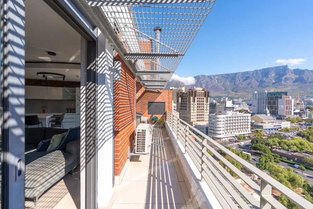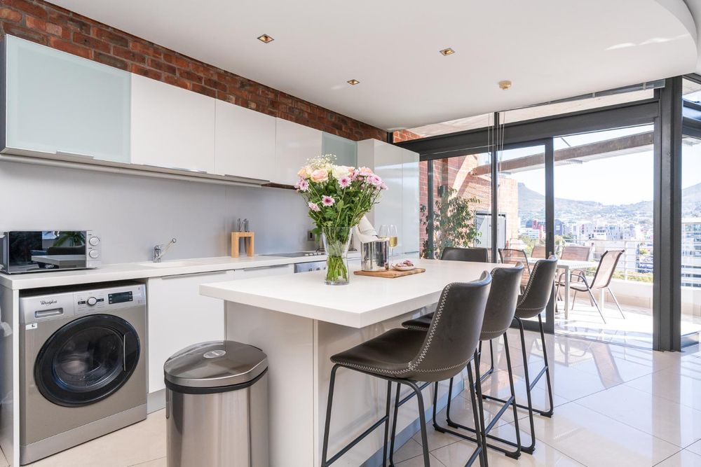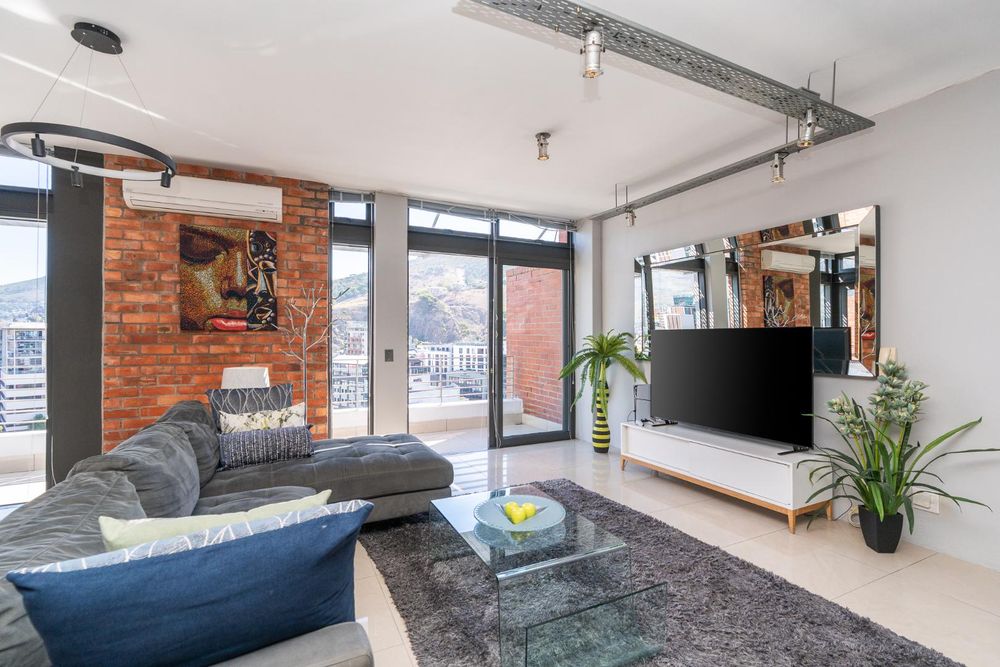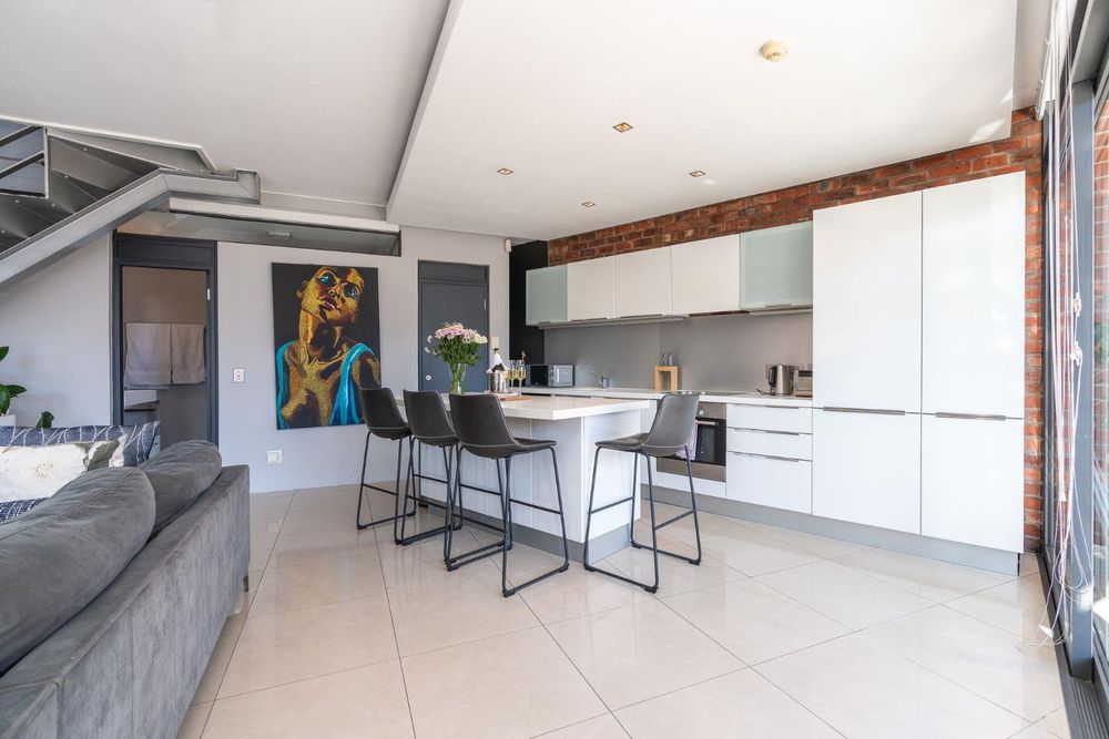 Step into the heart of the home where the open-concept kitchen, equipped with integrated appliances which includes a dishwasher and fridge, flows effortlessly into the living area. The space is highlighted by high concrete ceilings, exposed brick walls, and floor-to-ceiling double-glazed glass doors and windows, which bathe the area in natural light while showcasing breathtaking city and mountain views. The adjoining terrace features a built-in braai, perfect for entertaining. A guest bathroom with a shower is also conveniently located on this level.