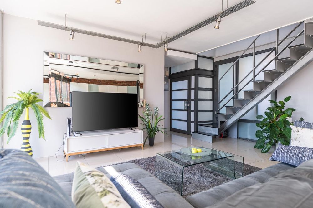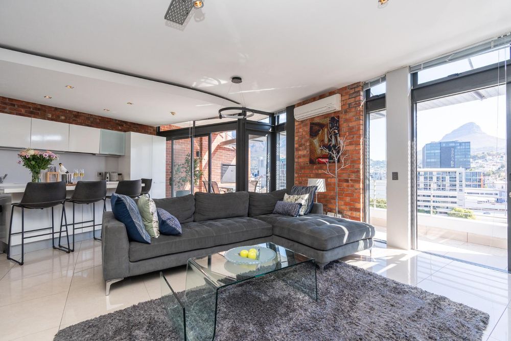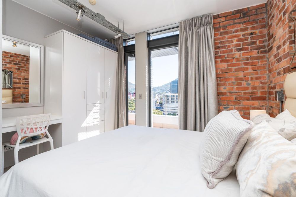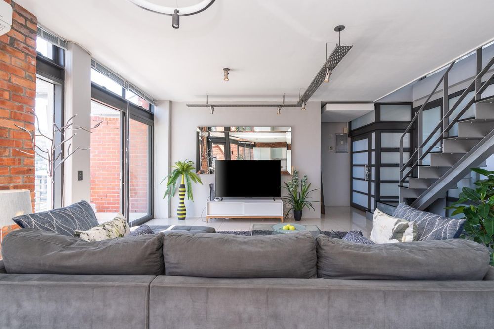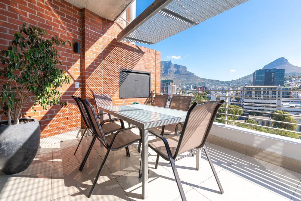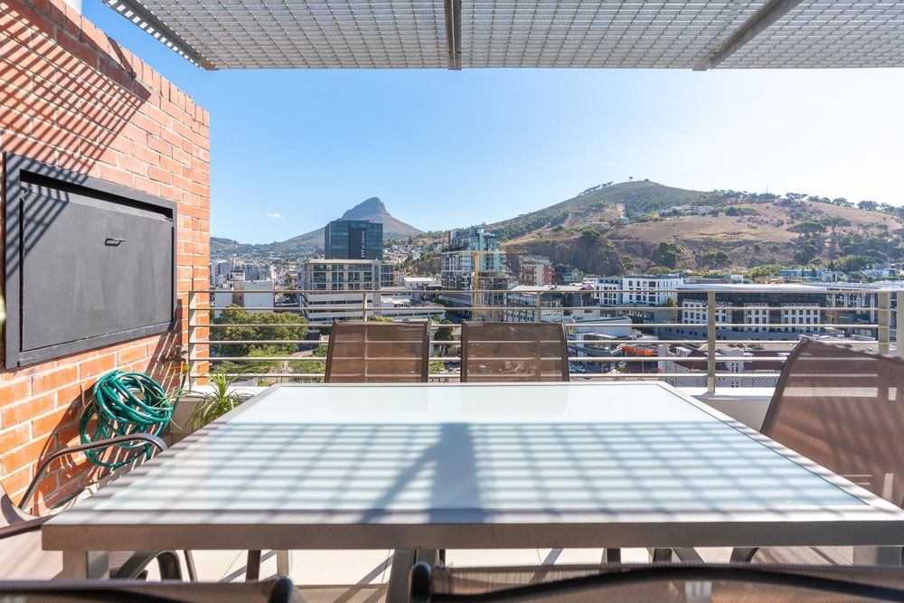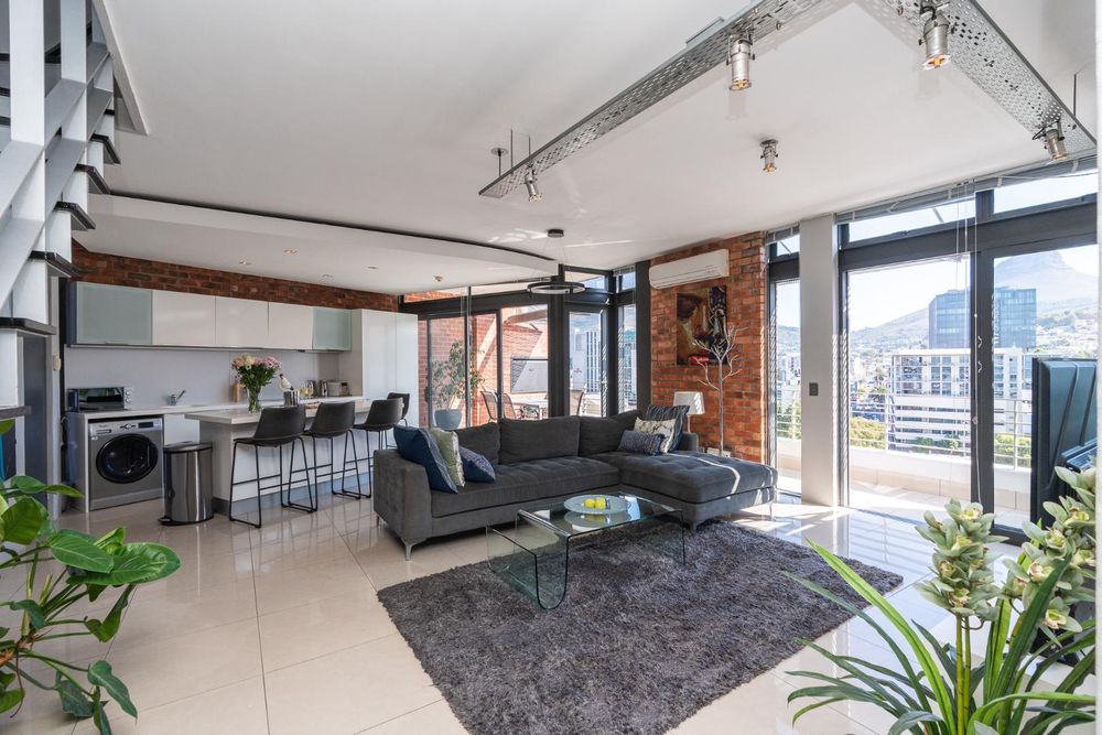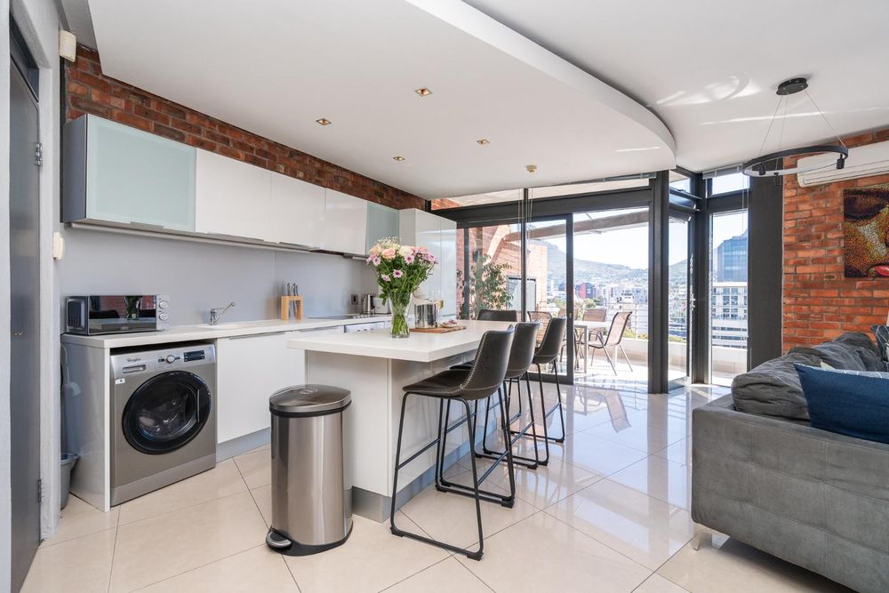 Step into the heart of the home where the open-concept kitchen, equipped with integrated appliances which includes a dishwasher and fridge, flows effortlessly into the living area. The space is highlighted by high concrete ceilings, exposed brick walls, and floor-to-ceiling double-glazed glass doors and windows, which bathe the area in natural light while showcasing breathtaking city and mountain views. The adjoining terrace features a built-in braai, perfect for entertaining. A guest bathroom with a shower is also conveniently located on this level.