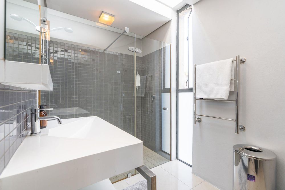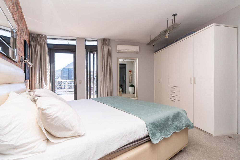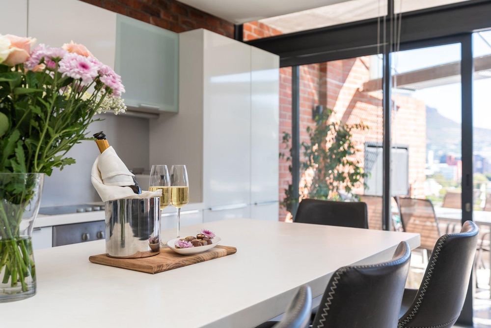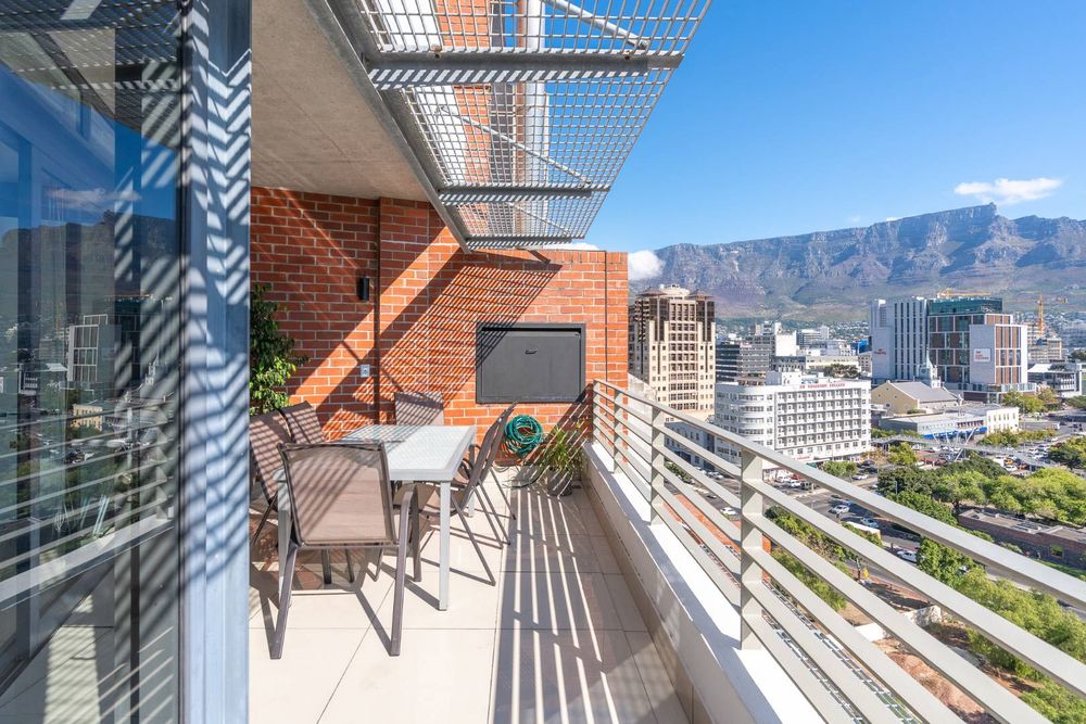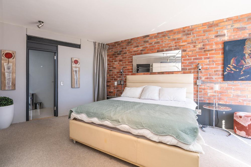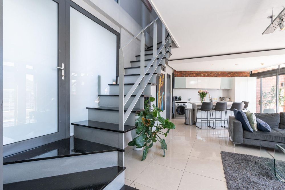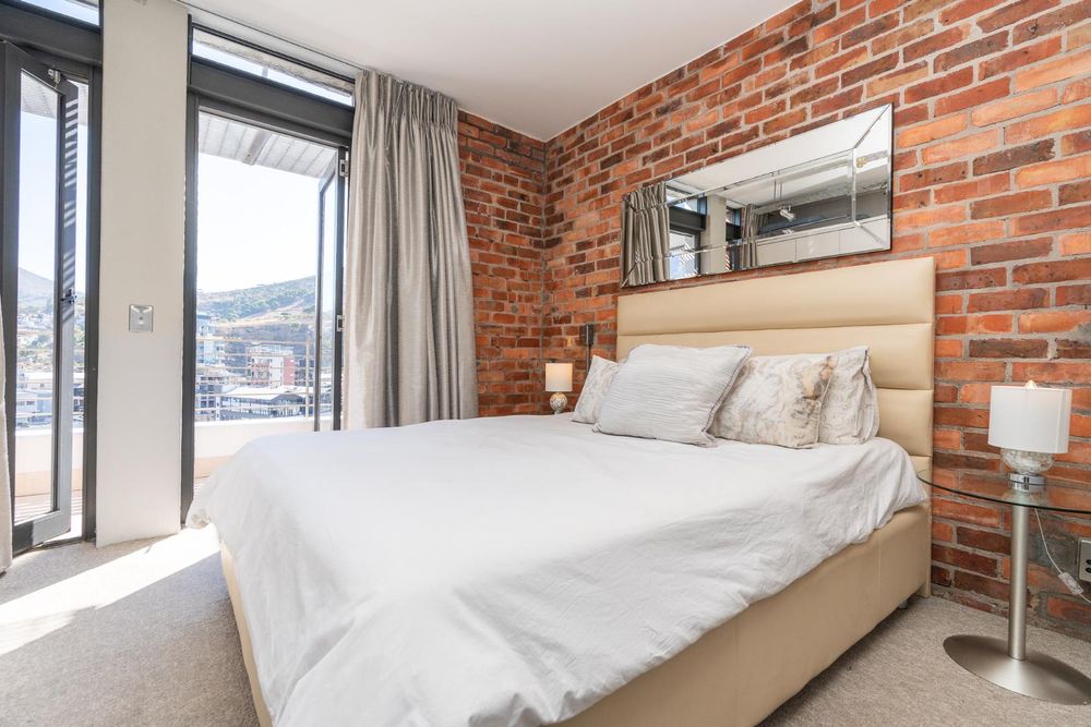 Step into the heart of the home where the open-concept kitchen, equipped with integrated appliances which includes a dishwasher and fridge, flows effortlessly into the living area. The space is highlighted by high concrete ceilings, exposed brick walls, and floor-to-ceiling double-glazed glass doors and windows, which bathe the area in natural light while showcasing breathtaking city and mountain views. The adjoining terrace features a built-in braai, perfect for entertaining. A guest bathroom with a shower is also conveniently located on this level.