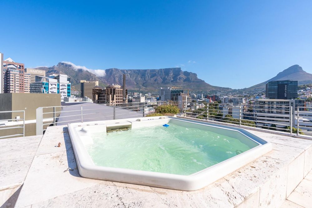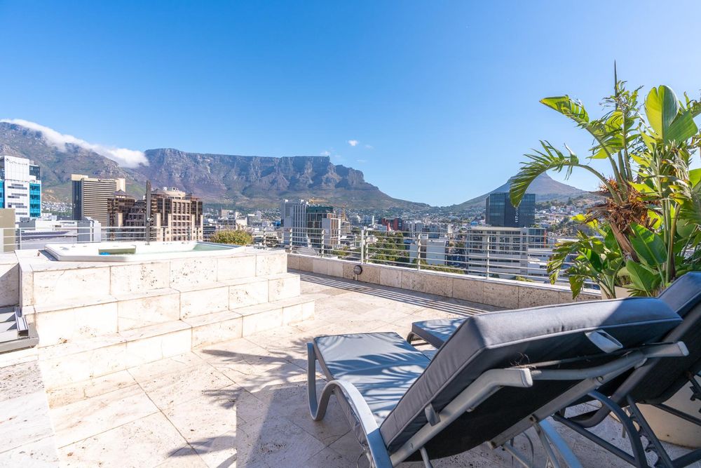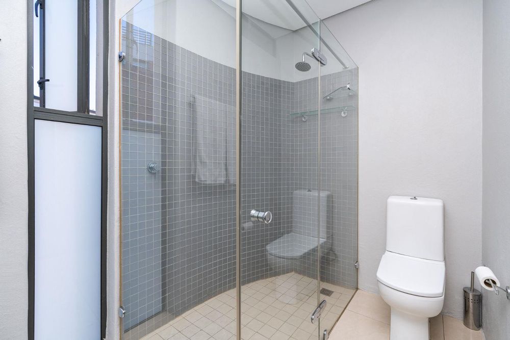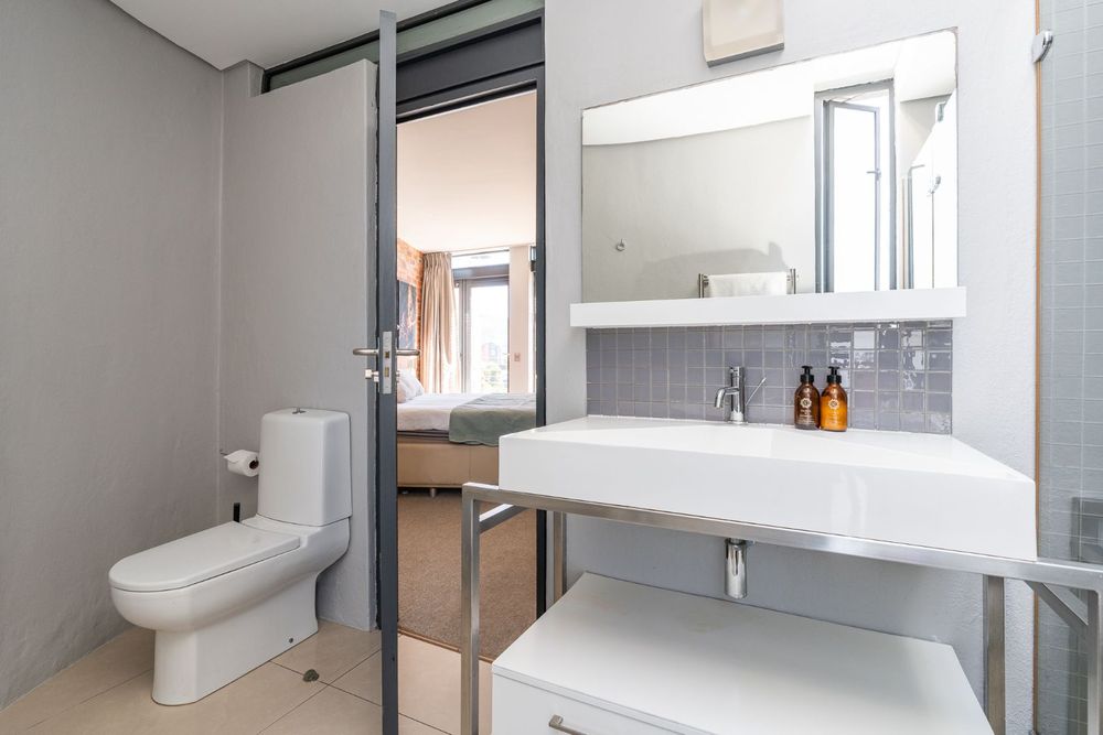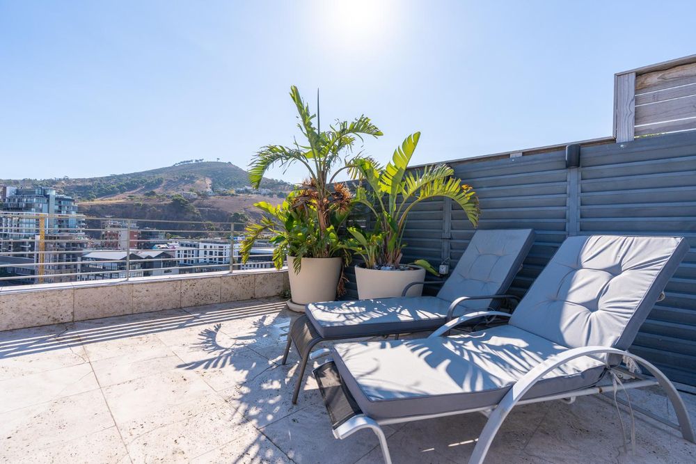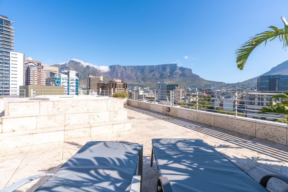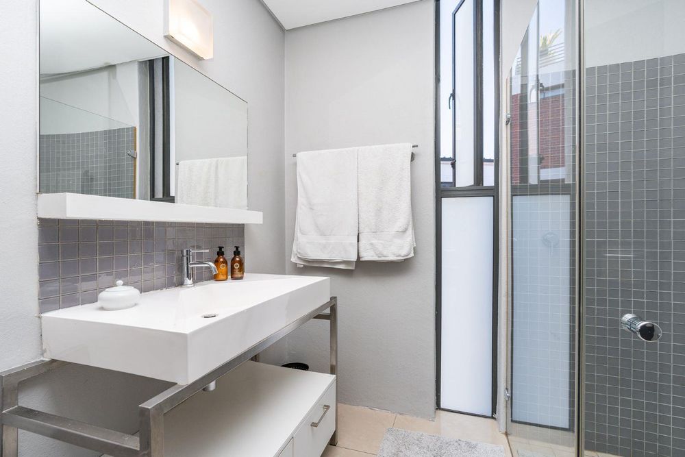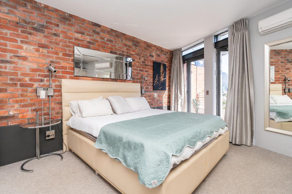 Step into the heart of the home where the open-concept kitchen, equipped with integrated appliances which includes a dishwasher and fridge, flows effortlessly into the living area. The space is highlighted by high concrete ceilings, exposed brick walls, and floor-to-ceiling double-glazed glass doors and windows, which bathe the area in natural light while showcasing breathtaking city and mountain views. The adjoining terrace features a built-in braai, perfect for entertaining. A guest bathroom with a shower is also conveniently located on this level.