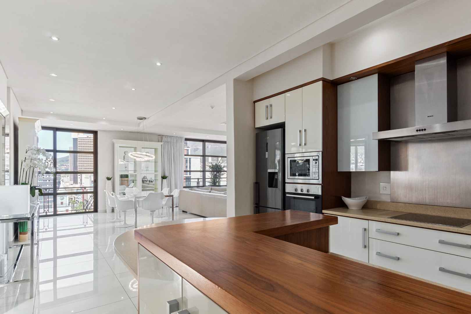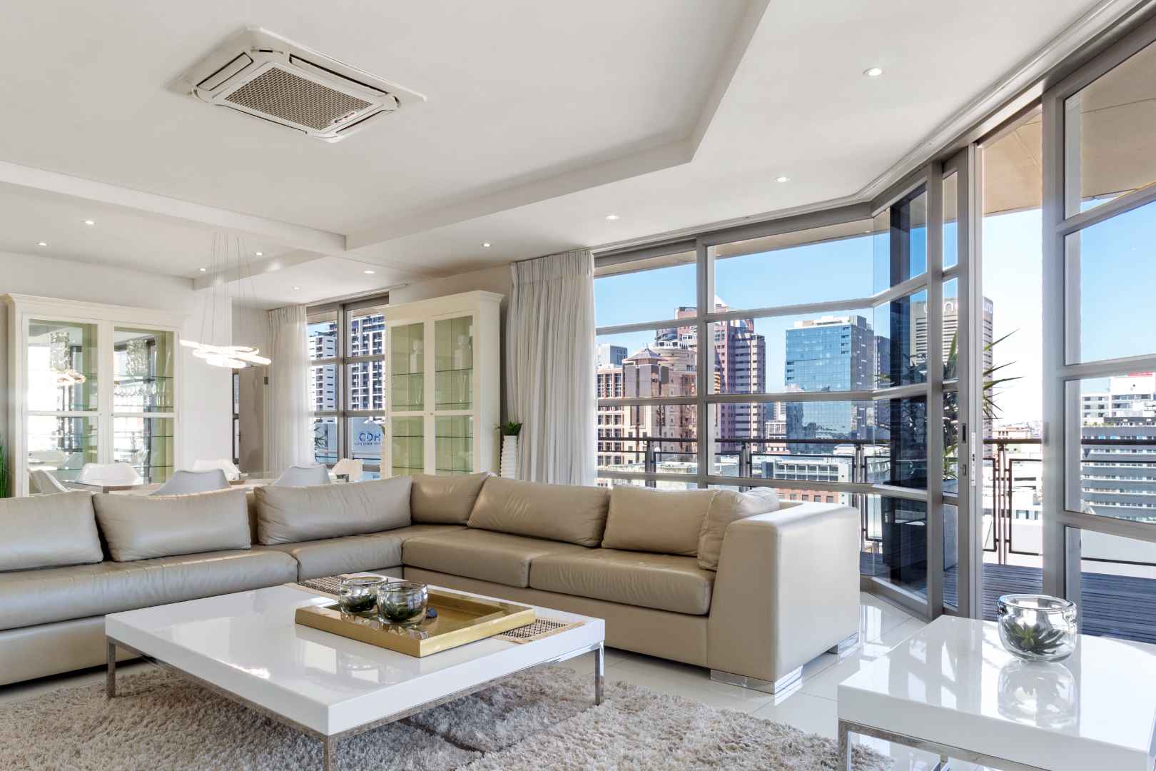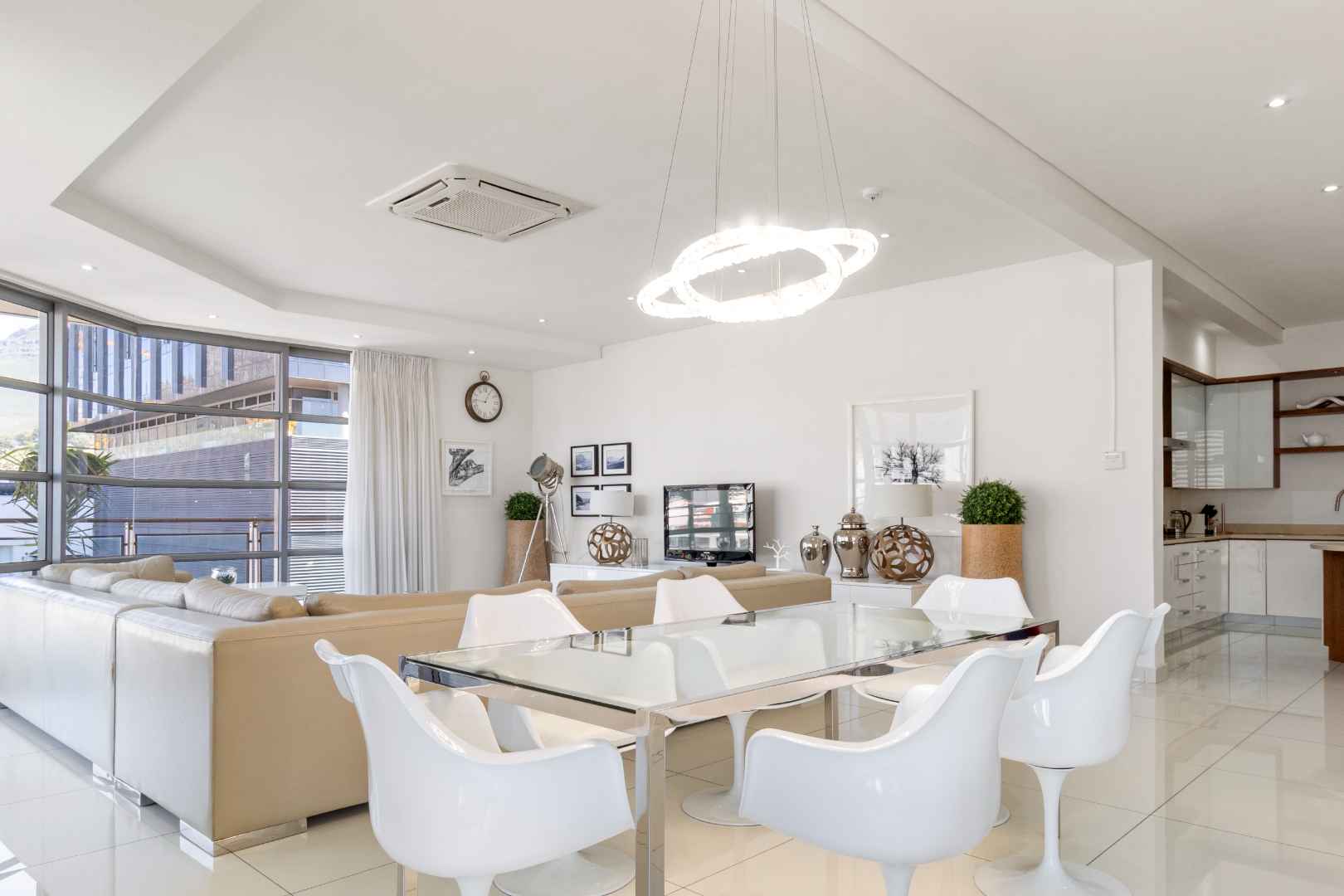 Discover the epitome of urban living in this exquisite single-level, top-floor apartment at Soho on Strand. Immerse yourself in breathtaking panoramic views of the cityscape, Table Mountain, and Lions Head from the expansive wrap-around balcony.