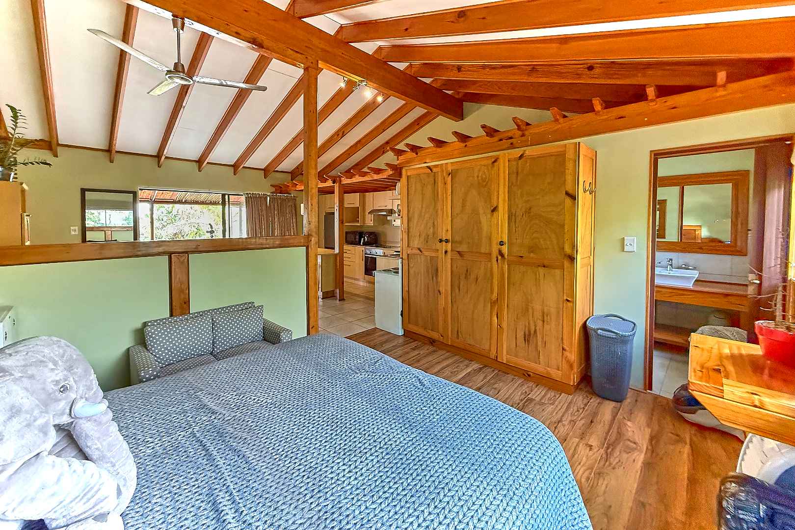 The flatlet's kitchen is well-equipped with an electric stove and oven, granite countertops, an island with seating for two, and ample cupboard space.