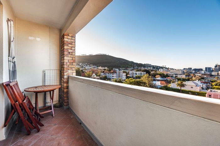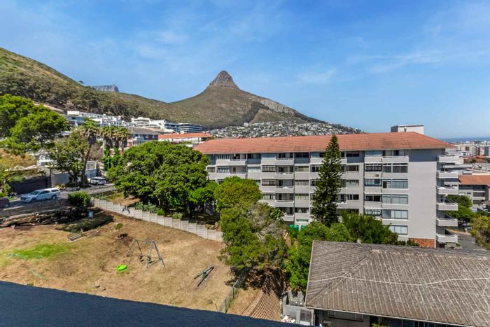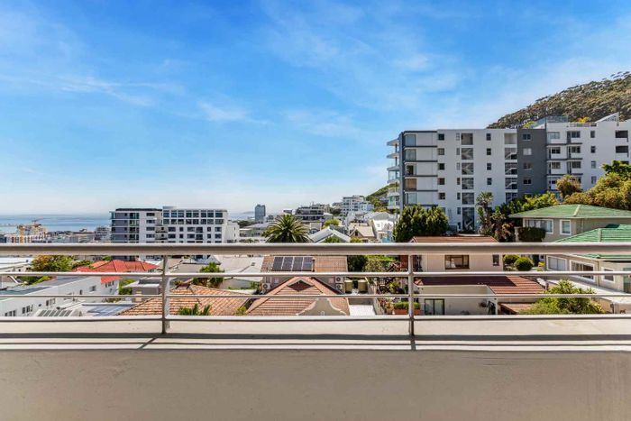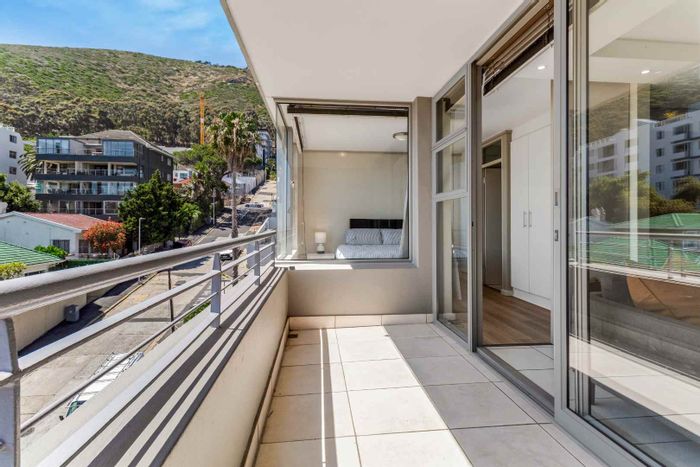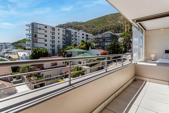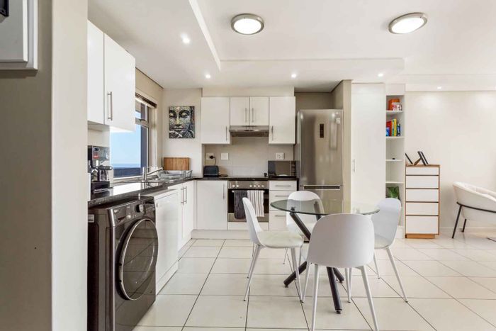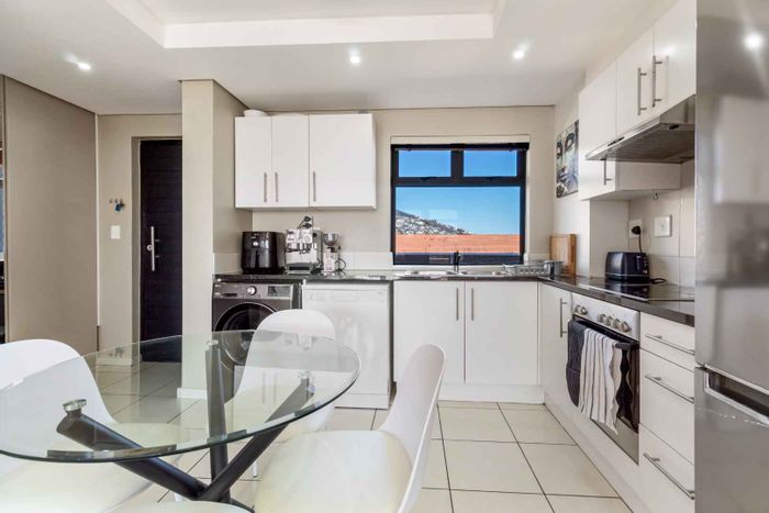 Sea Point living minutes from coastal cafés and shops; open-plan kitchen and living open to a balcony with Lion's Head and mountain views. Three bedrooms, two bathrooms, double garage.
