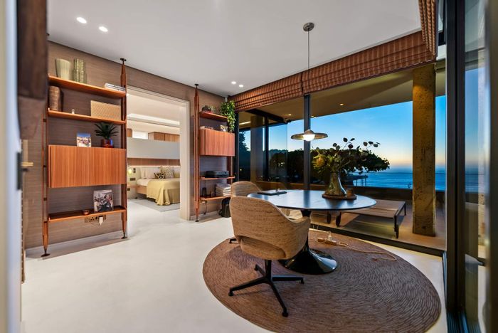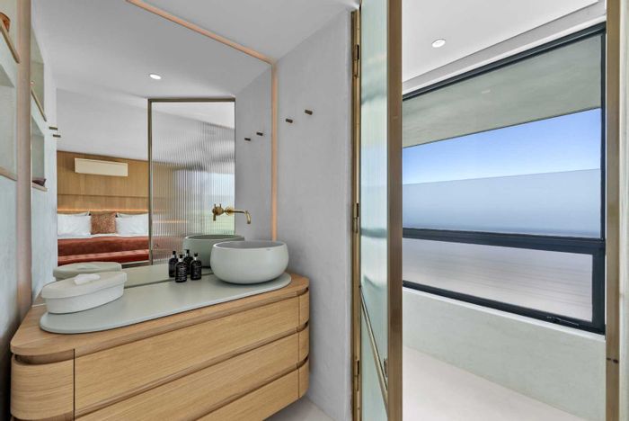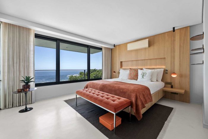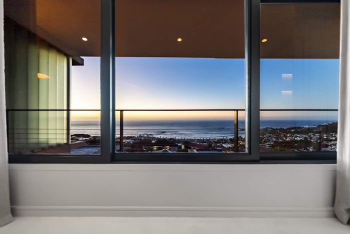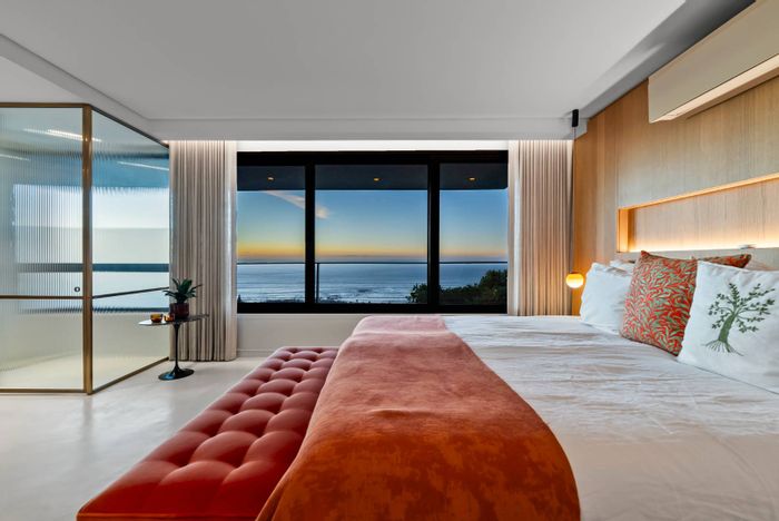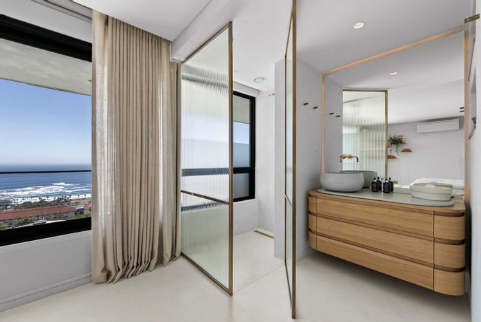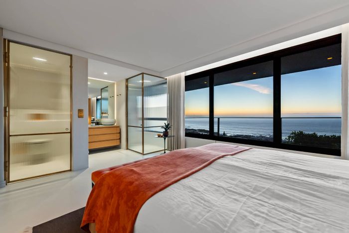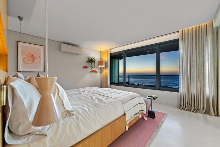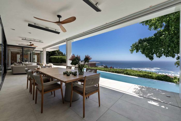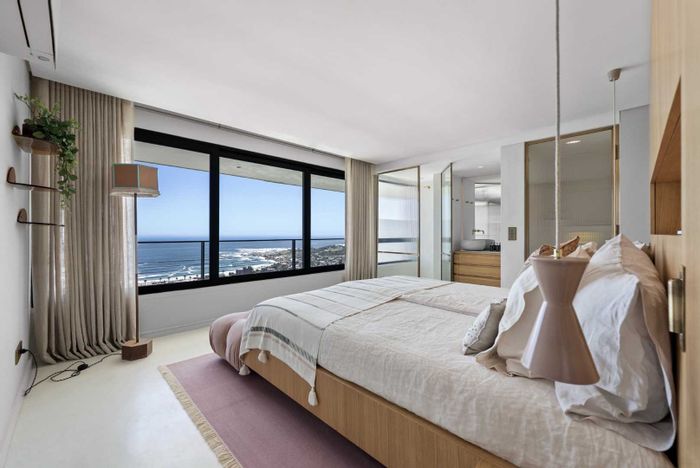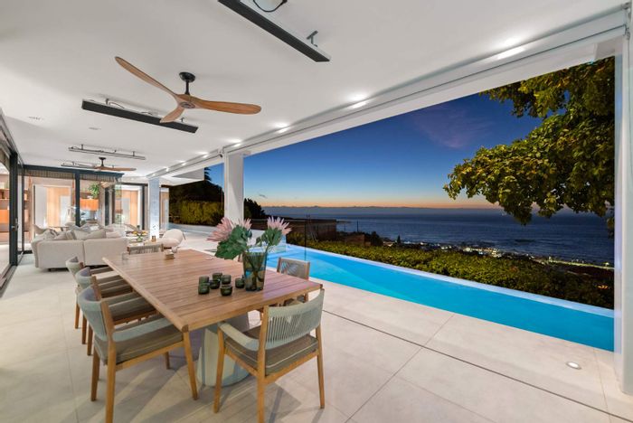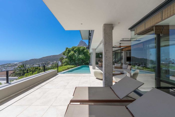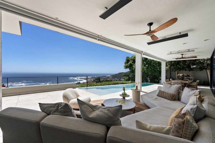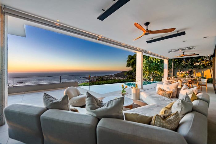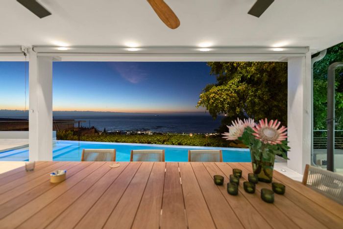 Entertain on a sheltered, wind-free terrace with panoramic ocean and mountain views in exclusive Camps Bay residence, featuring a heated rim-flow pool, three bedrooms, 3.5 bathrooms and double garage.