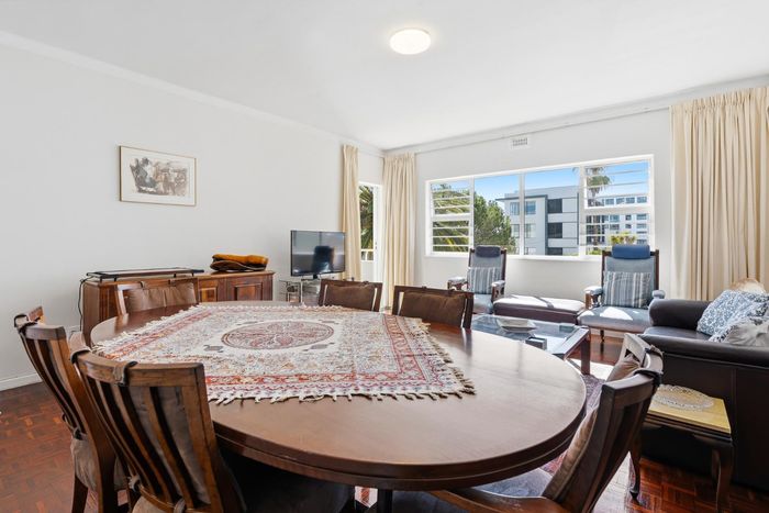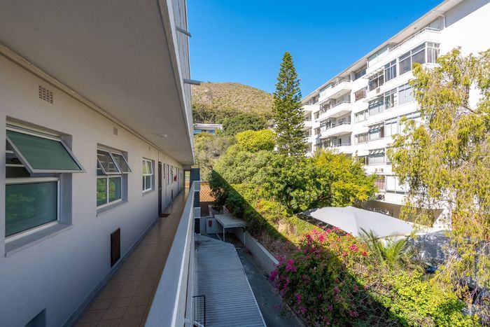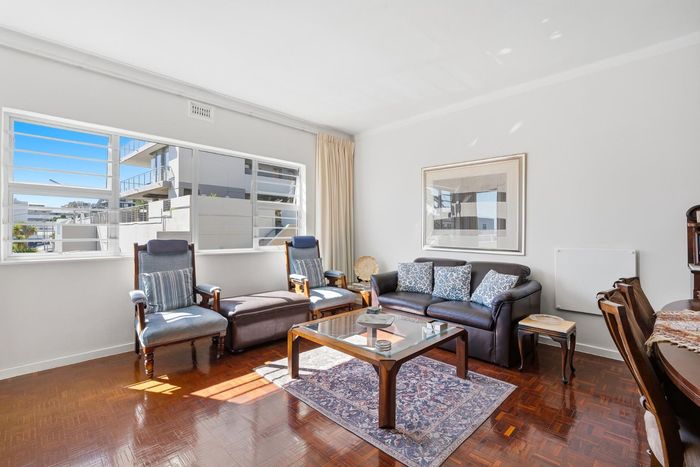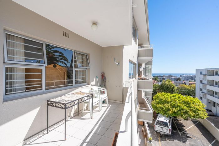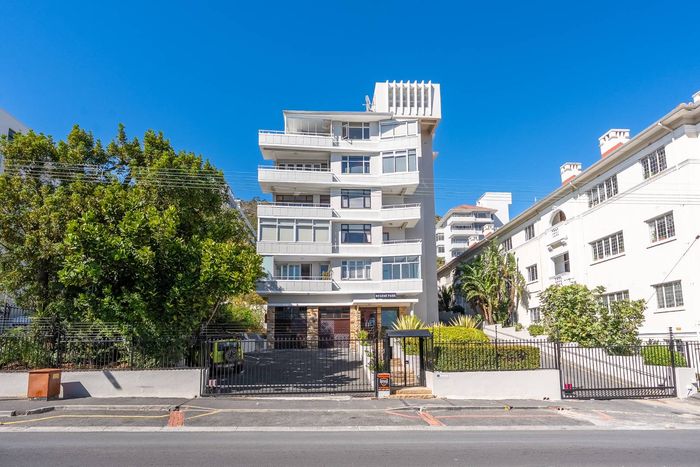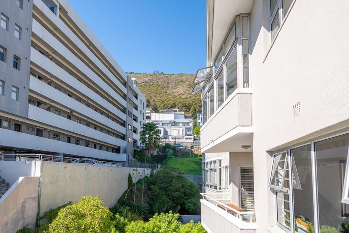 Coastal lock-up-and-go in Bantry Bay, steps to the beach and Sea Point dining. Renovated with covered balcony offering side sea views — two bedrooms, secure parking.