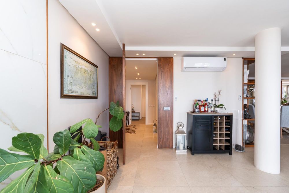 The upper level includes a contemporary open plan kitchen, dining area, and private guest suite.The main level offers a luxurious sea-facing primary suite, two additional mountain-facing bedrooms, a modern family bathroom, guest WC, and an ocean view study ideal for remote work.