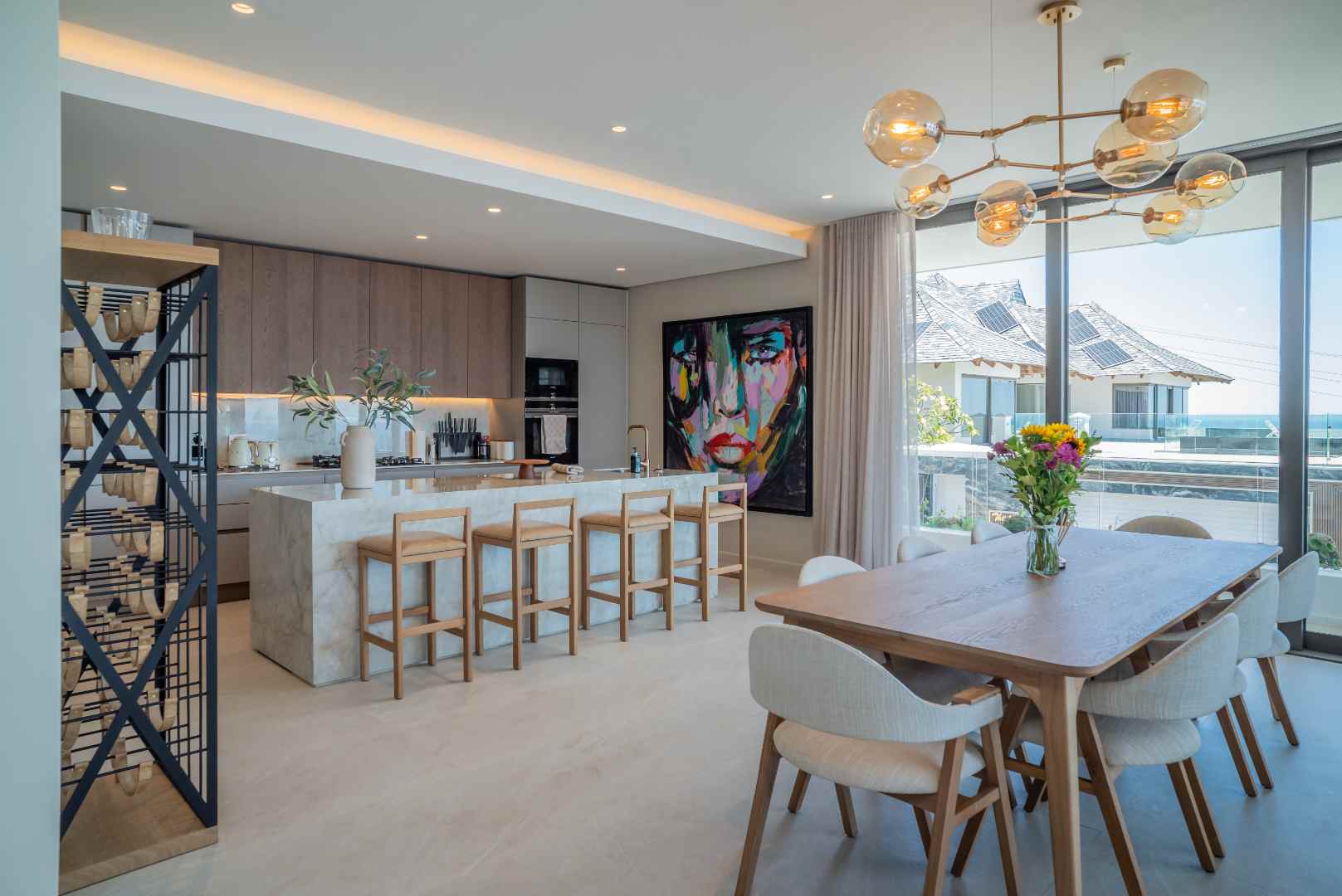 The second level unfolds into an open-plan kitchen equipped with high-end appliances, accompanied by a scullery with washing and drying machines. This level also features a dining area, a lounge, and the primary bedroom with an en-suite bathroom and dressing room—all offering stunning ocean views. Experience breathtaking vistas from various vantage points within the property, allowing you to immerse yourself in the serene beauty of the coastline every day.