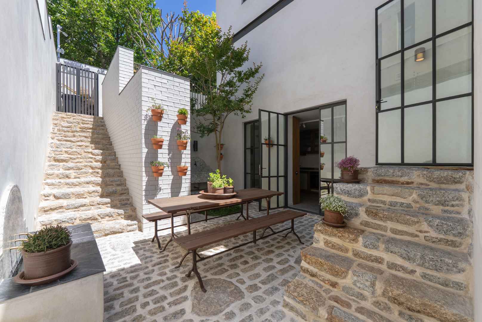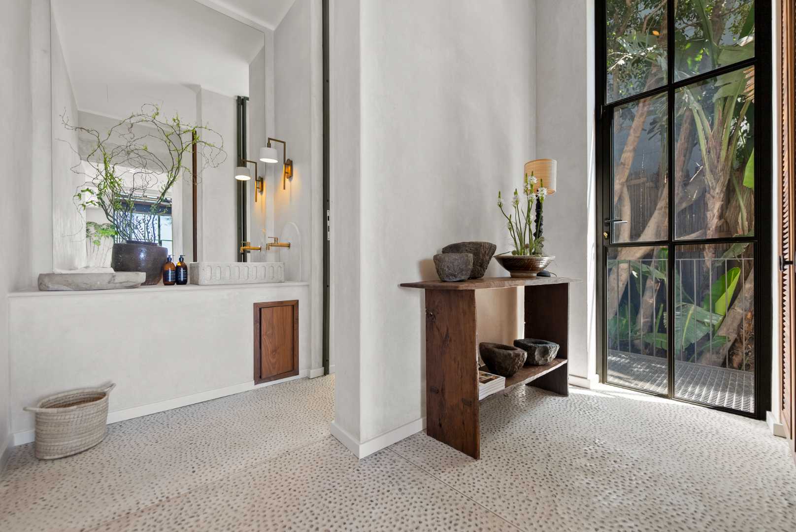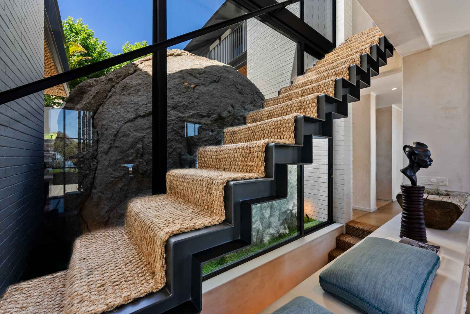 A stylish bar and wine cellar overlooks a boulder element, while pebble-floored zen spaces and custom lighting add layers of refined detail. Flowing circulation is enhanced by a sculptural staircase wrapped in rope treads that connects the levels with effortless grace.