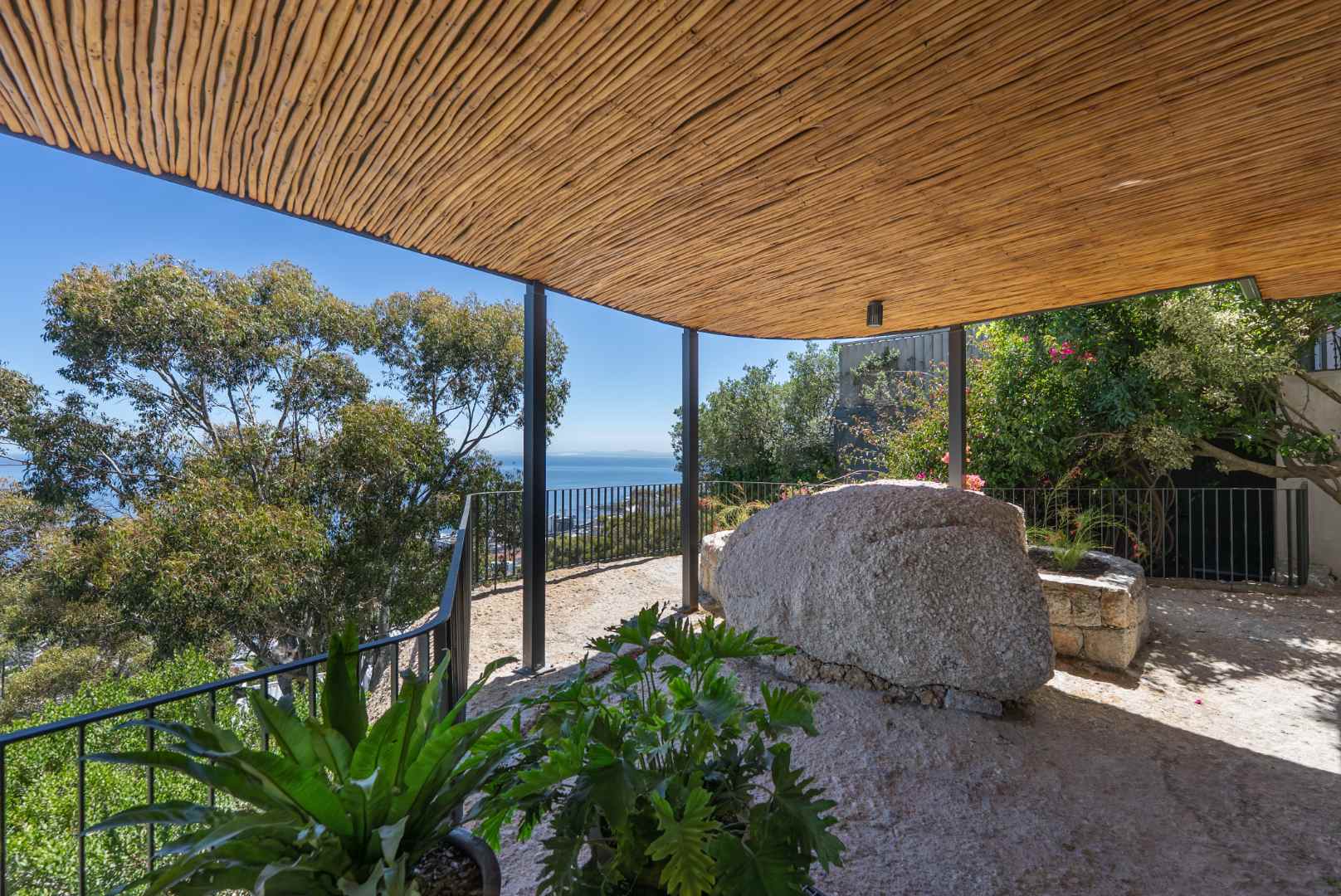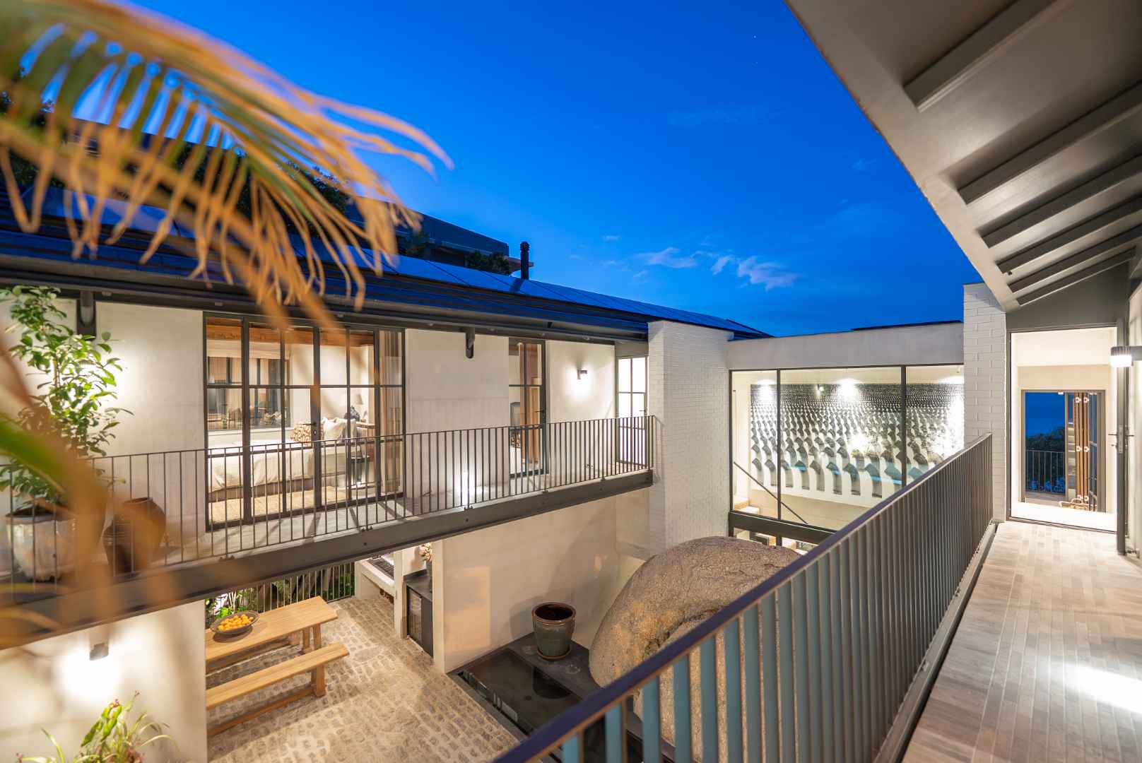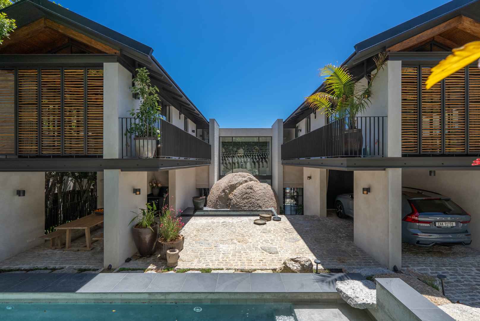 Outdoors, the central boulder-anchored courtyard with cobblestone paving and potted plants leads to a sleek lap pool and al-fresco dining areas. Multiple terraces, shaded by bamboo pergolas, offer intimate lounge seating with round tables, wicker chairs, and ocean-facing views perfect for sunset entertaining. A private plunge pool on a wooden deck provides ultimate relaxation, surrounded by landscaped indigenous gardens, stone steps, and fire pits. At night, illuminated pools and pathways create a magical, resort-like ambiance under the stars.