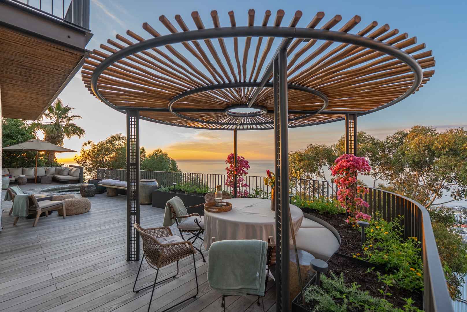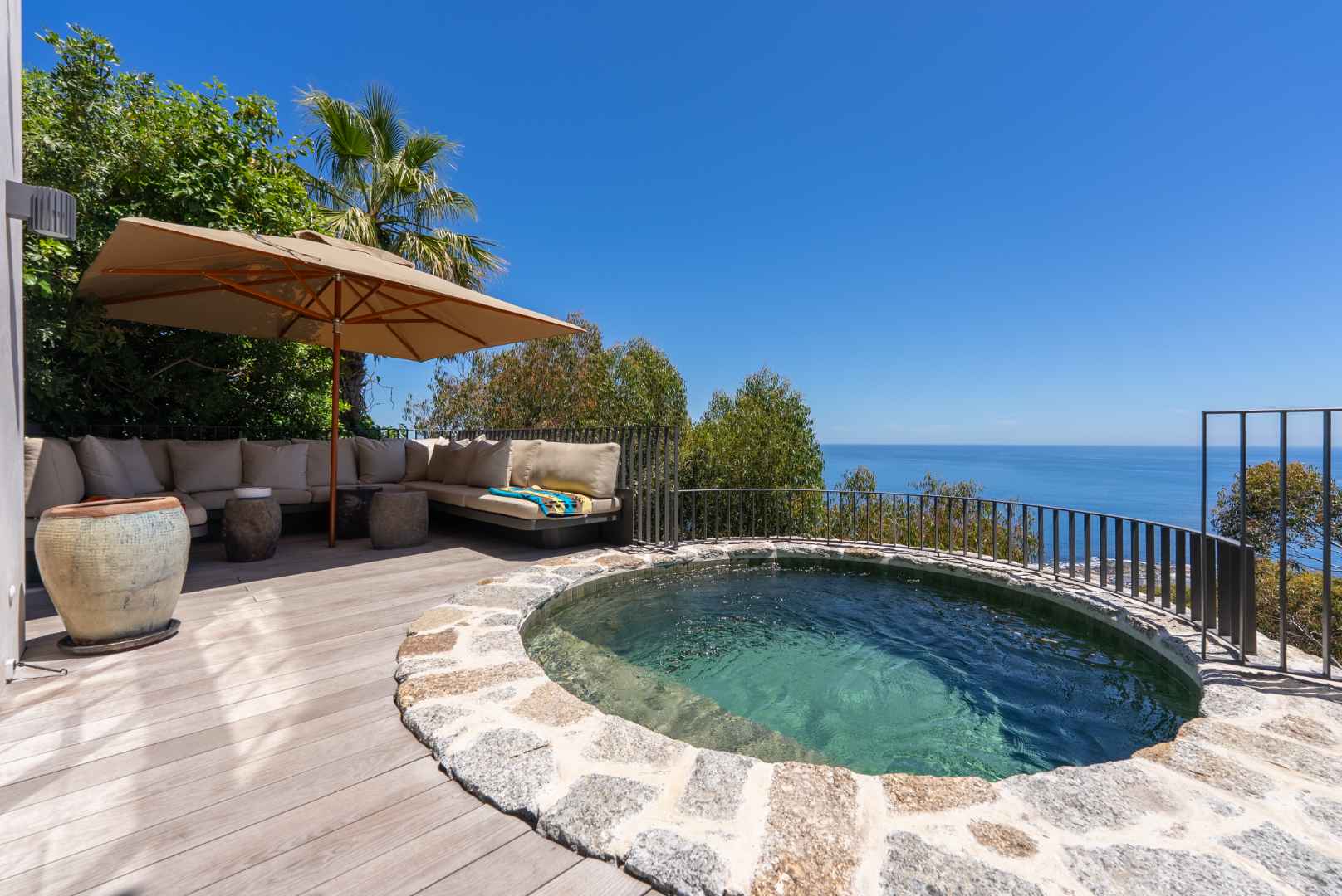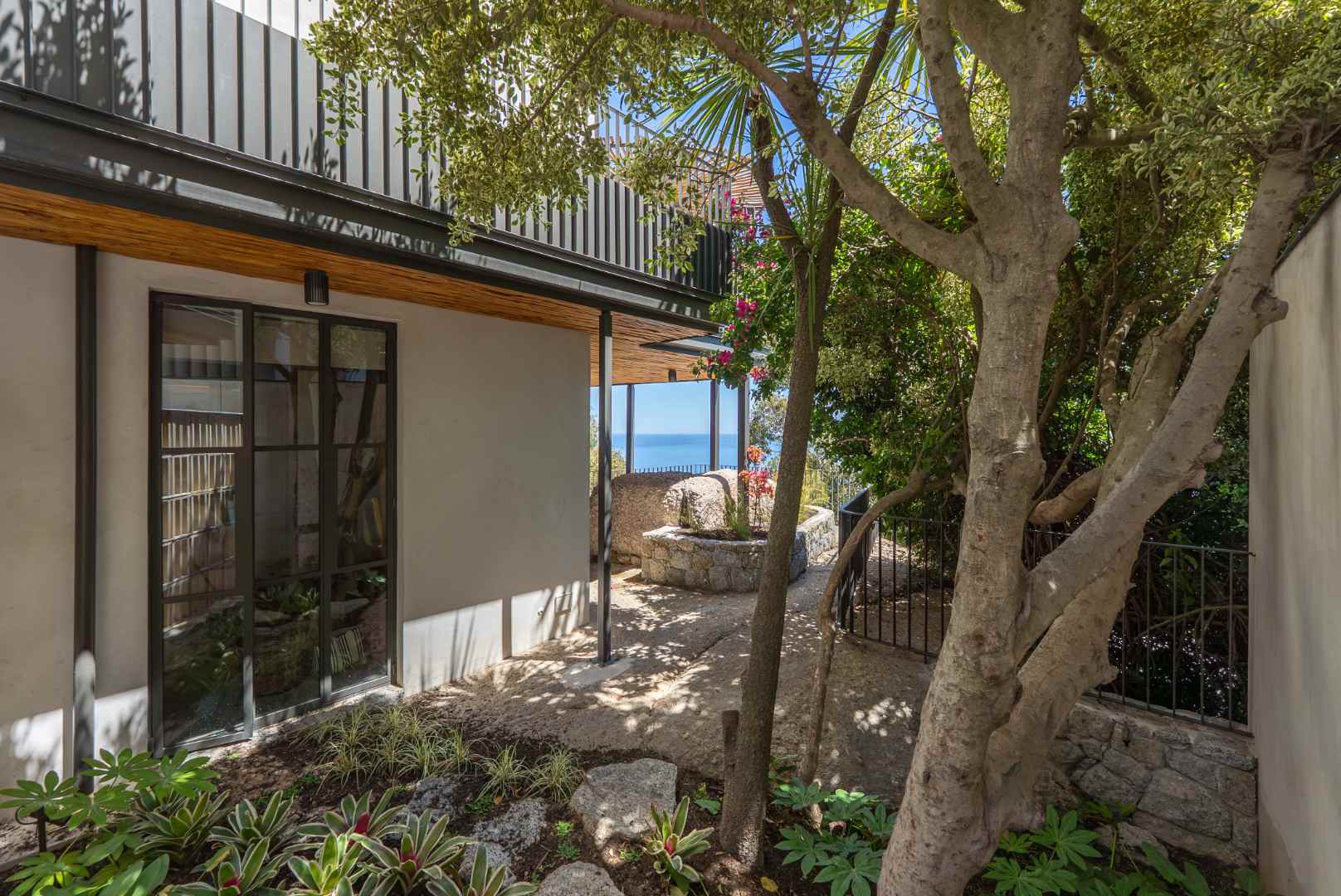 Outdoors, the central boulder-anchored courtyard with cobblestone paving and potted plants leads to a sleek lap pool and al-fresco dining areas. Multiple terraces, shaded by bamboo pergolas, offer intimate lounge seating with round tables, wicker chairs, and ocean-facing views perfect for sunset entertaining. A private plunge pool on a wooden deck provides ultimate relaxation, surrounded by landscaped indigenous gardens, stone steps, and fire pits. At night, illuminated pools and pathways create a magical, resort-like ambiance under the stars.