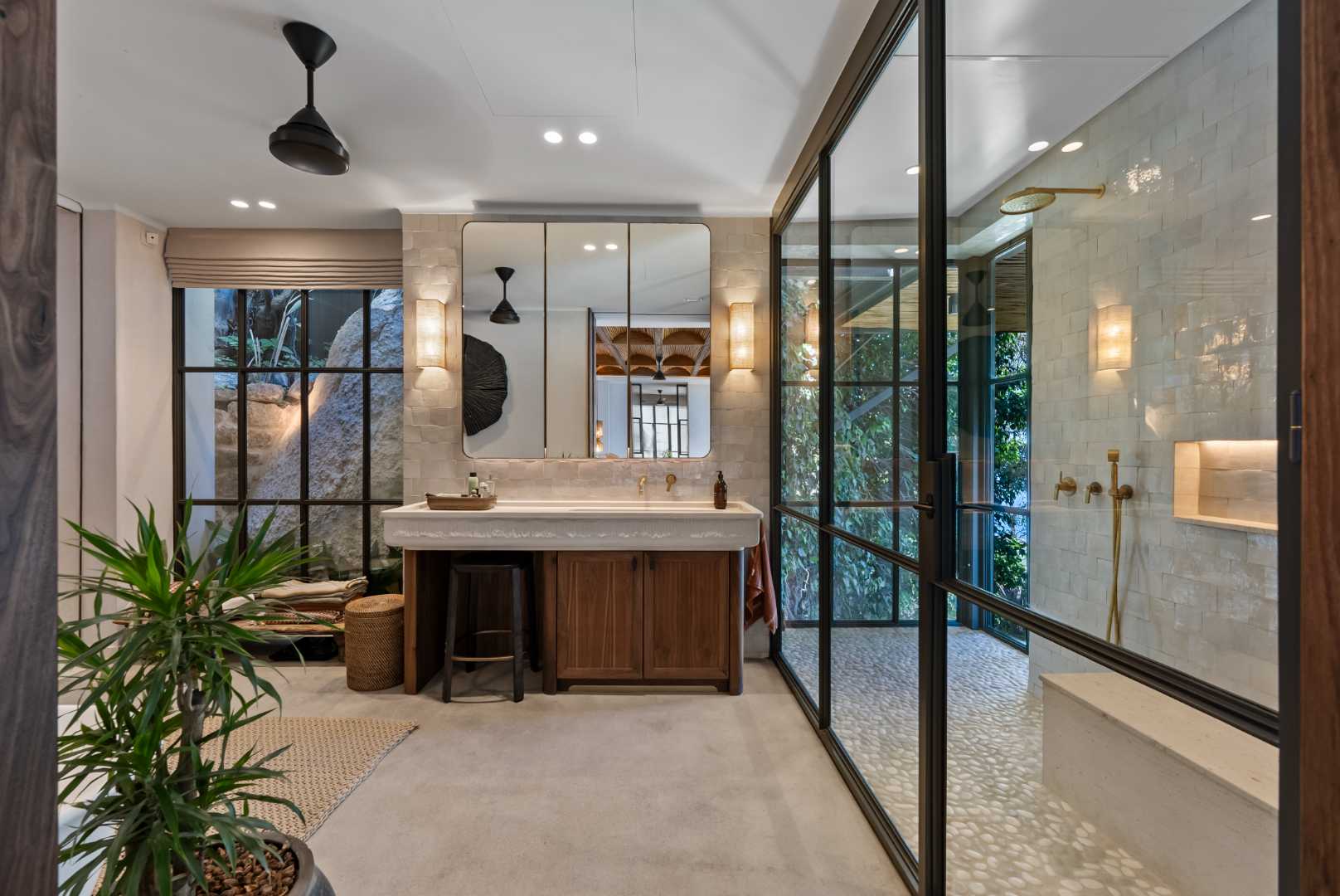 The residence features clean, symmetrical lines, expansive glass facades, and a striking integration of massive granite boulders that serve as dramatic artistic focal points throughout. Gabled roofs, black-framed balconies with bamboo shutters, and a central courtyard create a sense of symmetry and serenity, while the multi-level layout takes full advantage of the hillside position. Elevated decks, terraces, and plunge pools frame breathtaking ocean vistas from nearly every angle, enhanced by sustainable materials such as reclaimed wood, natural stone paving, and warm bamboo accents.