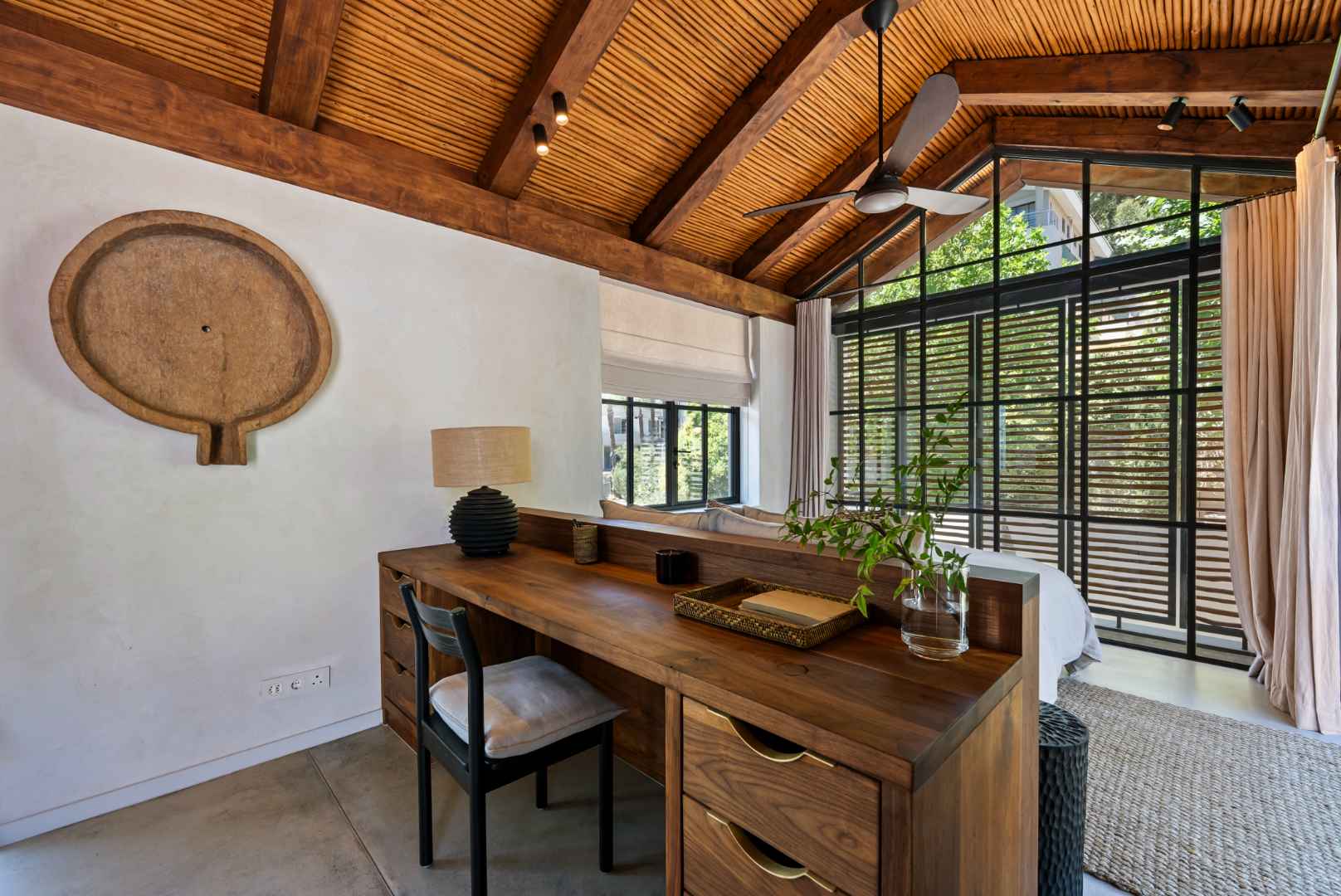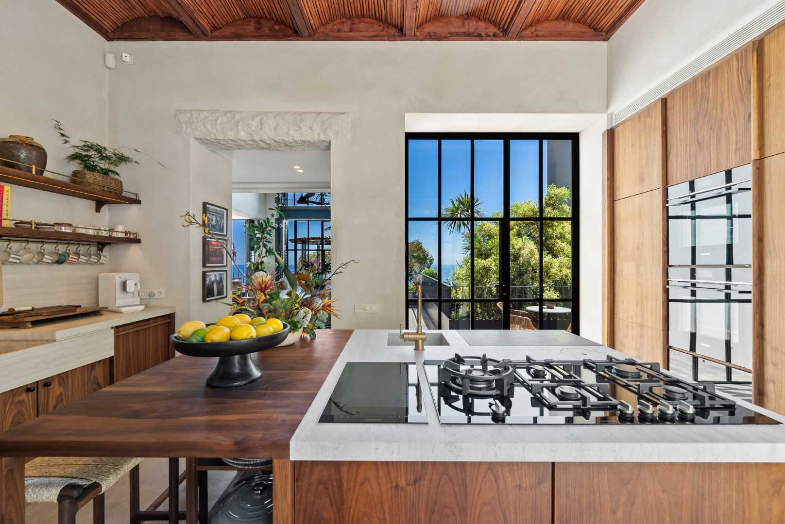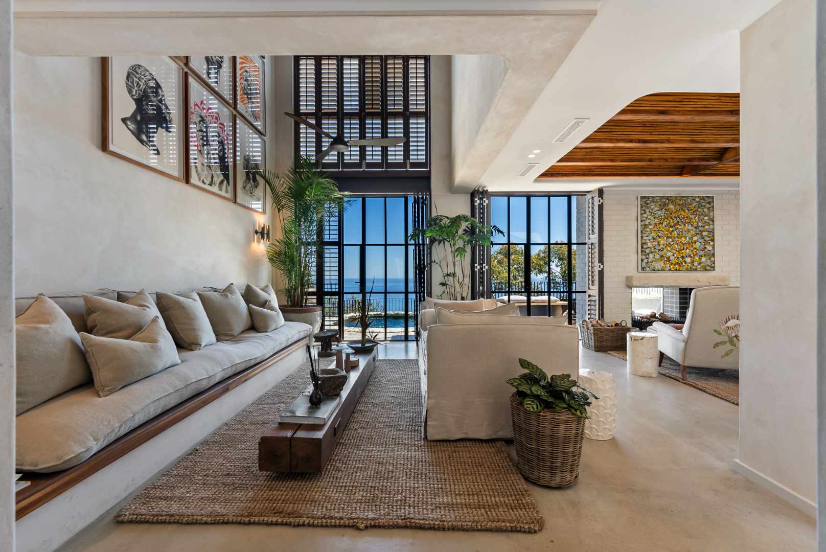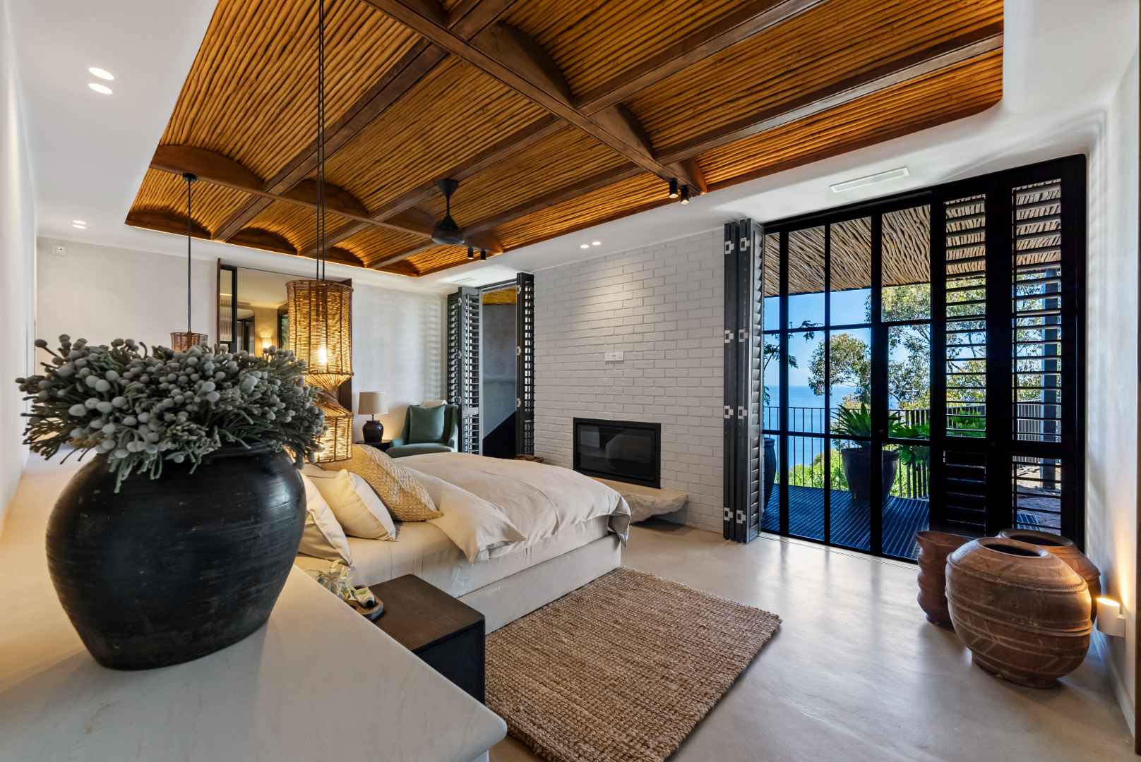 Inside, open-plan living spaces exude minimalist sophistication with high ceilings, exposed wooden beams, soft neutral palettes, and floor-to-ceiling windows that bathe the rooms in natural light while framing endless blue horizons. The tranquil master suite invites relaxation with a king-sized bed positioned to enjoy private balcony views, a cozy fireplace, and artisanal touches like woven rugs and handcrafted pottery. Spa-like en-suite bathrooms feature stone vanities, rainfall showers, a steam shower room and subtle integration of rock formations or lush greenery.