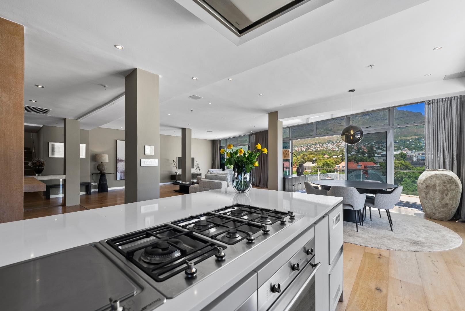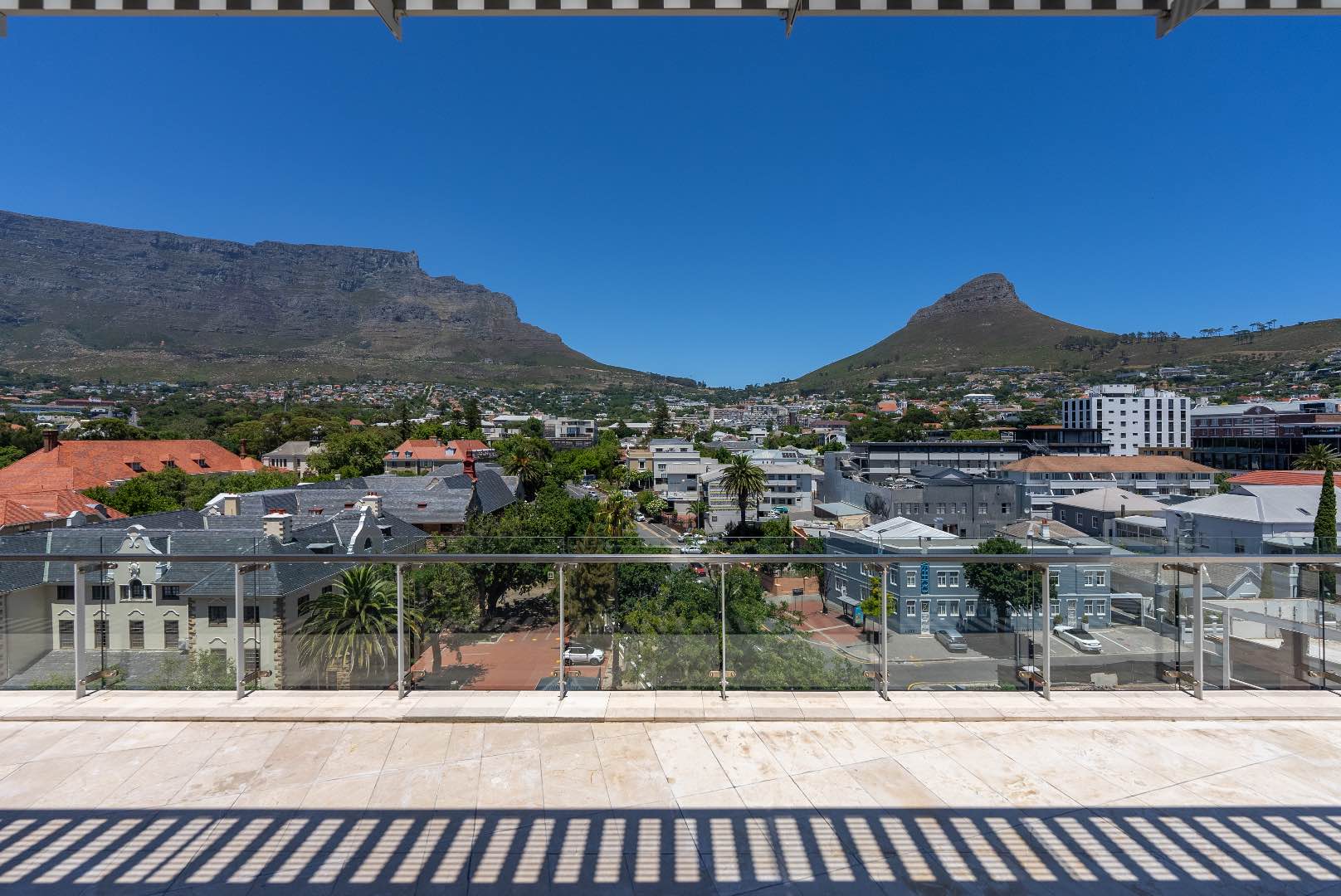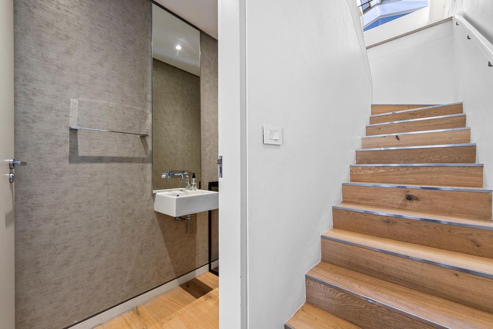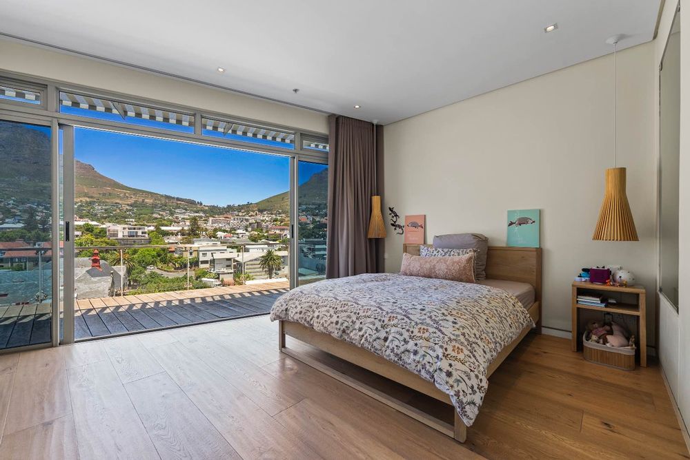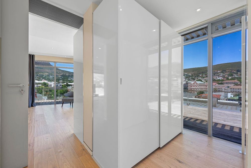 Upstairs hosts 3 spacious en-suite bedrooms (two of these suites have their own dressing rooms). All the bedrooms flow out onto a balau patio with infinity glass balustrades that span the entire length of the apartment, allowing one to savour the rich vistas of Table Mountain & Lions Head from every bedroom.
