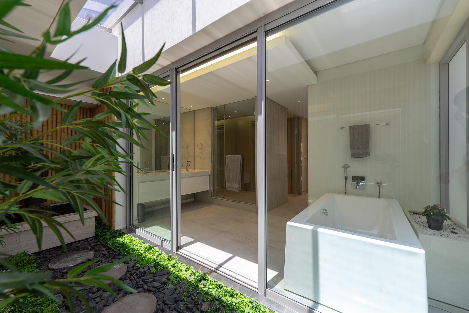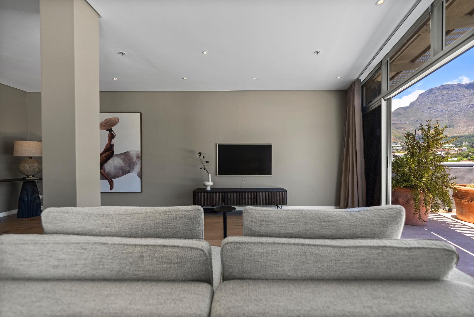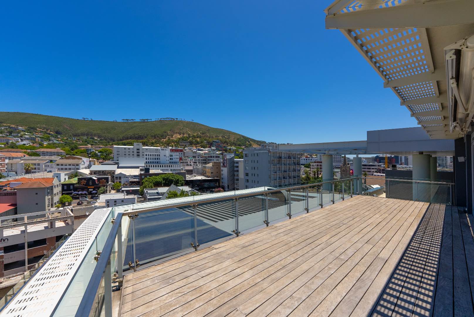 Upstairs hosts 3 spacious en-suite bedrooms (two of these suites have their own dressing rooms). All the bedrooms flow out onto a balau patio with infinity glass balustrades that span the entire length of the apartment, allowing one to savour the rich vistas of Table Mountain & Lions Head from every bedroom.