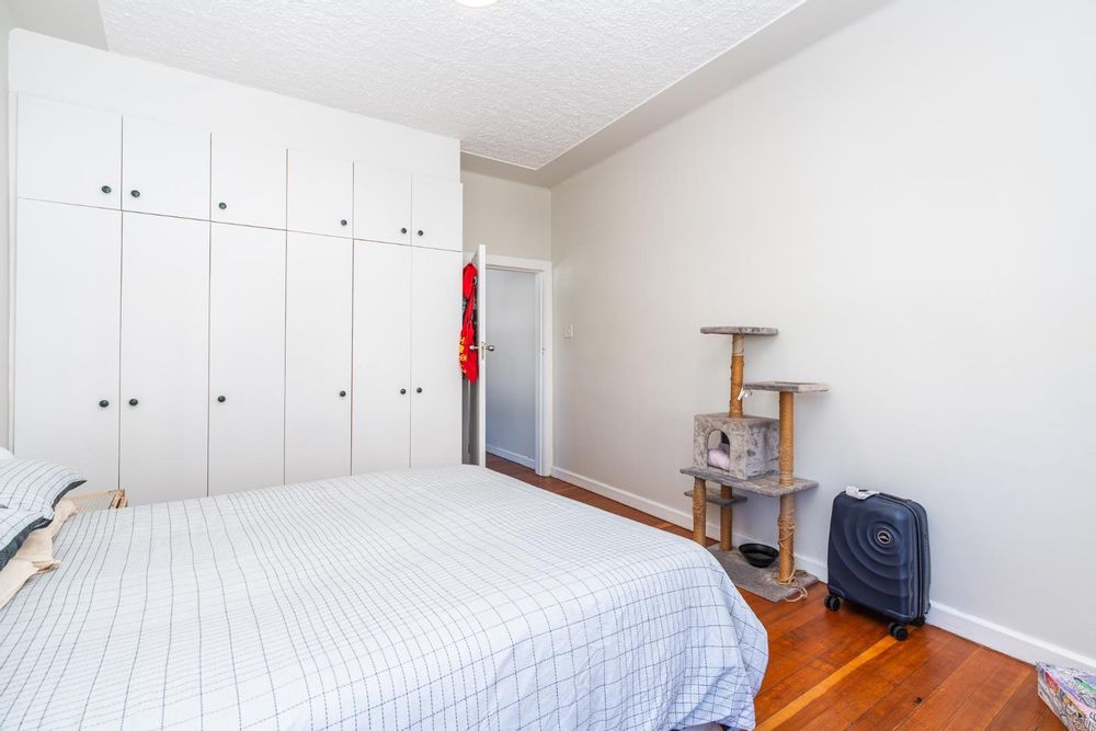 The spacious bedroom features the same wooden flooring, plenty of room in the built-in cupboards and corner windowing looking out on the streetscape, planetarium and 15 on Orange Hotel.