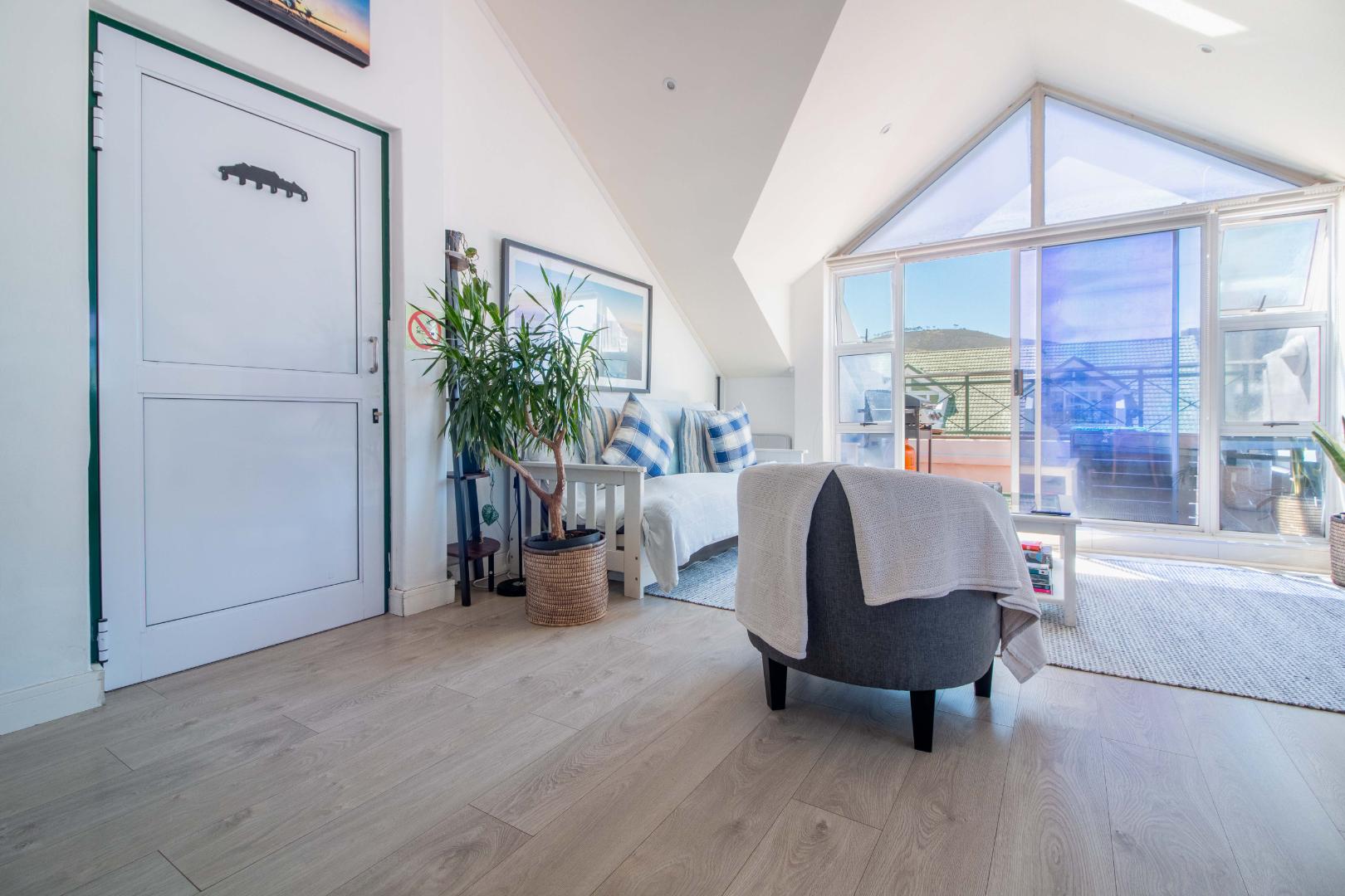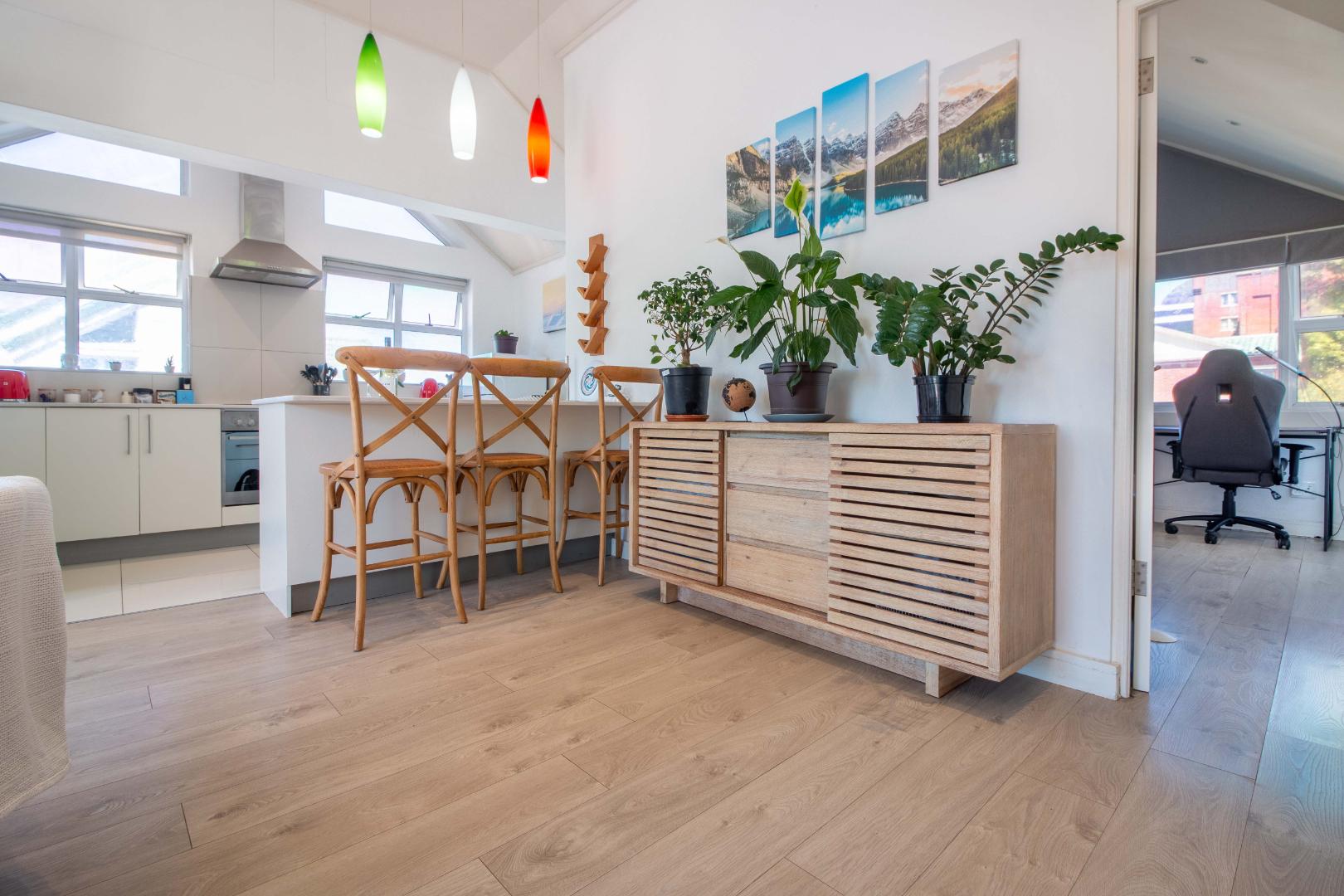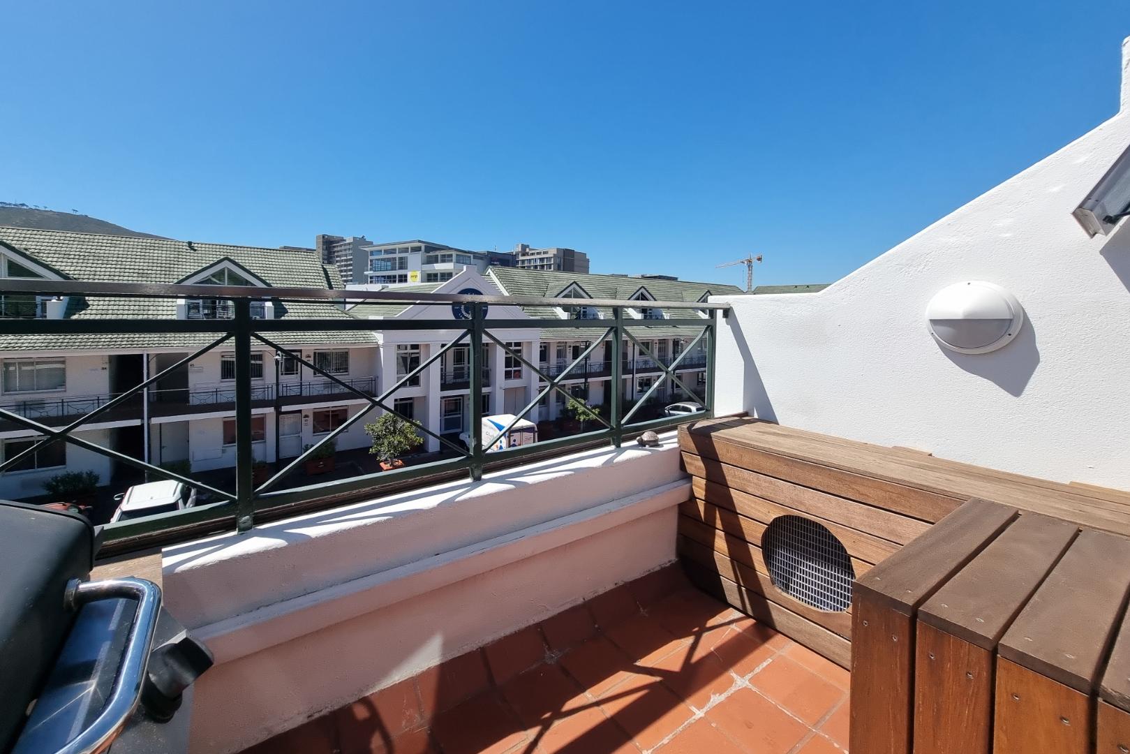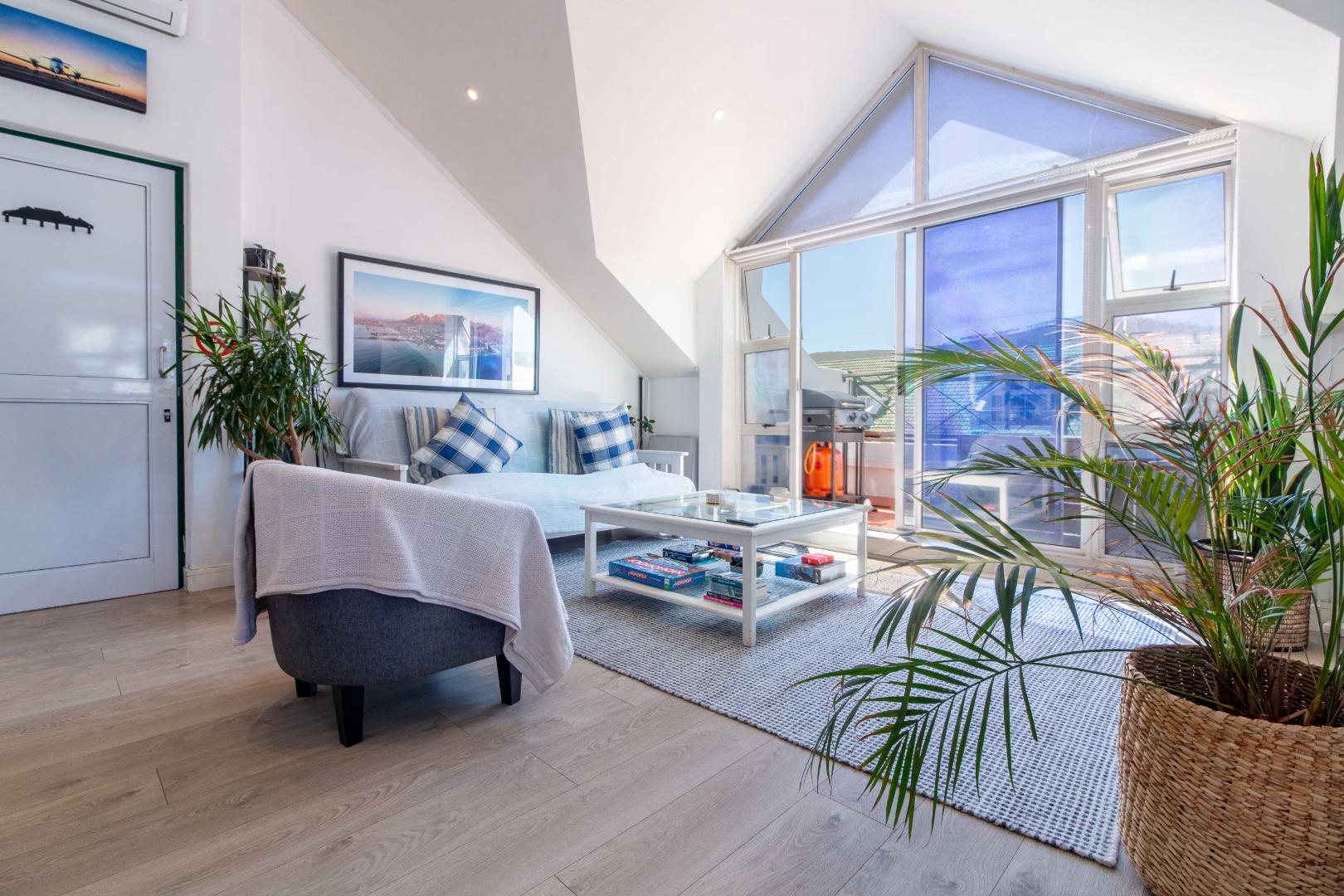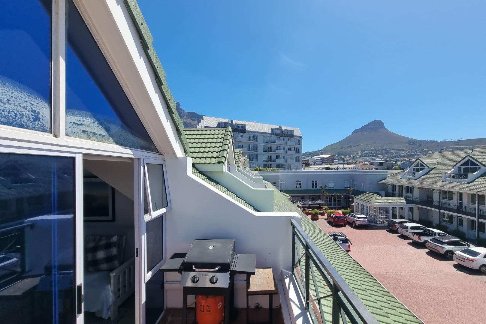 Open plan living, renovated kitchen, high ceilings and a ready and waiting braai area on the balcony with magnificent views of Signal Hill and lions Head - ideal for perfect evening sunsets