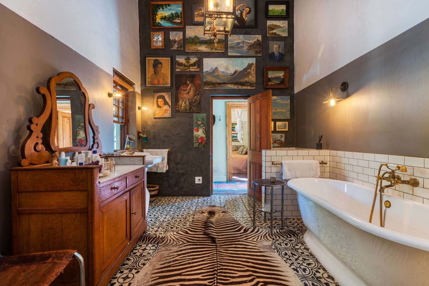 The Cape Dutch home, dating back to 1870, offers two en-suite bedrooms, a study (or third bedroom), an outdoor shower, and a spacious patio and garden. It also includes ample storage space and rainwater tanks. Modern amenities include a washing machine, dryer, dishwasher, gas hob and oven, freezer, ice machine, and fiber internet.