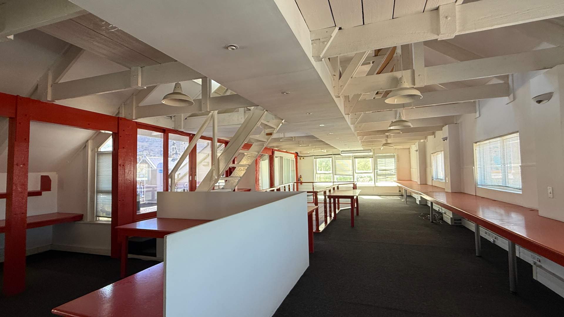 Large windows allow for excellent natural light throughout the workspace, while the upper level opens onto a balcony area offering attractive views over Cape Town — creating an inspiring and productive working environment.