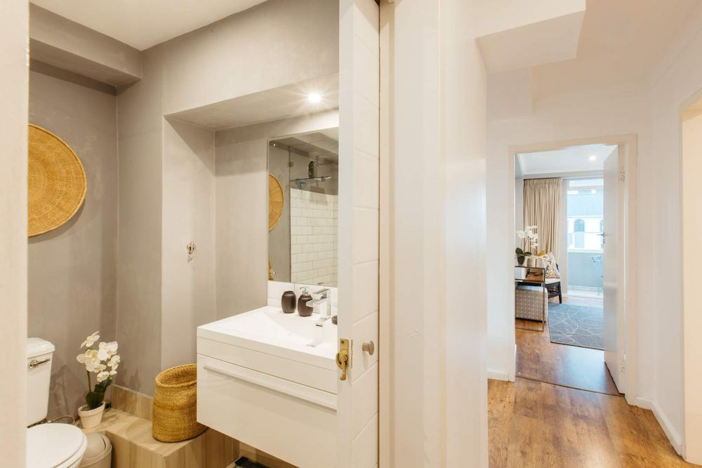 This two-bedroom apartment is situated in a sought-after block in Green Point, one of Cape Town’s trendiest areas. It offers an open-plan kitchen, dining, and lounge area, with a practical, well-laid-out design. The two bedrooms are spacious and include ample built-in storage. A balcony, accessible from the main bedroom and the lounge, is the perfect spot to soak in the lovely afternoon sun and offers views of the Green Point Stadium. Stylish white aluminum American shutters frame the windows and doors for a clean, modern finish.
