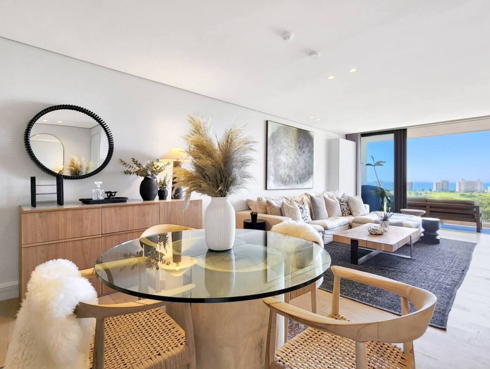 The layout is spacious and practical: two en suite bedrooms, open-plan living and dining, and a private balcony that frames panoramic city and ocean views.