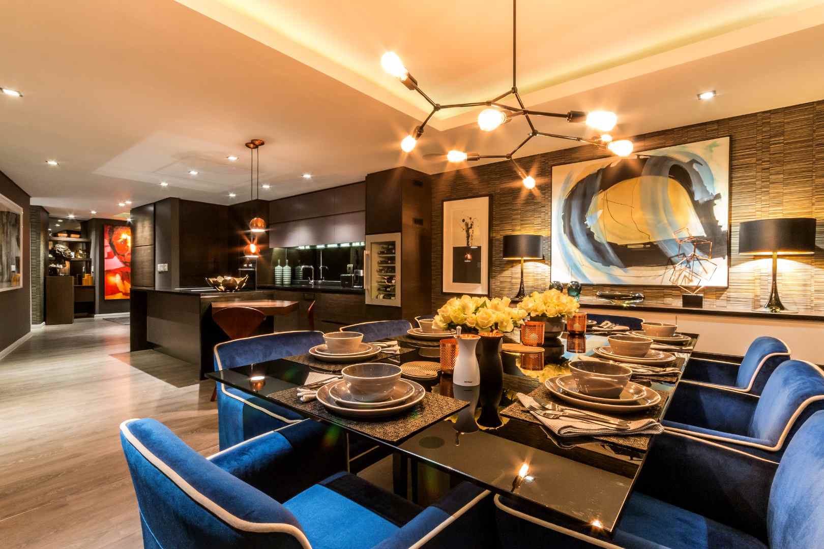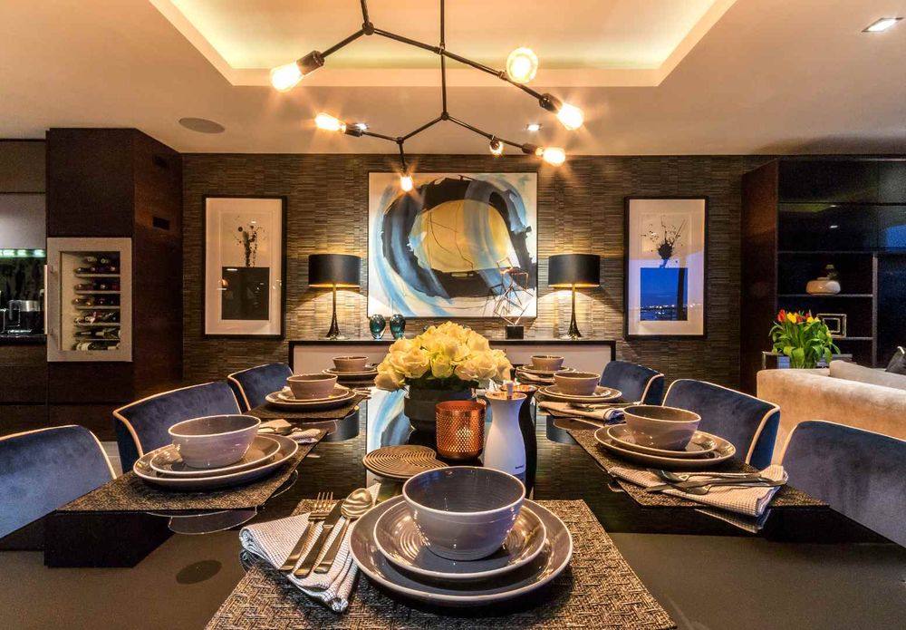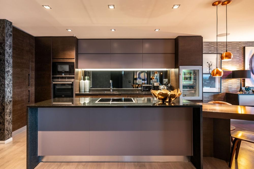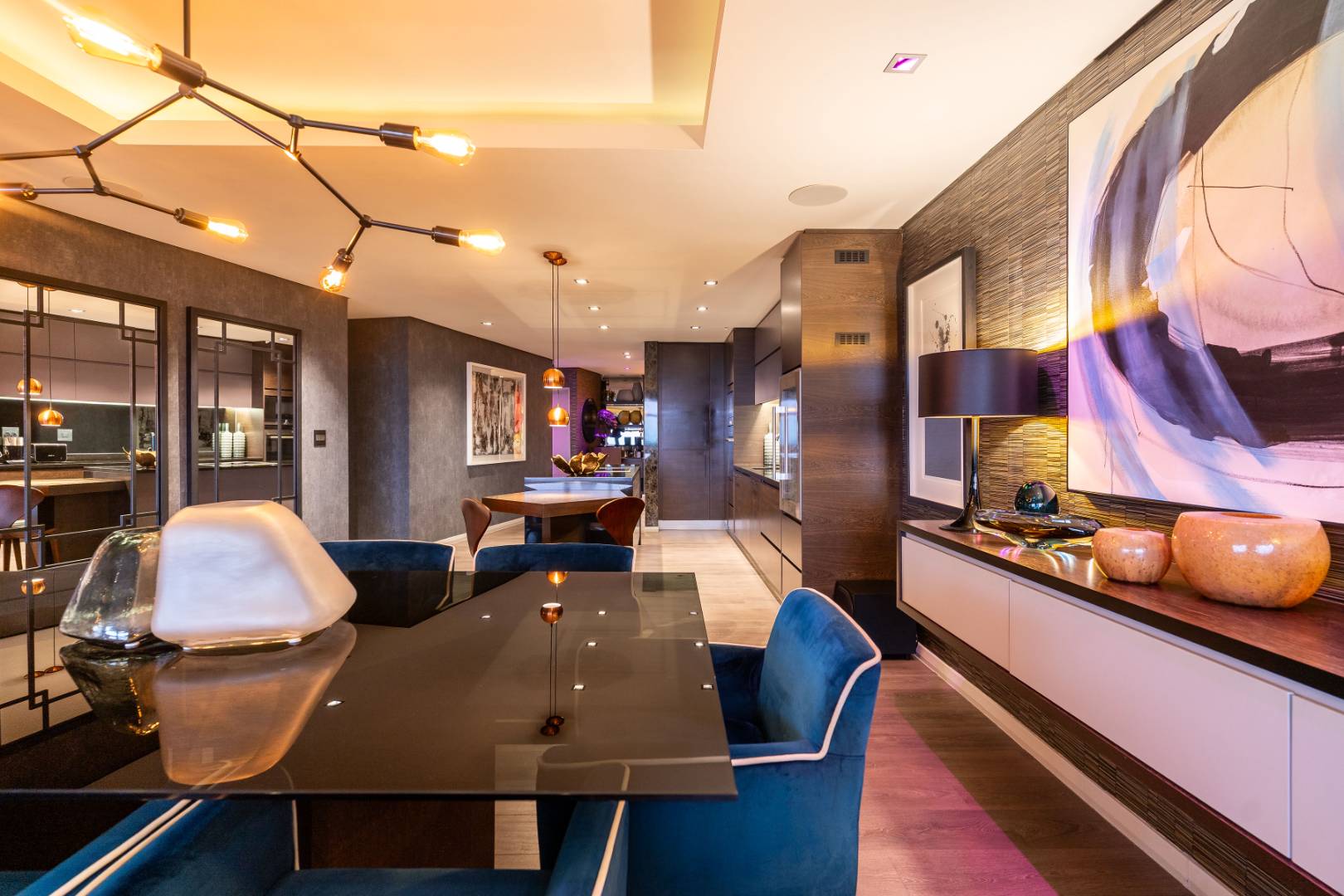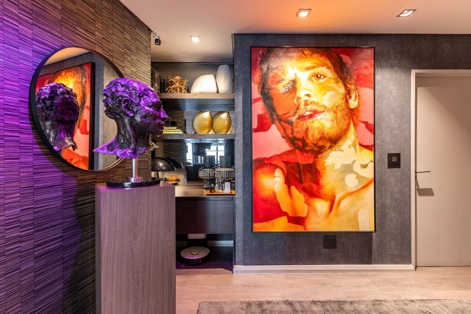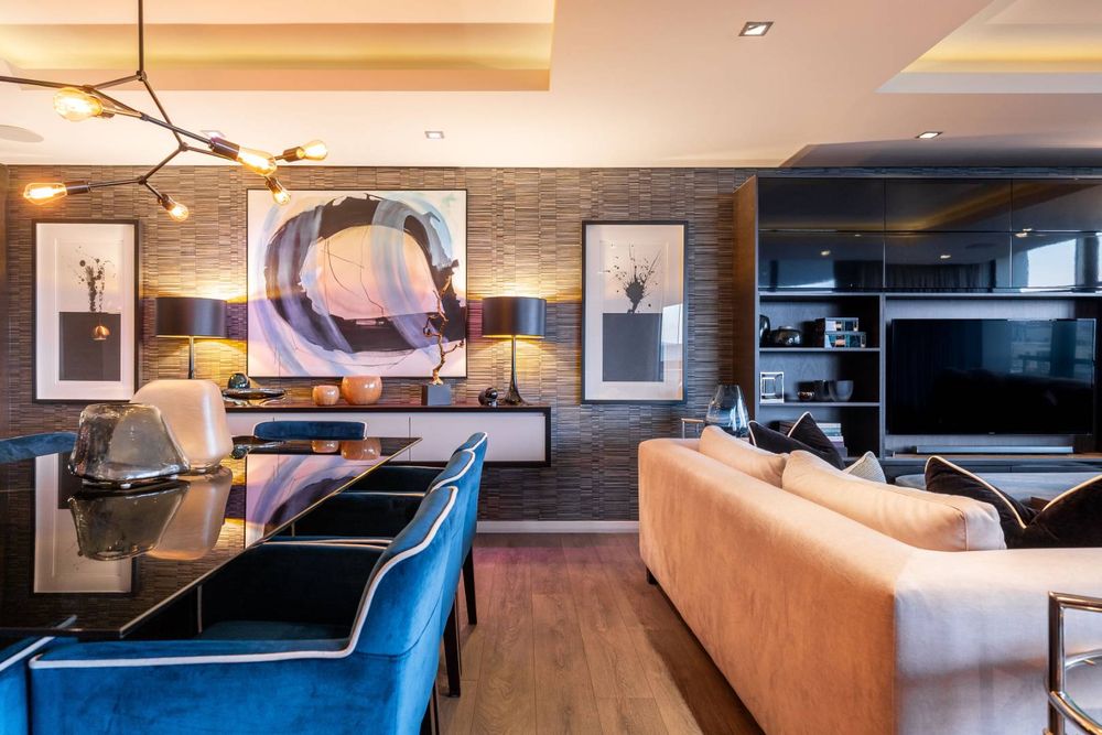 Custom wall finishes and bespoke joinery create a considered interior, enhanced by a rich palette of custom wallpapers, tinted mirrors, and feature lighting that highlights the apartment’s architectural detail.
