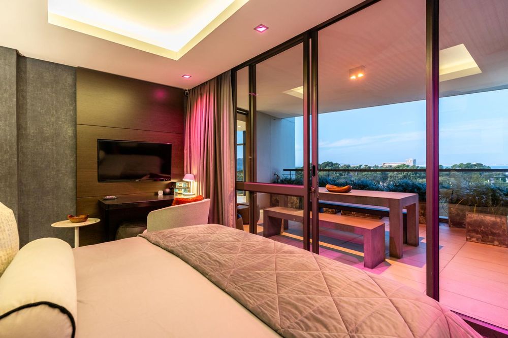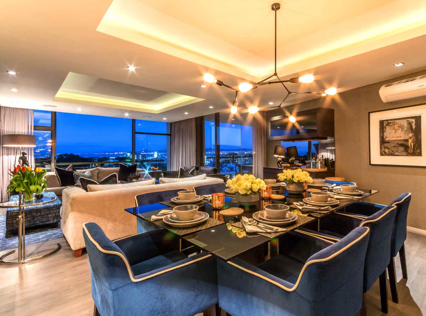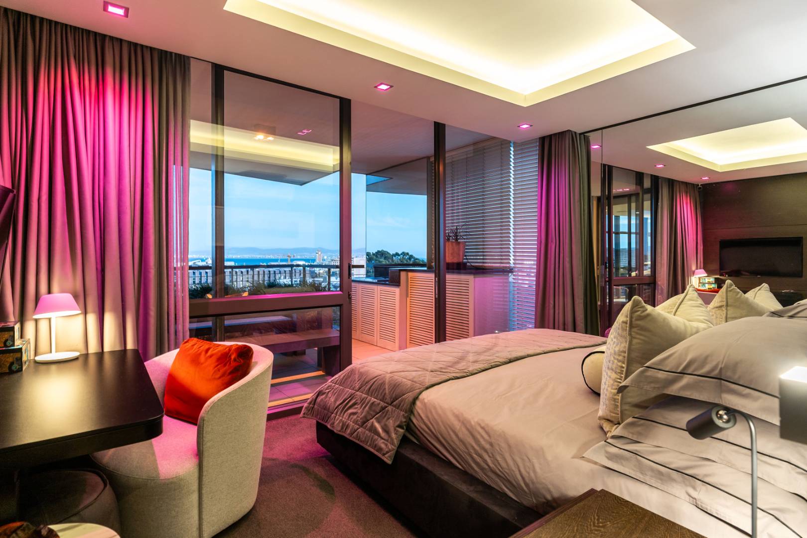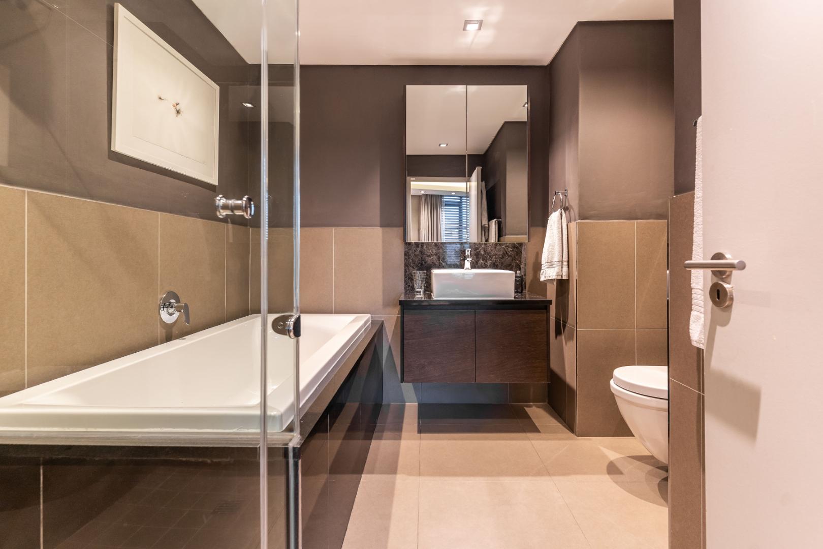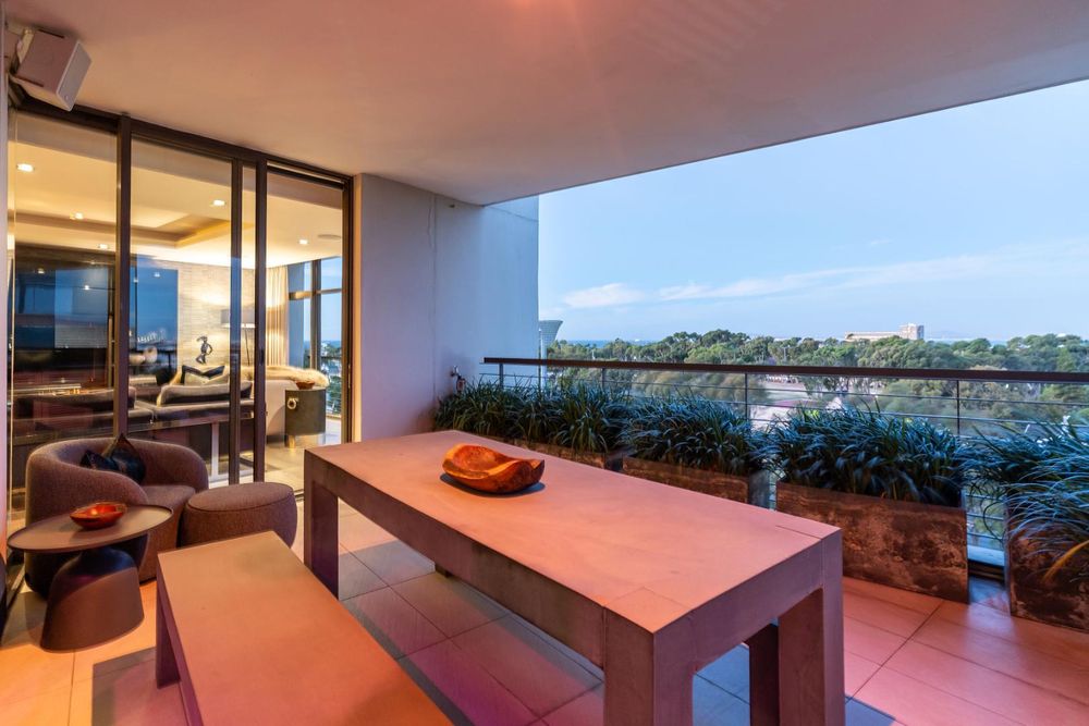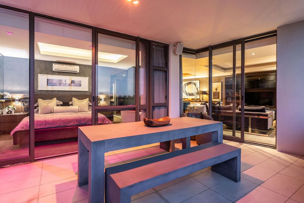 The smart apartment is equipped with a fully integrated smart home system, including fibre connectivity, strong Wi-Fi, and a Denon HEOS sound system for indoor and outdoor enjoyment. A full inverter system, intelligent lighting, and geyser control provide energy efficiency and peace of mind during loadshedding.