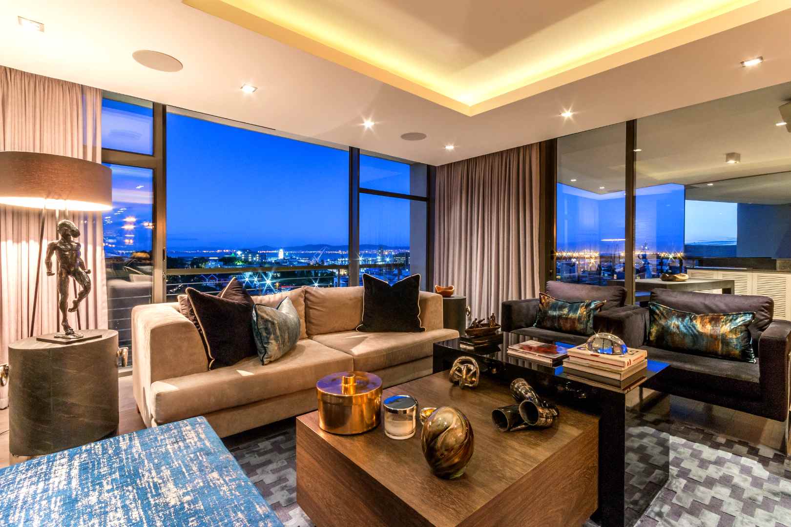 The open-plan living space flows naturally from the lounge into the dining area and modern kitchen, making it equally suited to everyday living and entertaining. The lounge is positioned to take full advantage of views over the V&A Waterfront and Cape Town Stadium, with sliding doors opening onto a large patio with built-in braai, ideal for indoor-outdoor living.