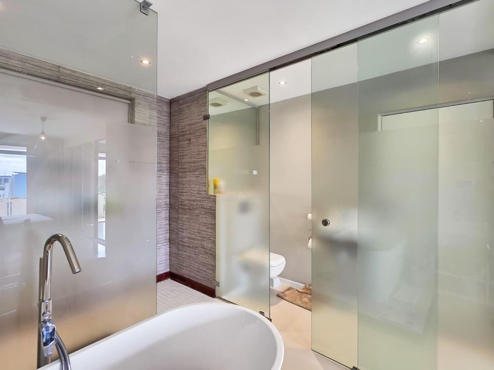 The lavish main bedroom is a true retreat, featuring mirrored cupboard doors that enhance the sense of space in this generous 92-square-meter apartment. Bedside tables to remain. The open ensuite bathroom boasts a larger shower, with a cleverly tucked-away toilet that doubles as a guest loo, showcasing exceptional design flexibility.