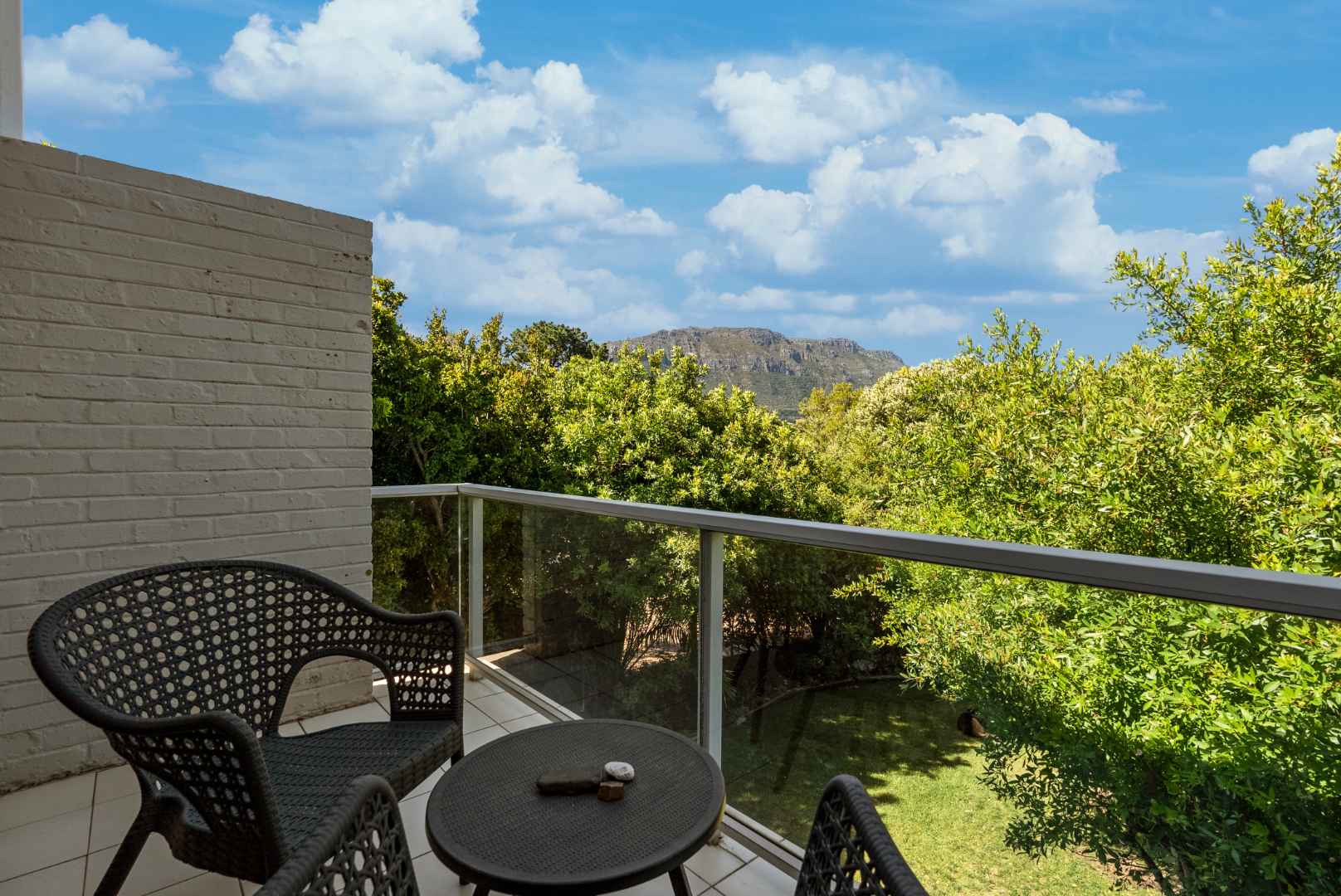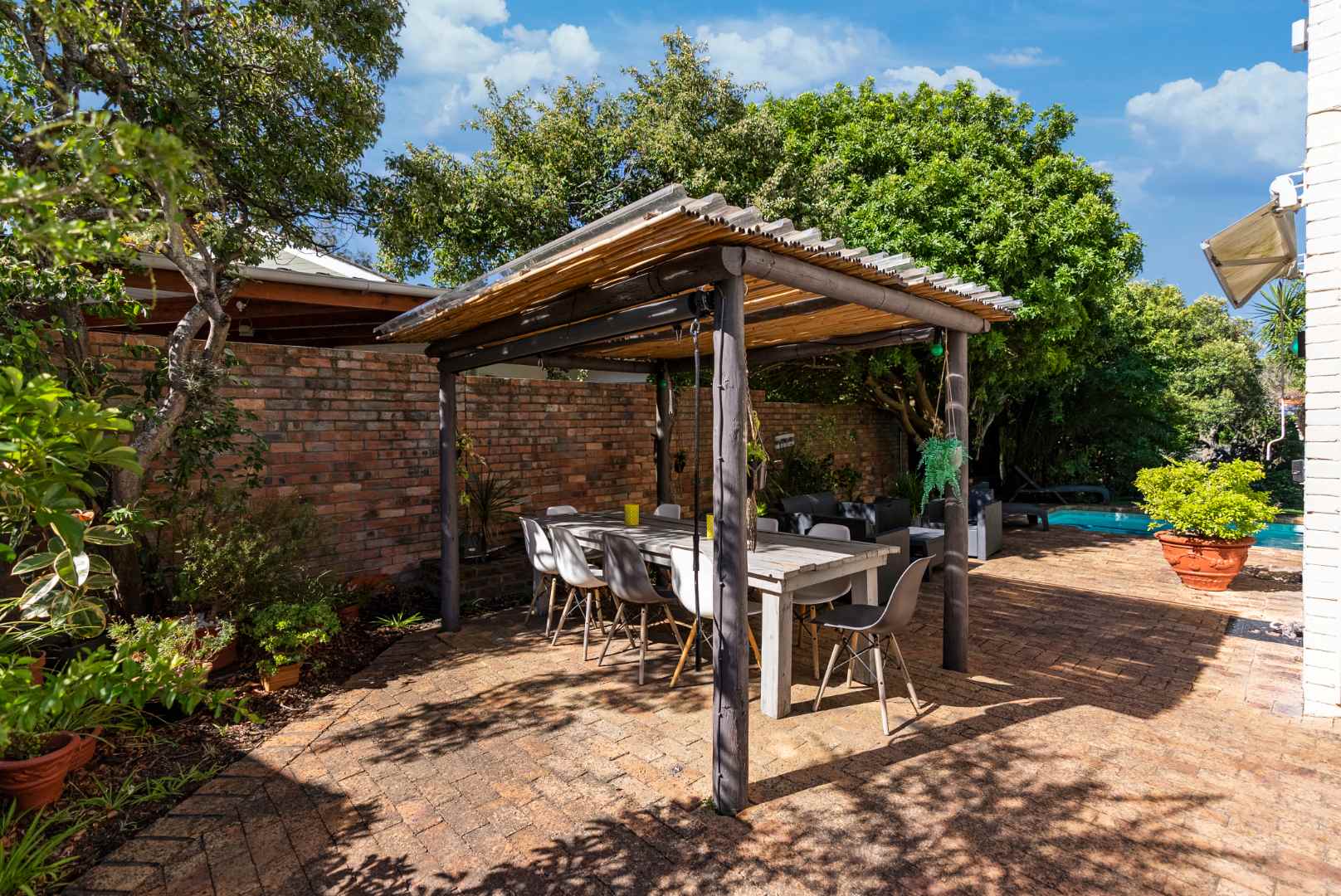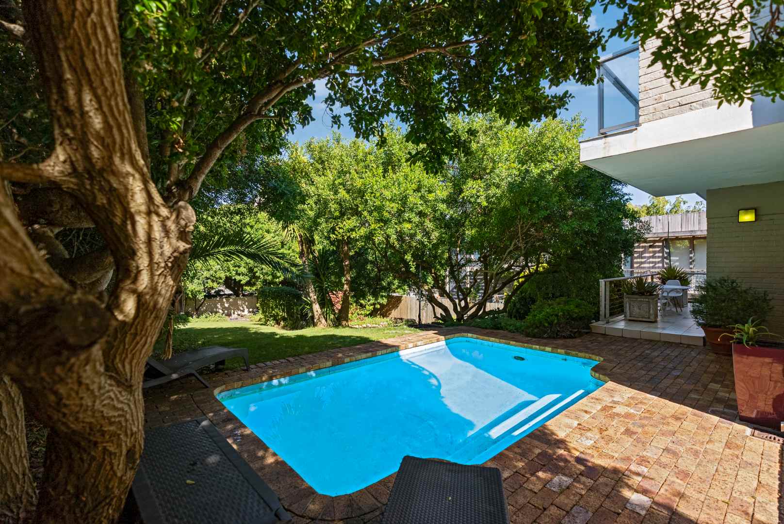 Step into this comfortable and compact home tucked at the back of its plot. A sparkling pool, lush lawn, and leafy green outlook make it your private oasis with mountains as your backdrop.
