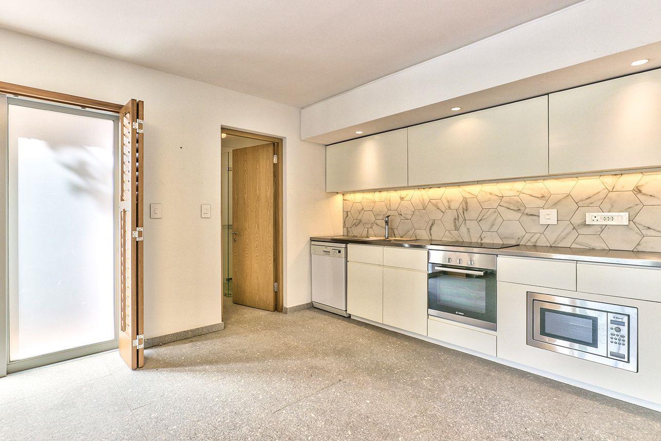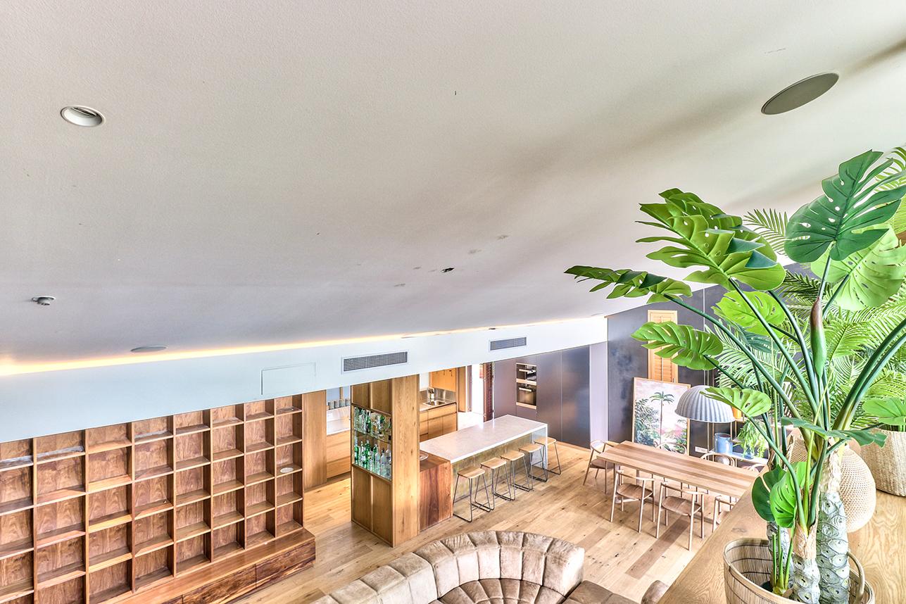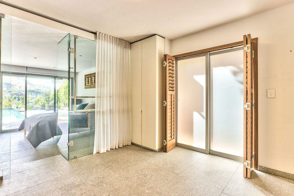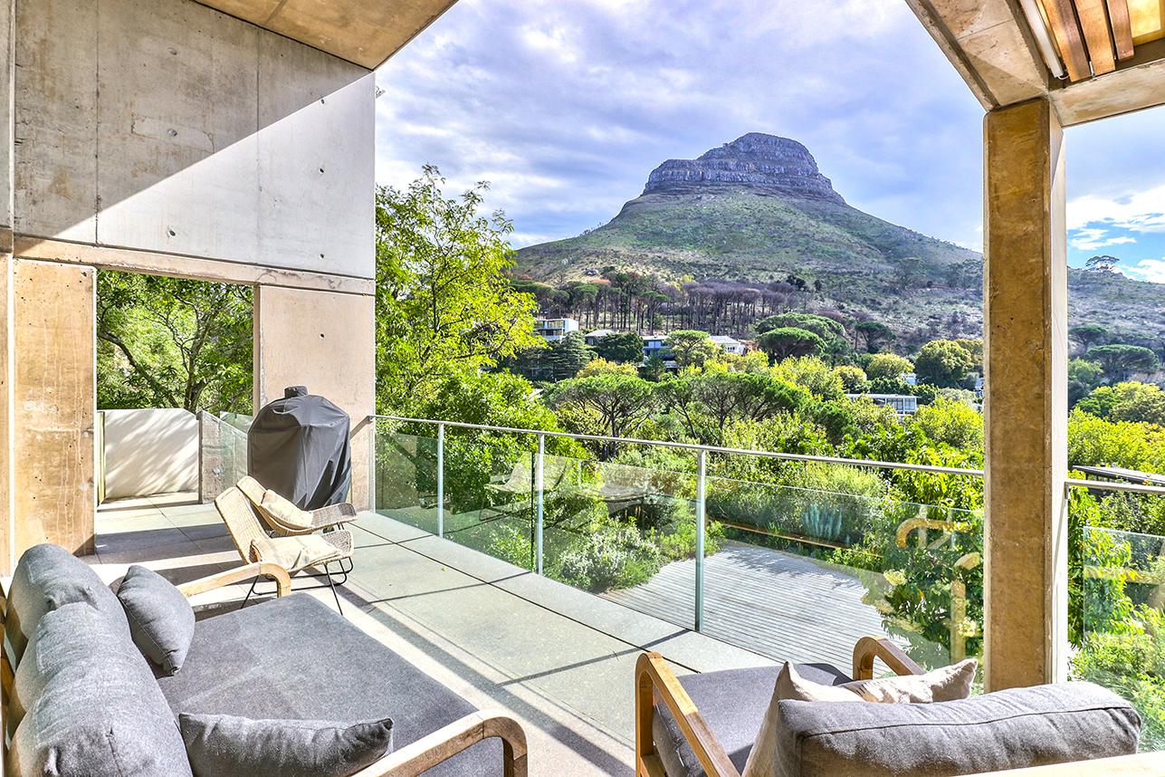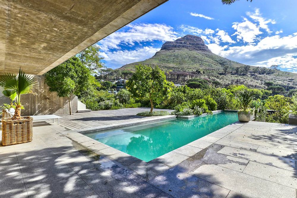 On the entry level, there's a sizable guest flat with a bedroom, lounge/dining area, galley kitchen, and bathroom. This level also includes an entertainment room with a playroom or studio. Outside, a large pool patio area overlooks Lion’s Head and is surrounded by lush greenery.