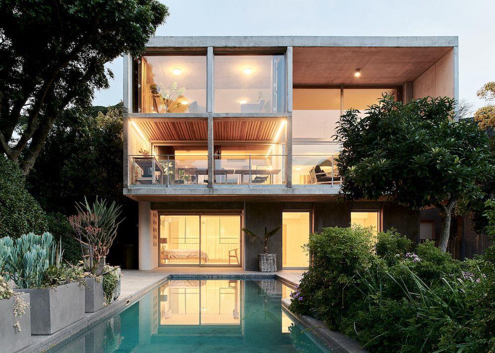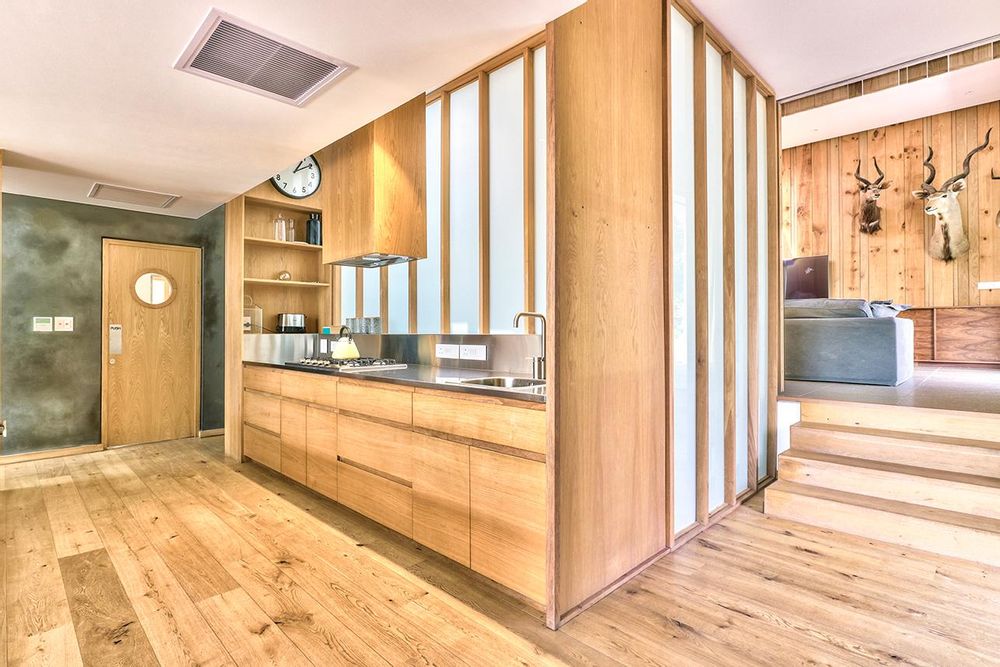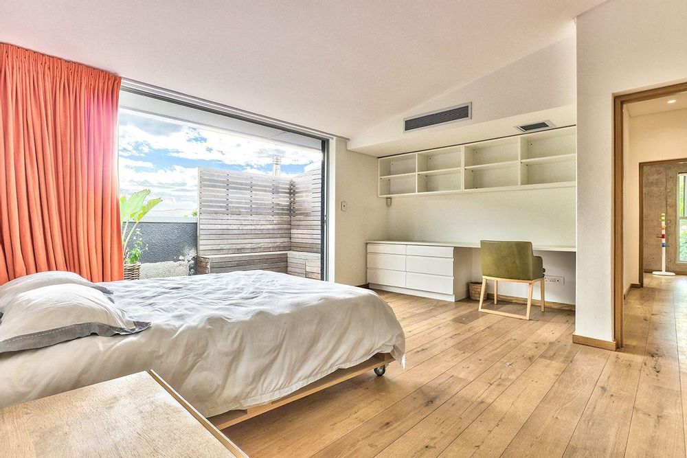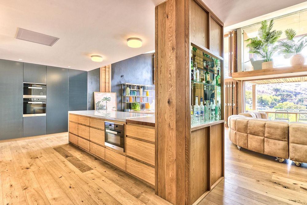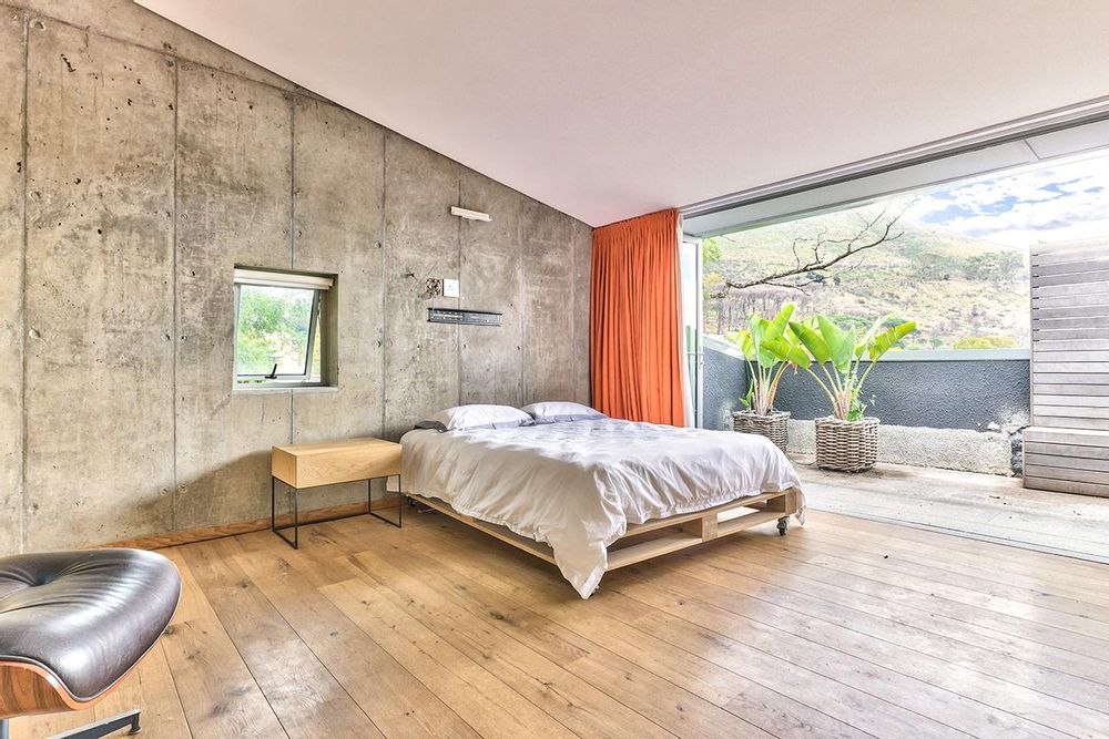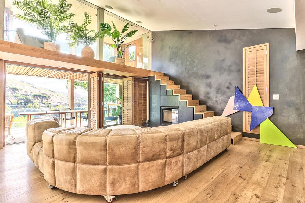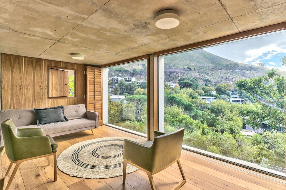 This home in Higgovale, near Table Mountain Nature Reserve, was redesigned by Daniel Maggs Architects in 2018. It features stunning views of Table Mountain, Lion’s Head, and lush surroundings. Inside, the house has a warm and welcoming feel with a blend of wood, cement, and stone, complemented by high ceilings and dark walls.