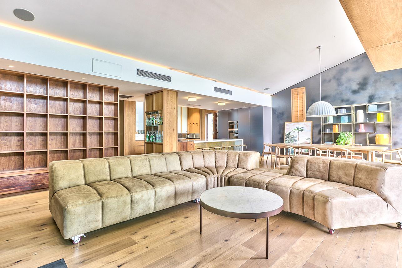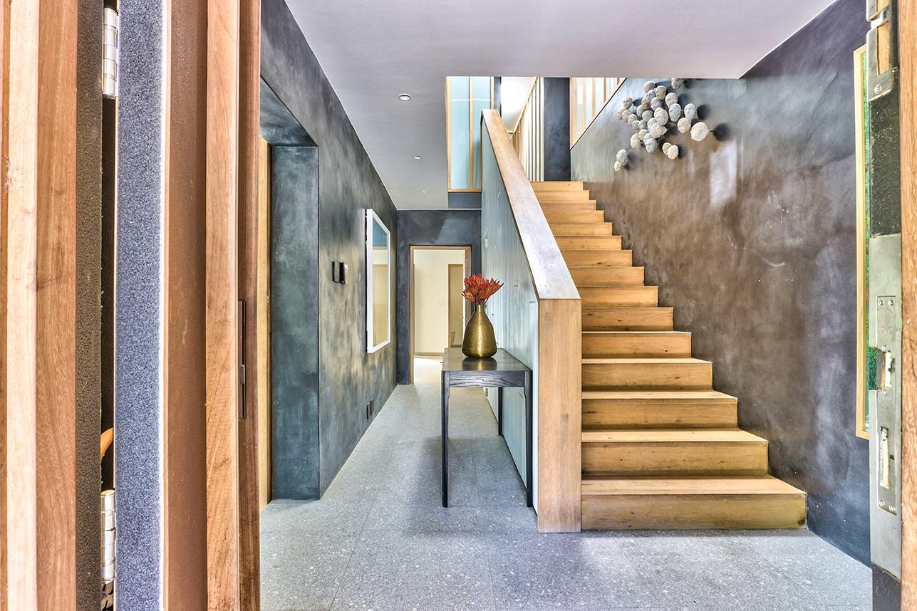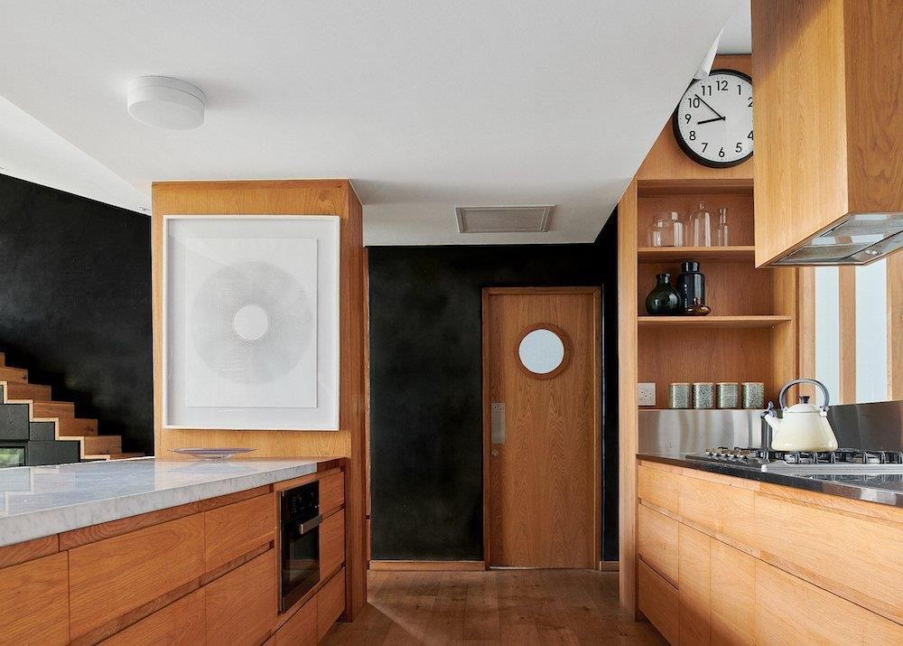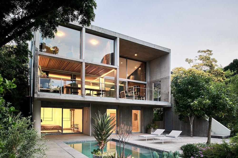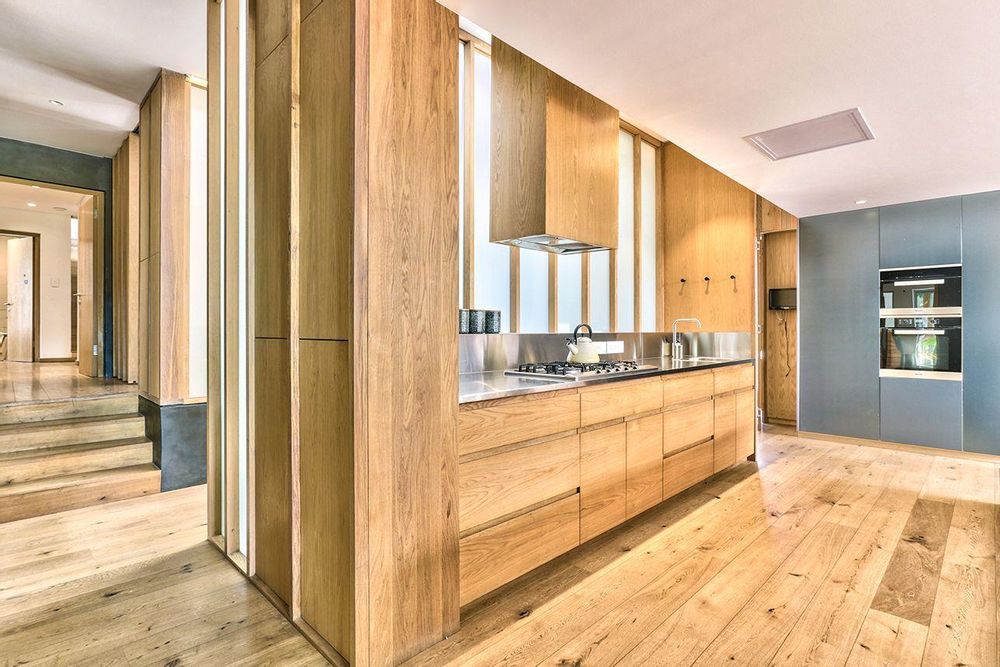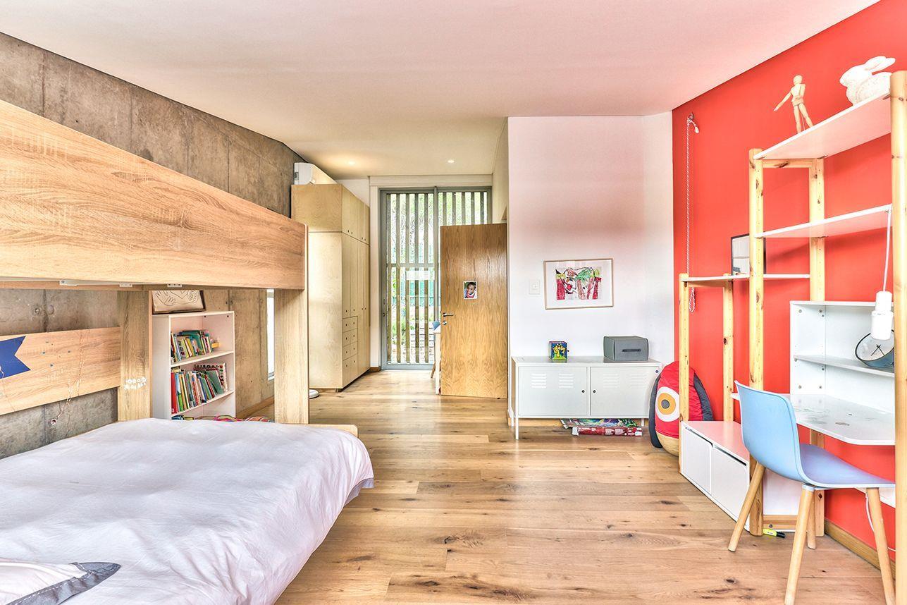 This home in Higgovale, near Table Mountain Nature Reserve, was redesigned by Daniel Maggs Architects in 2018. It features stunning views of Table Mountain, Lion’s Head, and lush surroundings. Inside, the house has a warm and welcoming feel with a blend of wood, cement, and stone, complemented by high ceilings and dark walls.