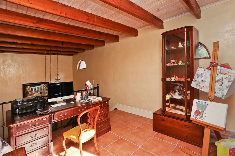 Downstairs, the guest bedroom features its own en-suite bathroom and offers direct access to a beautifully landscaped garden, creating a private retreat for visitors. The ground level also houses a large kitchen and scullery, perfectly positioned to overlook the dining area, making it an ideal space for both intimate family meals and grand entertaining.