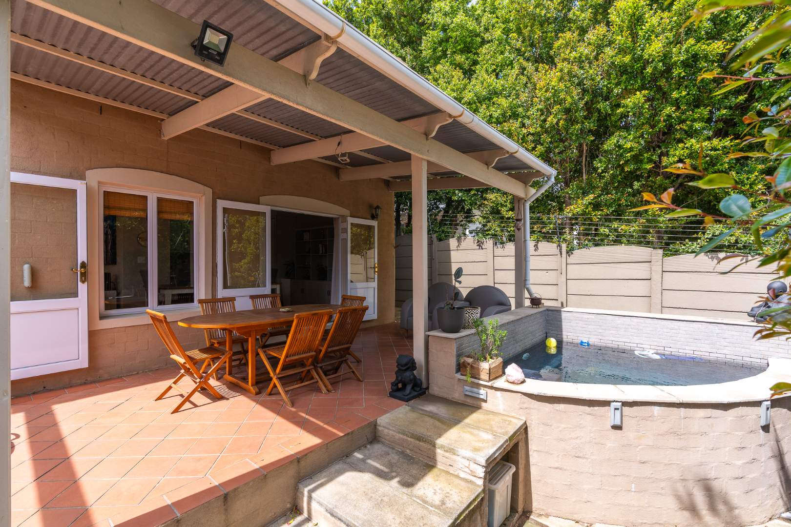 Step through the French doors onto a large, private covered entertainment porch. Here, you'll find a fire pit/braai area and a refreshing dipping pool, perfect for enjoying the great indoor-outdoor living that this property offers. Surrounded by lush greenery and complete privacy, this tranquil space is ideal for both relaxing and hosting guests in style.