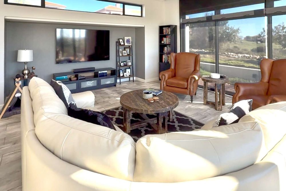 The dining and living areas are separated by a built-in gas heater island that efficiently warms the entire space. Stackable sliding doors open to provide direct access to the wooden deck and barbecue area outside. This space is designed with socializing in mind, perfect for both day and night entertaining.