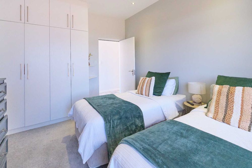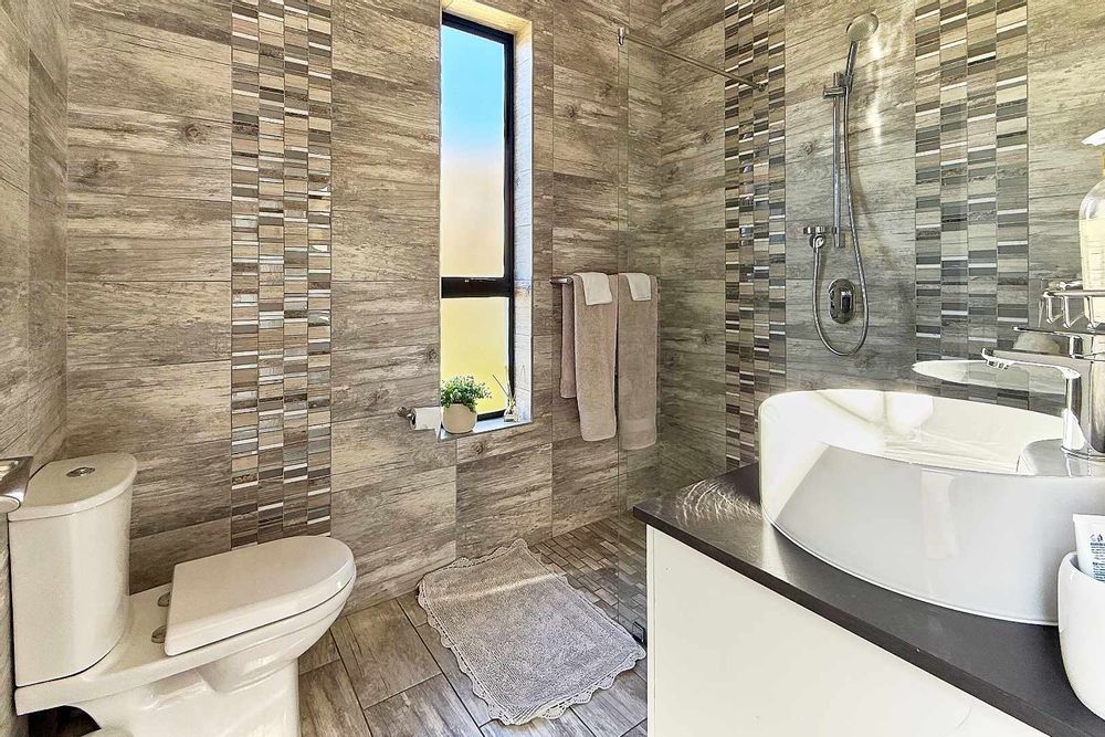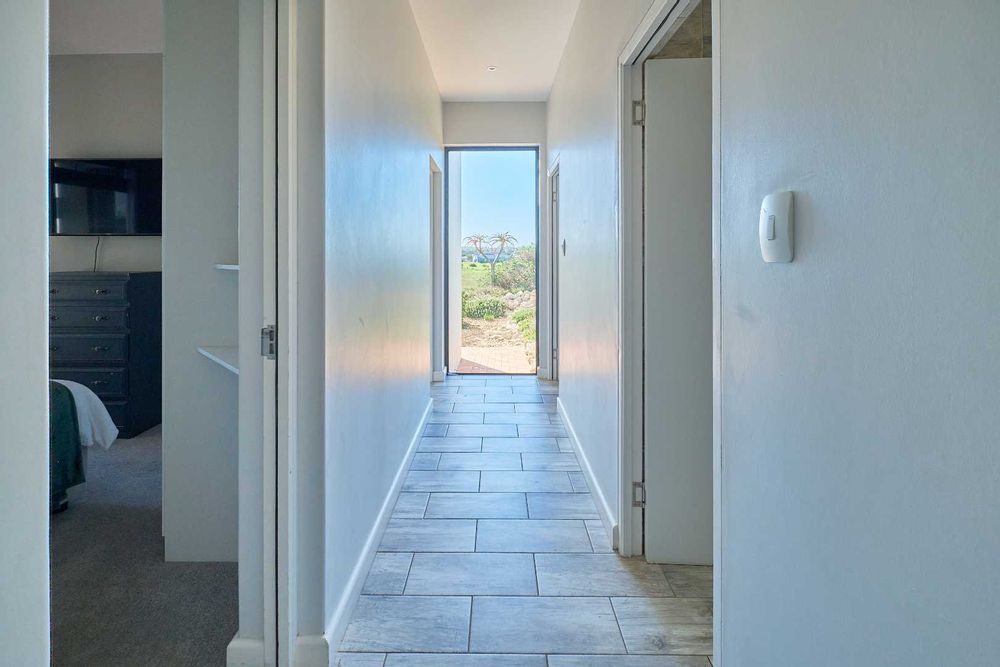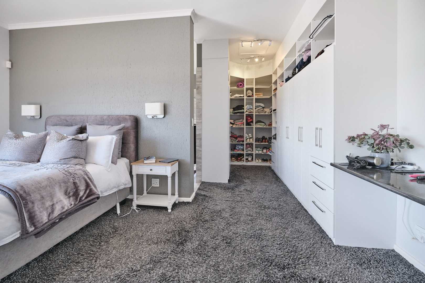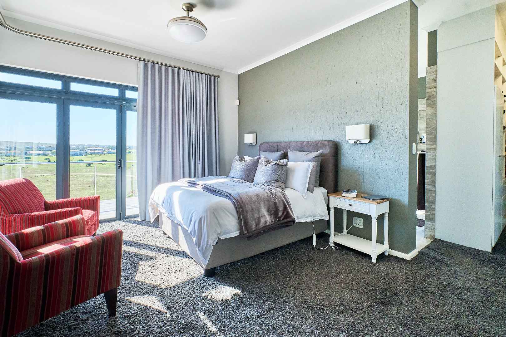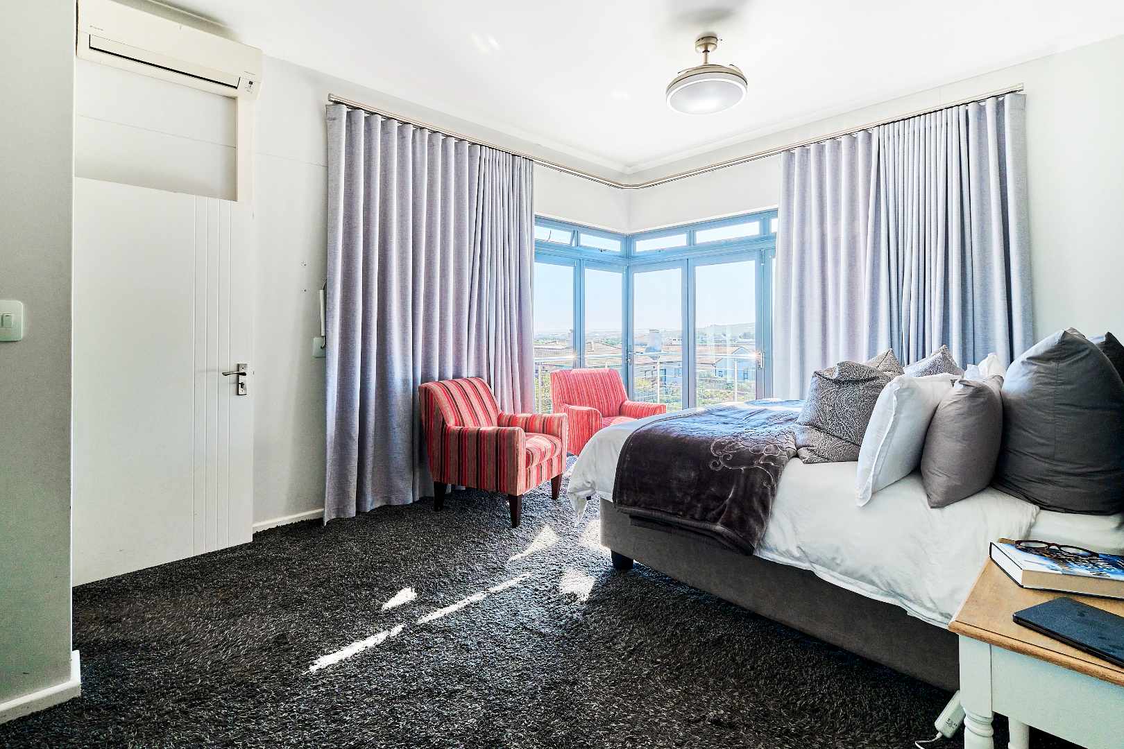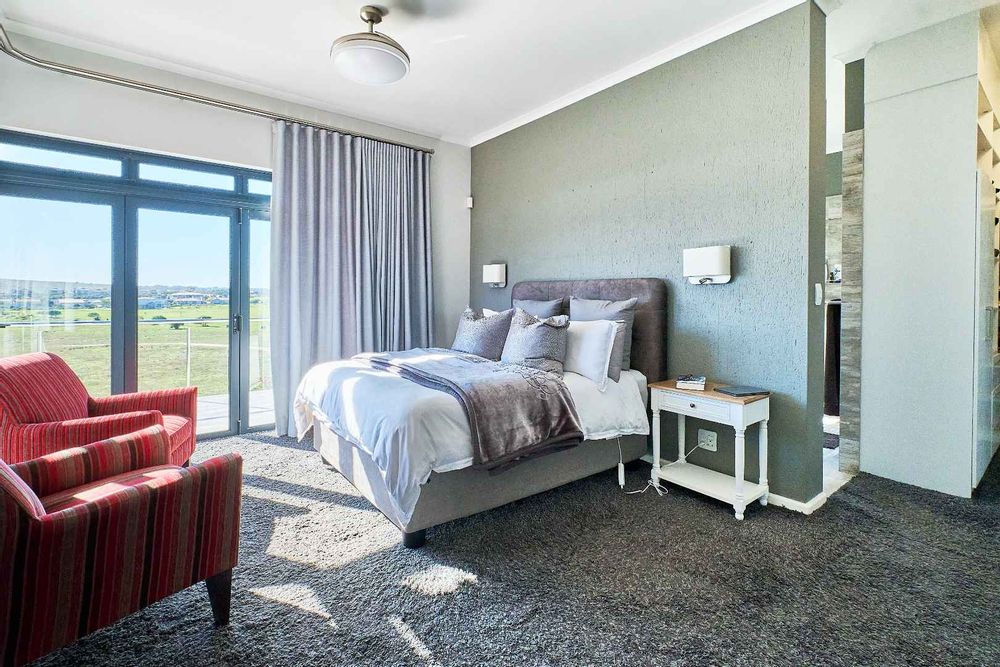 Upstairs houses the airconditioned main en suite bedroom, an office, and a wrap-around balcony offering stunning sea views on one side and views of West Coast fynbos veld and the driving range on the other. The main bedroom is elegantly decorated with plush carpets and rich curtain fabrics, creating a cozy luxurious haven. Stackable sliding doors open completely to reveal breathtaking views. The spacious walk-in wardrobe complements this abundant space.