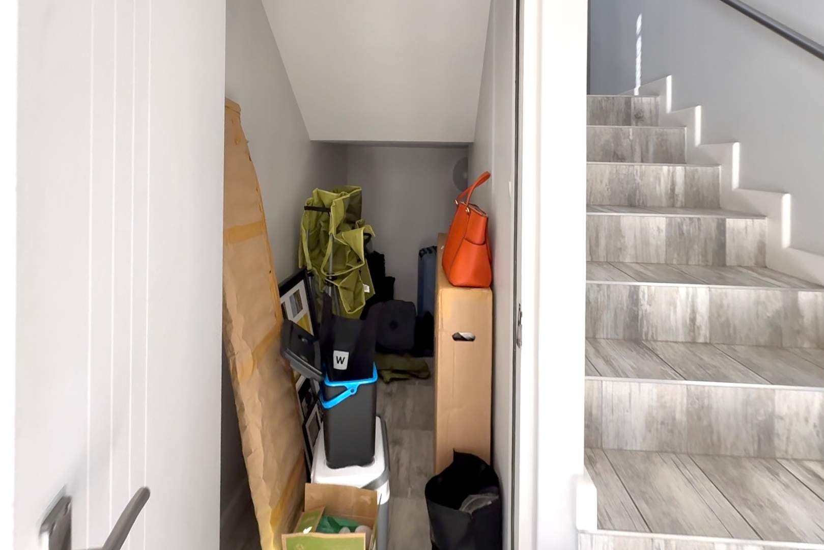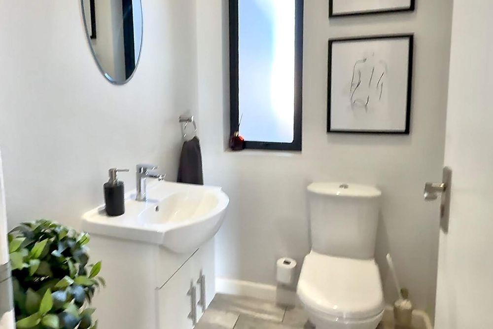 The downstairs hallway leads to two carpeted bedrooms with ample wardrobe space and direct access to the wooden deck and garden. Each contemporary-designed bathroom offers a toilet, basin on floating vanity, and spacious shower with vertical windows for maximum light. Close to the entrance is the guest loo and additional storage space under the staircase.