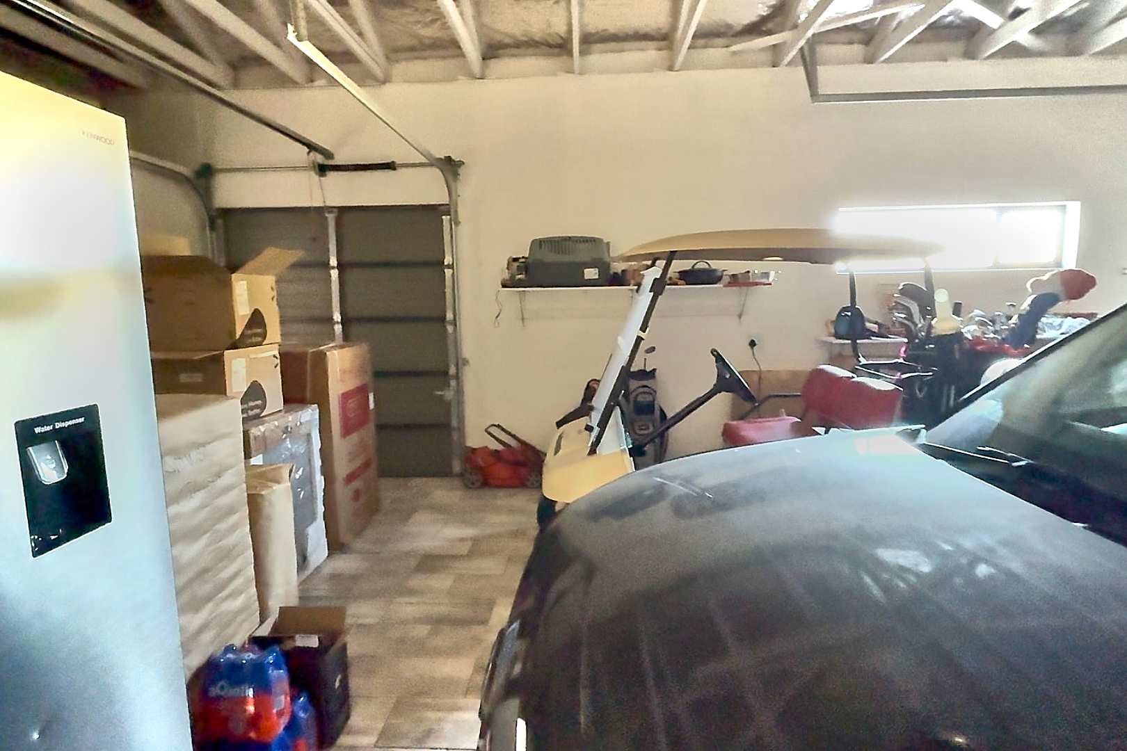 The large double garage provides more than enough space for two cars with a single roll-up door controlled via remote control. Additionally, there's a small side roll-up door for golf cart access. The property is equipped with 12 solar panels and battery backup to ensure electricity during load shedding.