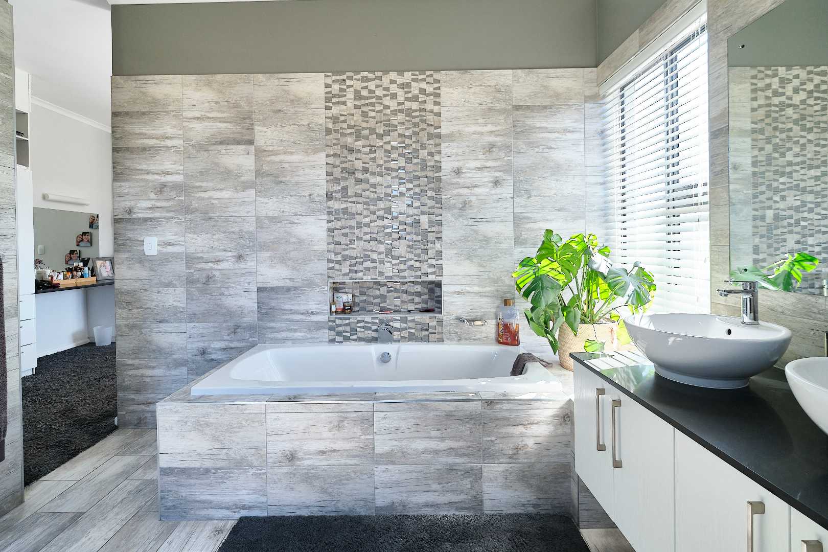 The main bathroom's contemporary design flows seamlessly from the bedroom. It features a built-in Giberet cistern toilet, his-and-hers basins in a floating double vanity with mirrors, and an extra-sized bath strategically placed for soaking up stunning countryside views. The landing at the top of the staircase hosts an office equipped with ample cupboards and plug points.