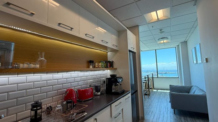 Elevate your business in Cape Town CBD with panoramic harbour and mountain views from Portside Tower; move-in-ready 203m² office with glass-partitioned boardroom, kitchenette, and allocated parking.