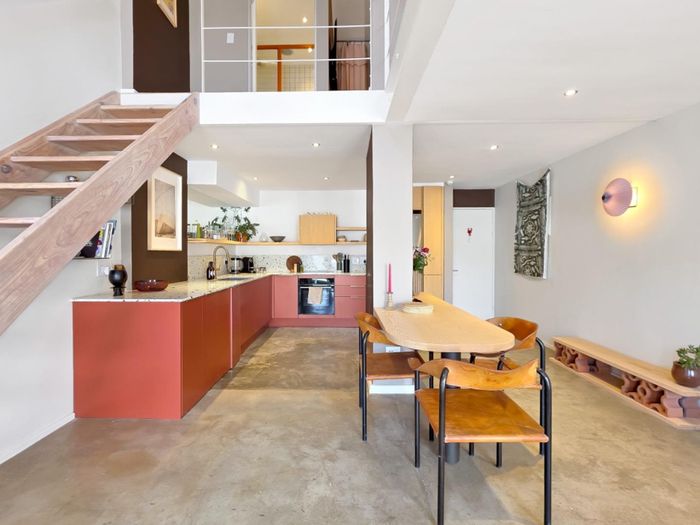 Live vibrant city life between Loop and Bree Streets, steps from Bree and Kloof's eateries. Loft-style apartment with mezzanine bedroom, terrazzo counters, balcony views of Table Mountain and Lion's Head.