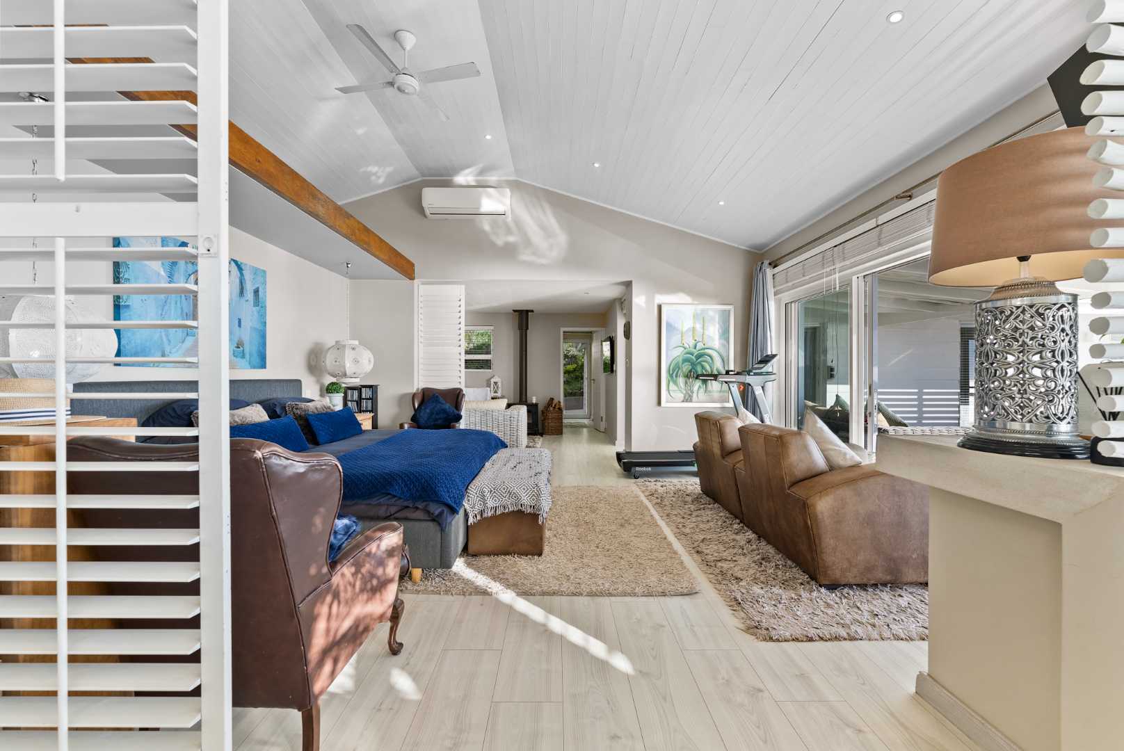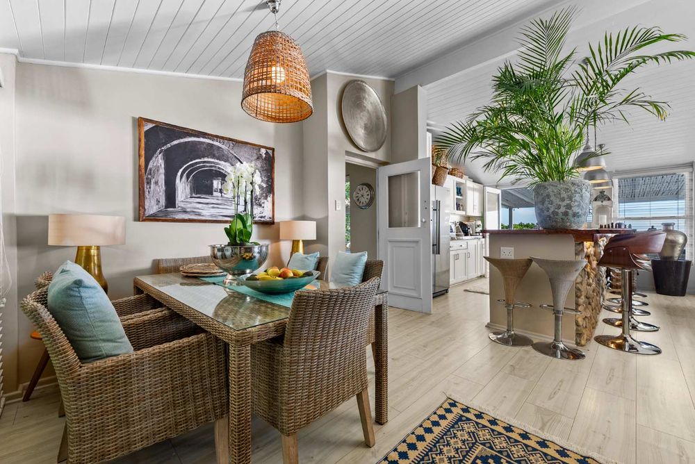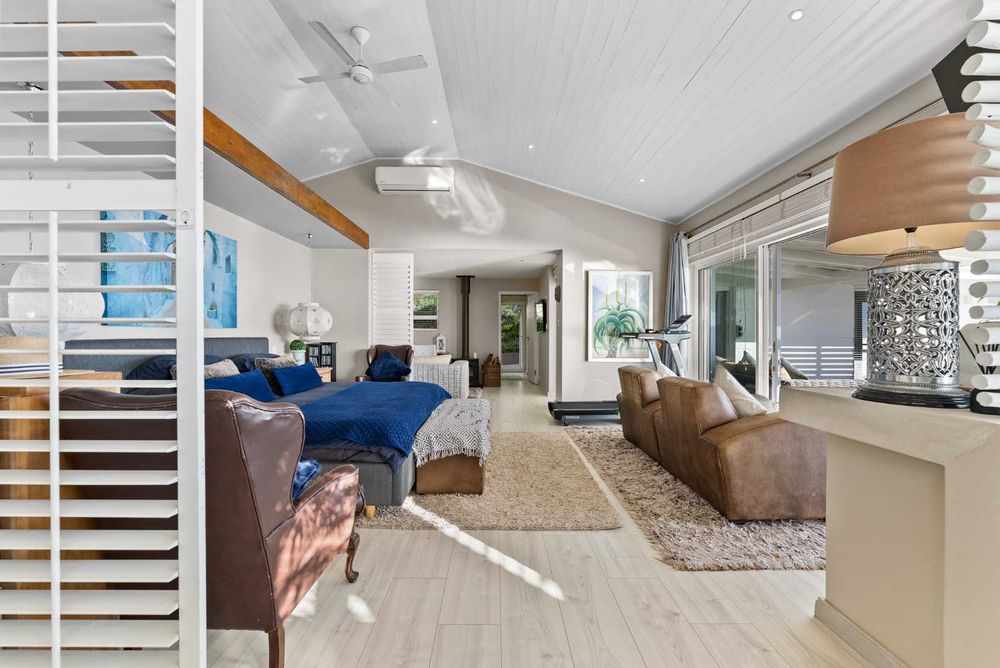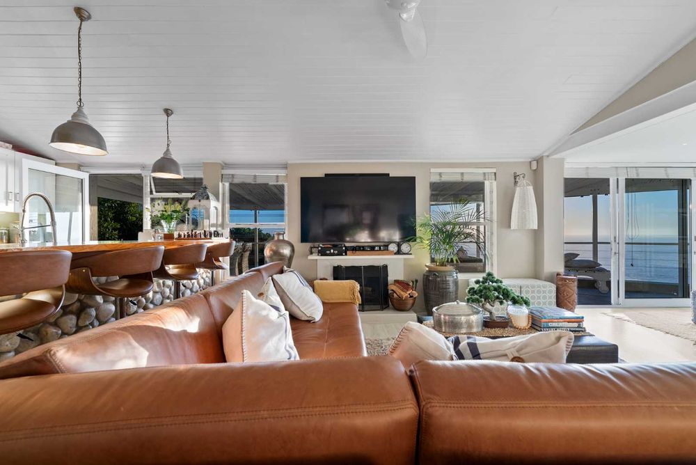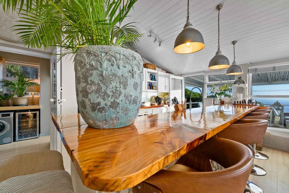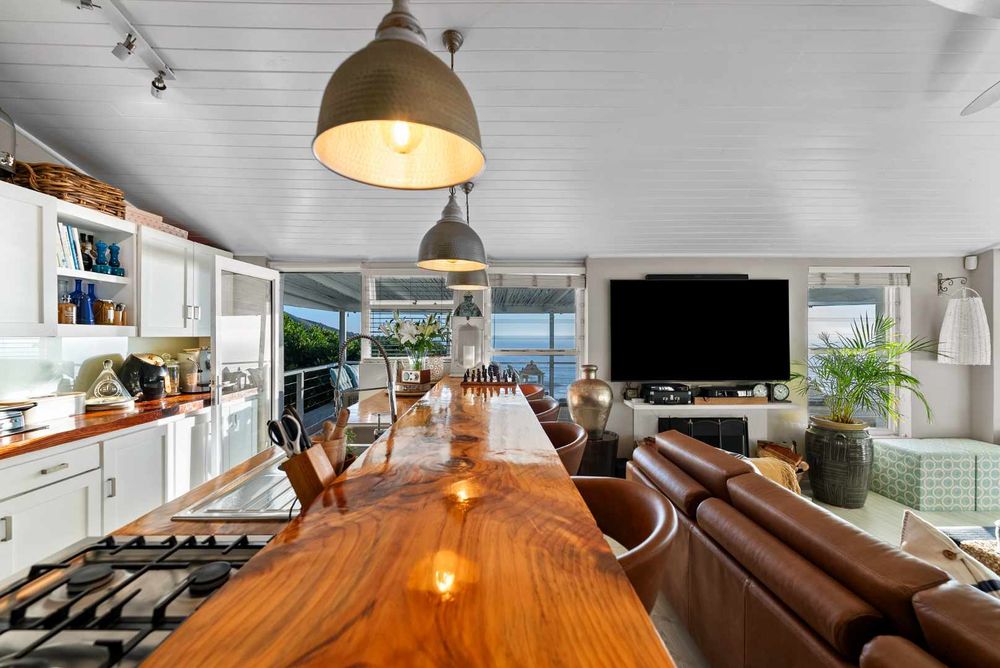 The main house is arranged on one level for ease of flow. Open-plan living areas include a fireplace, dining space, and a designer kitchen with separate scullery, all leading to a wraparound deck—ideal for outdoor dining or sunset drinks.