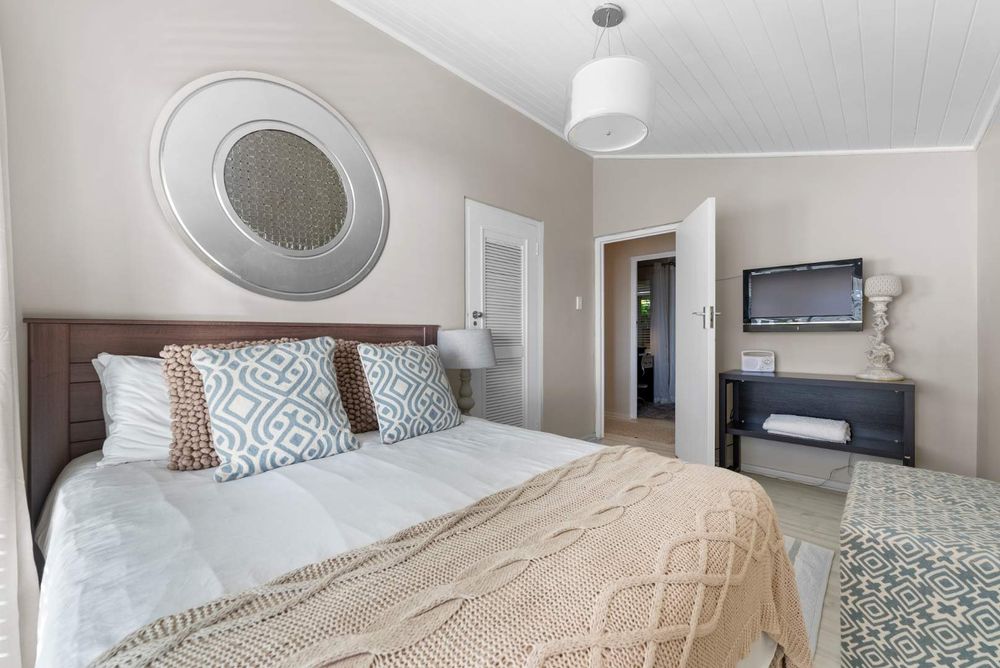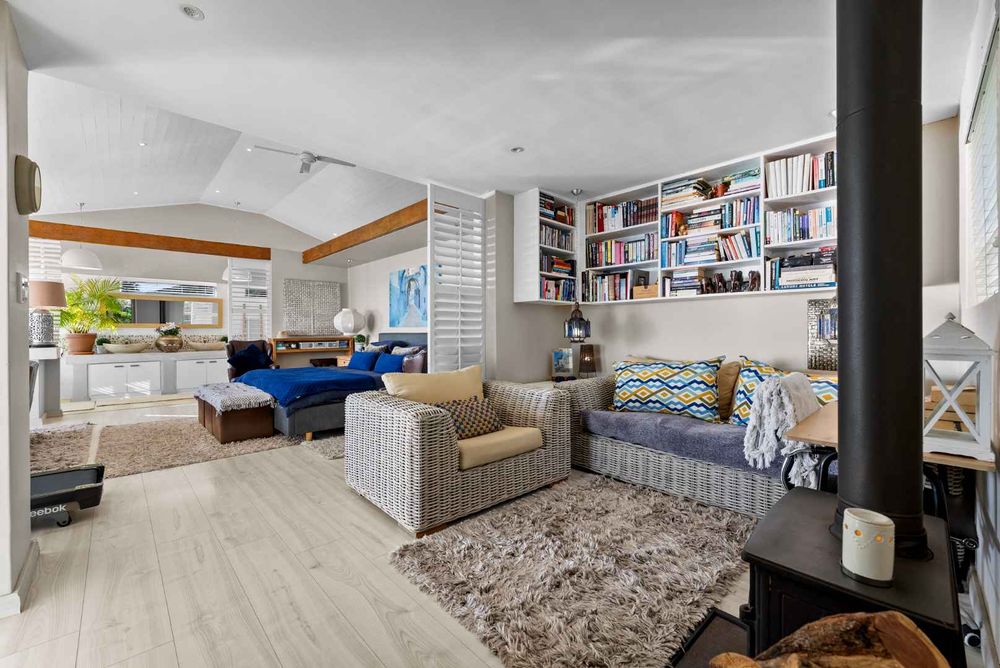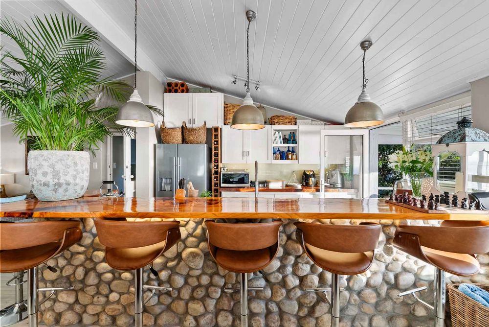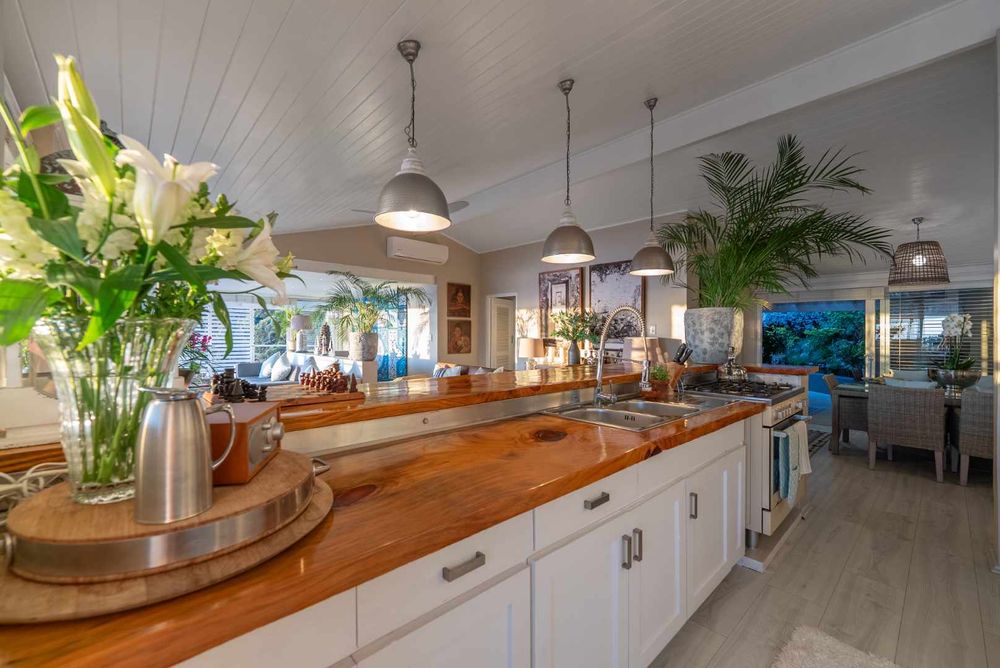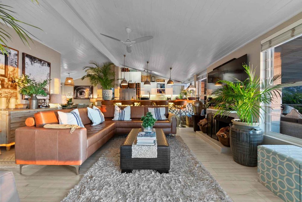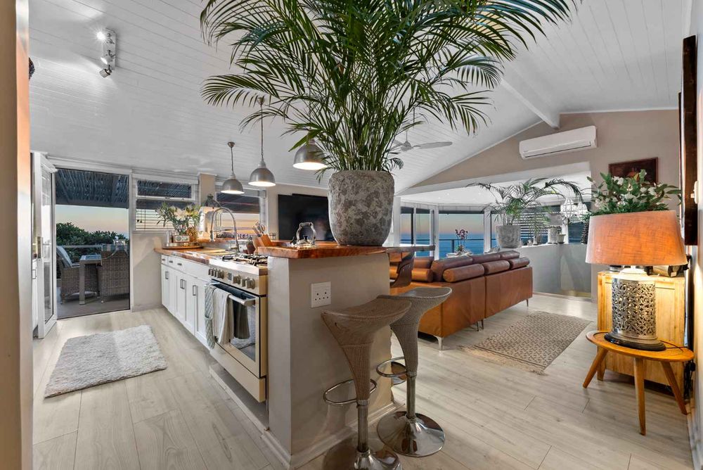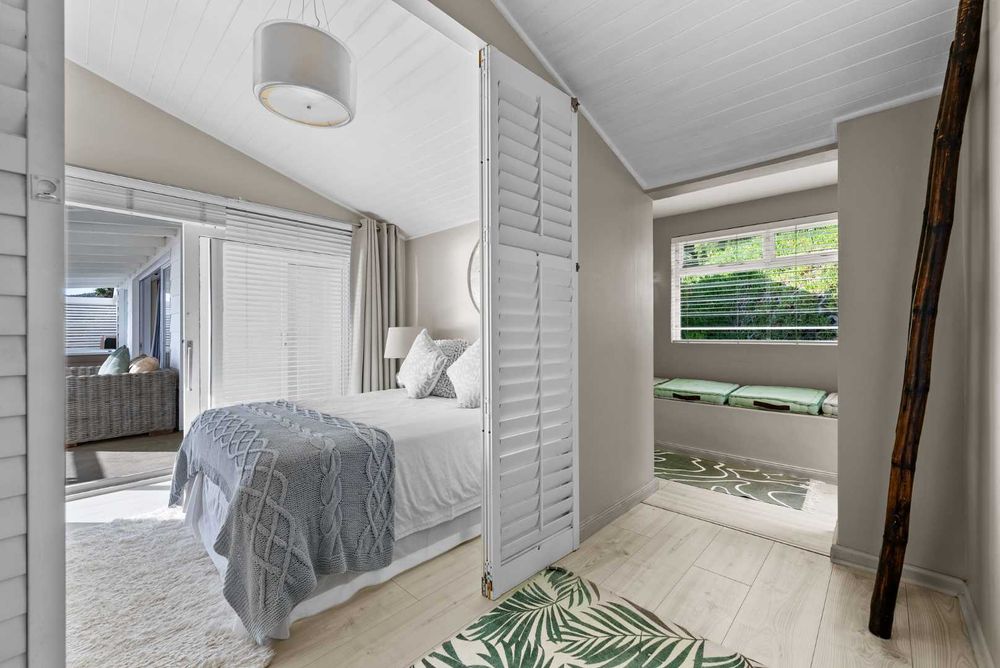 The main house is arranged on one level for ease of flow. Open-plan living areas include a fireplace, dining space, and a designer kitchen with separate scullery, all leading to a wraparound deck—ideal for outdoor dining or sunset drinks.