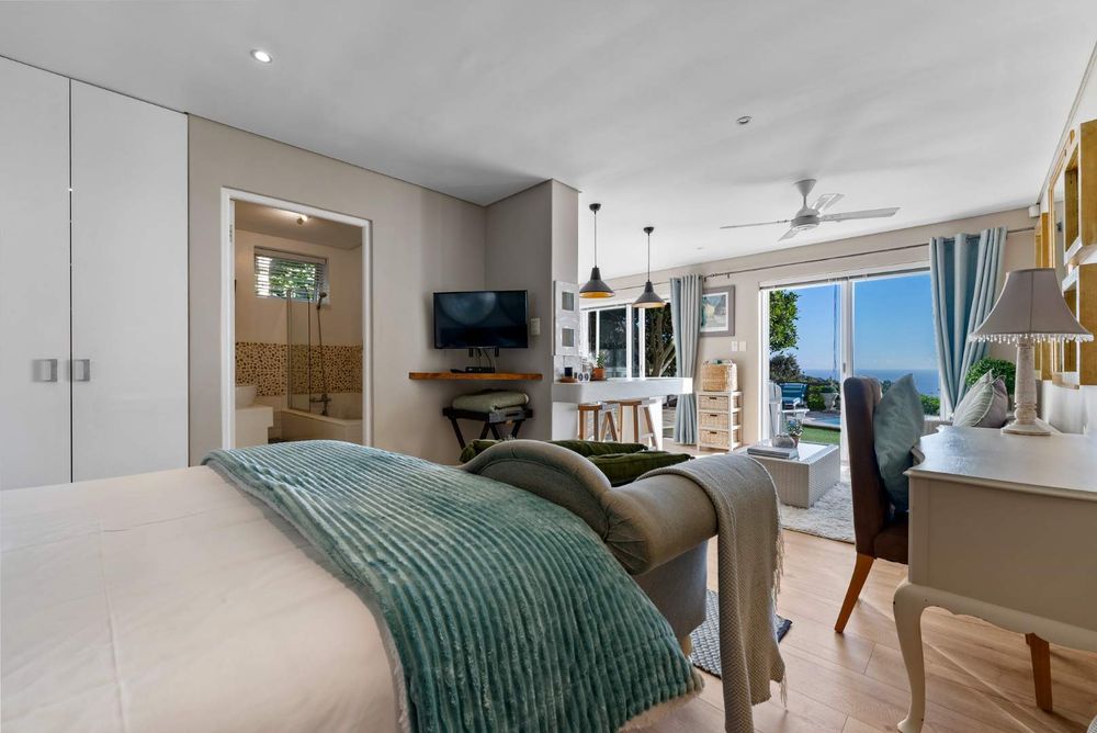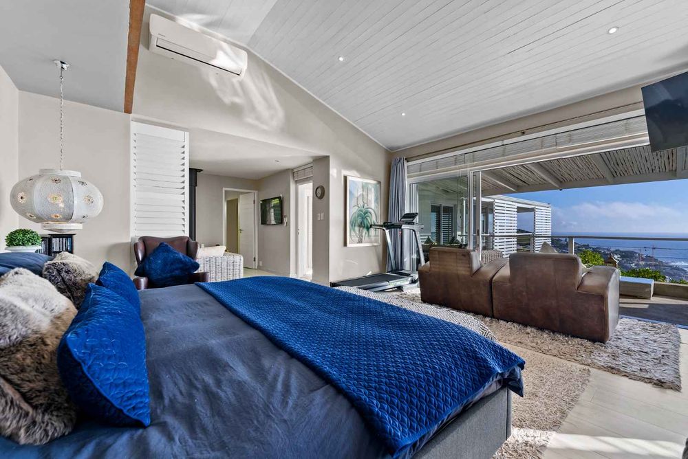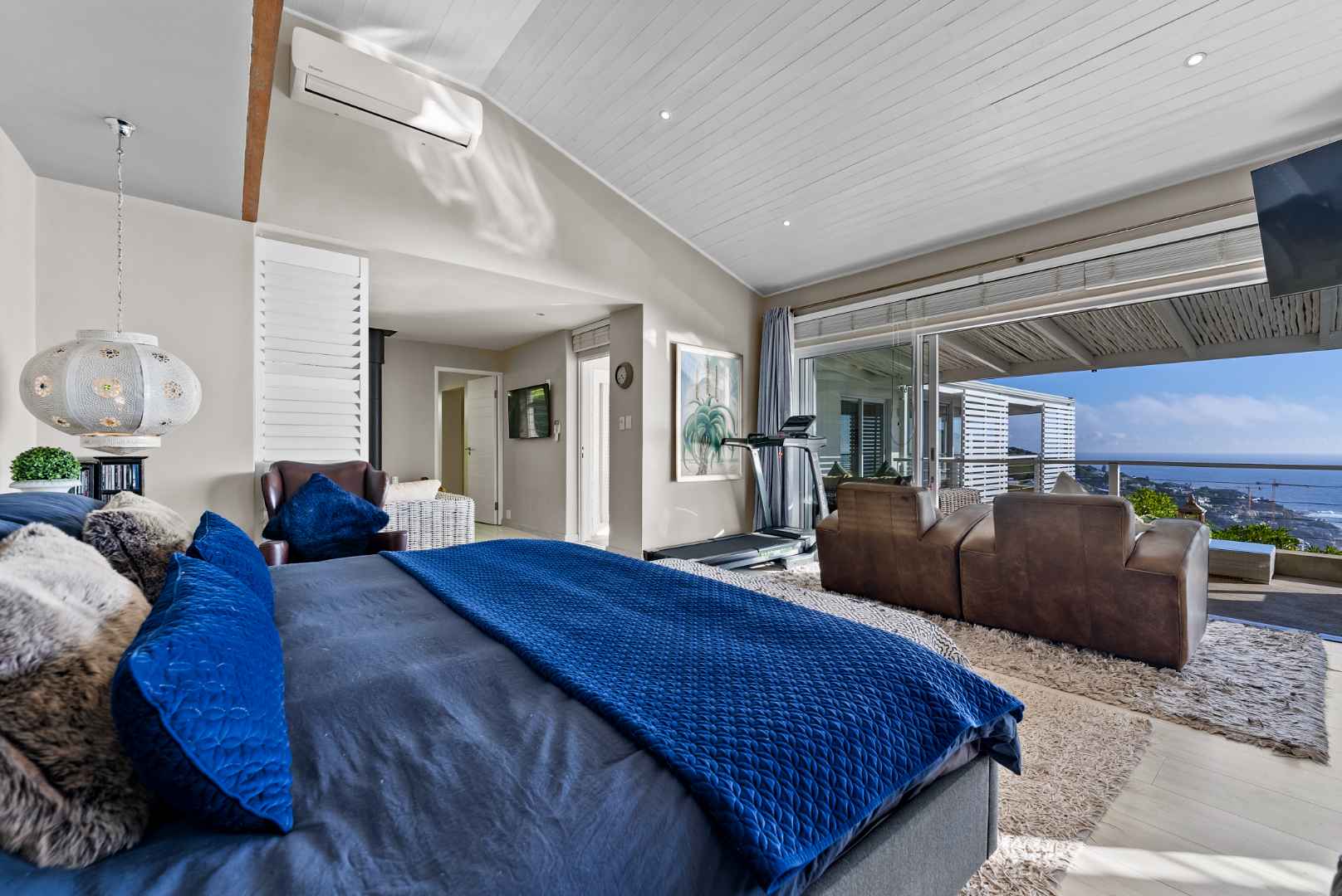 The master suite includes a spacious bedroom with fireplace and lounge area, an open-plan bathroom with double vanity, walk-in glass shower, and freestanding bath. Doors open to a private terrace with Jacuzzi and sea views. Additional bedrooms and bathrooms also open directly onto terraces, while a quiet study area and sheltered braai patio extend the living options.